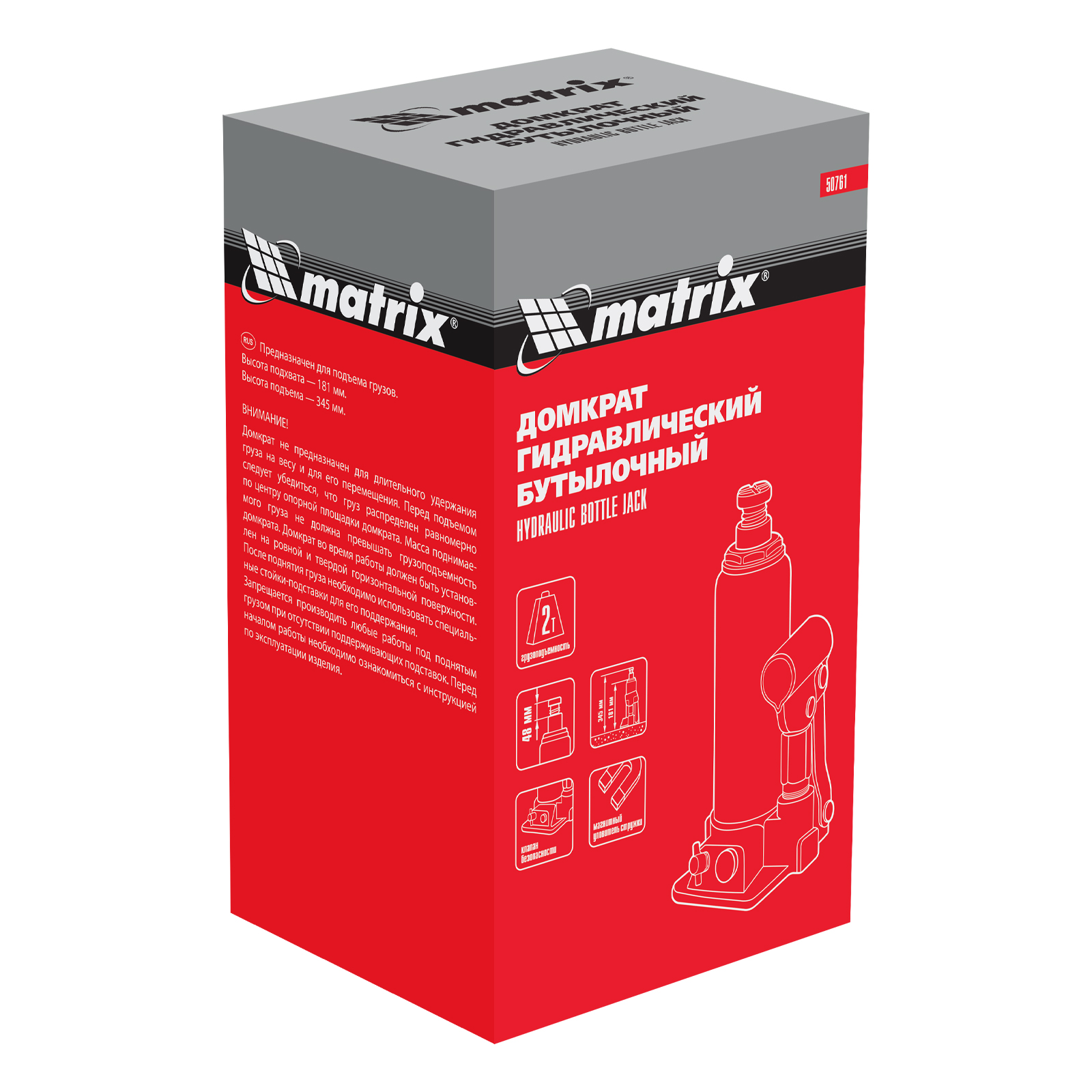 Гидравлический бутылочный домкрат Matrix 50761 предназначен для быстрого поднятия грузов массой до 2 т на высоту 181-345 мм. Будет полезен автолюбителям и мастерам СТО в качестве полупрофессионального инструмента. Встроенный магнитный уловитель металлической стружки защищает резиновые уплотнители от повреждений.