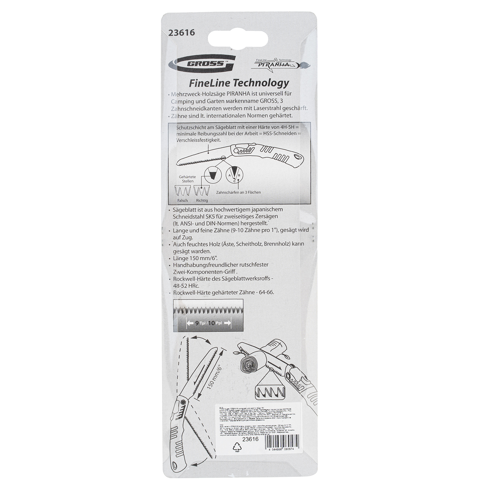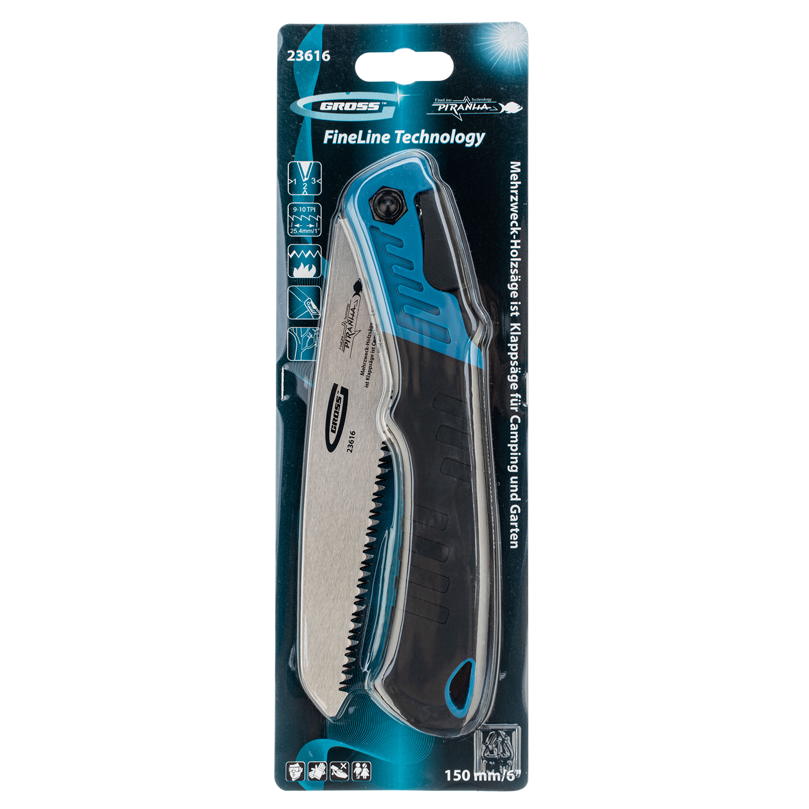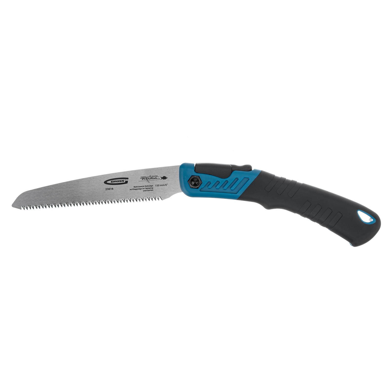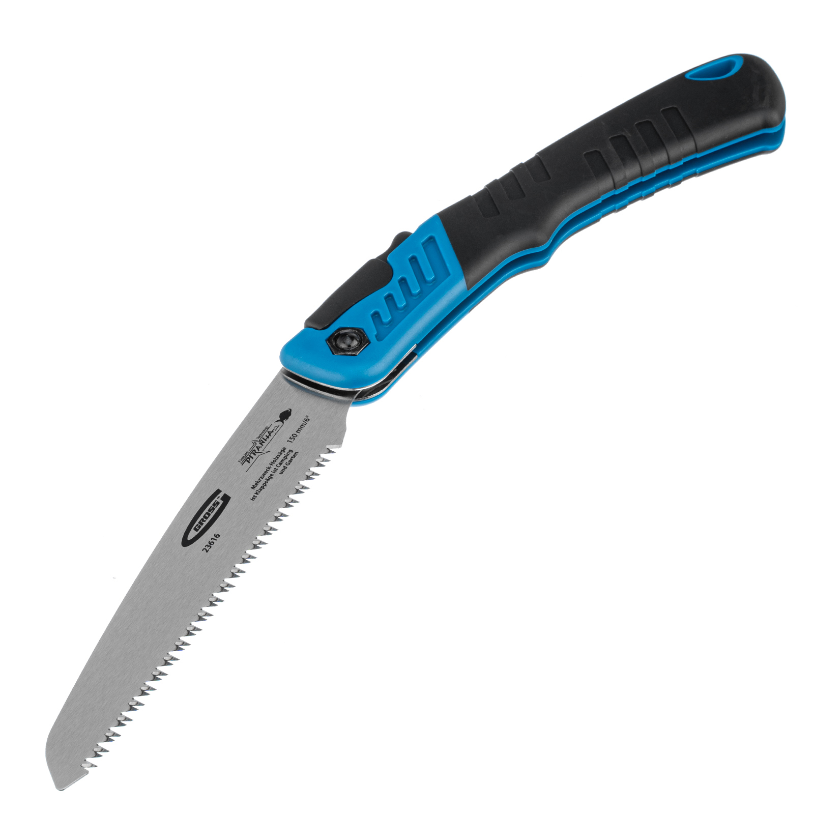 Складная пила по дереву Gross PIRANHA 23616 для кемпинга и сада с 2-компонентной рукояткой, полотном длиной 150 мм, подкаленными зубьями с шагом 9-10 TPI и 3D-заточкой, пригодится на пикнике, в походе или на дачном участке. Предназначена для продольной и поперечной распиловки древесины, подходит также для работ с фанерой, ДВП и ПВХ. Характеристики режущей кромки соответствуют требованиям всех международных стандартов: зубья с трехгранной заточкой и шагом 9-10 TPI обеспечивают быстрый и ровный распил. Благодаря складной конструкции пилу очень удобно хранить и брать с собой в поездки.