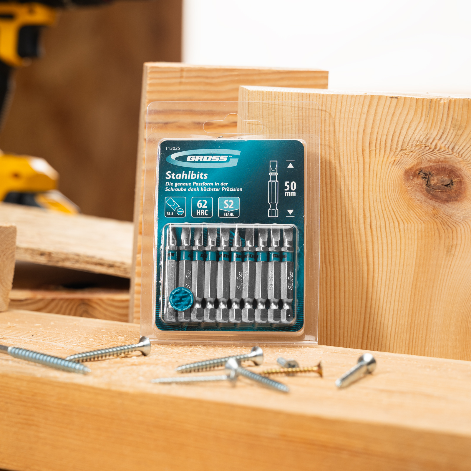 - Износостойкость — биты выполнены из японской легированной стали S2 повышенной прочности, рабочие части закалены до твердости 62 HRC.