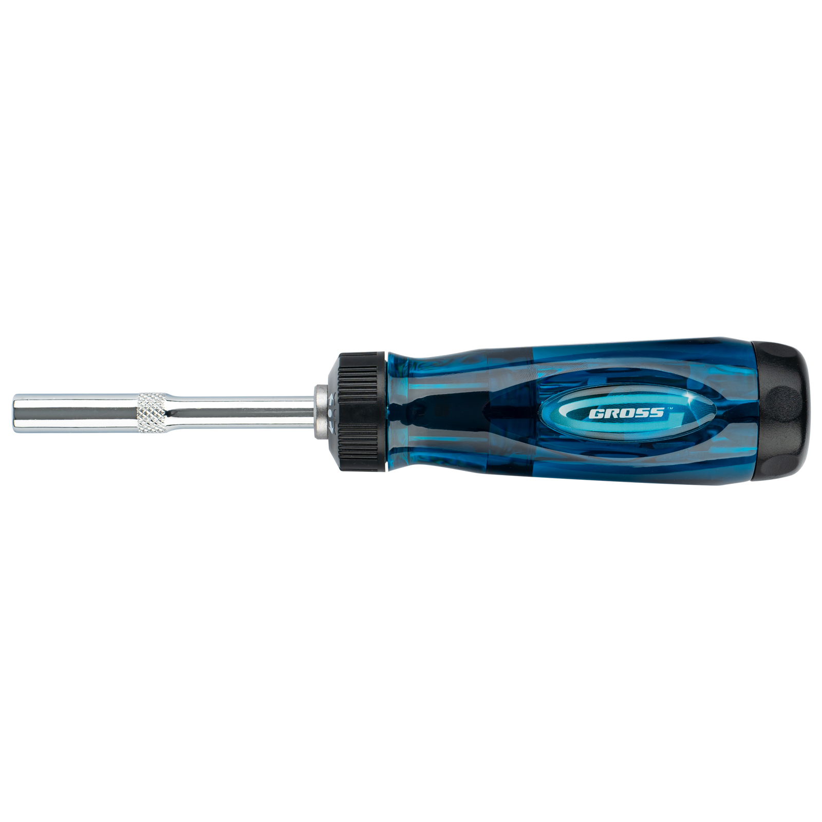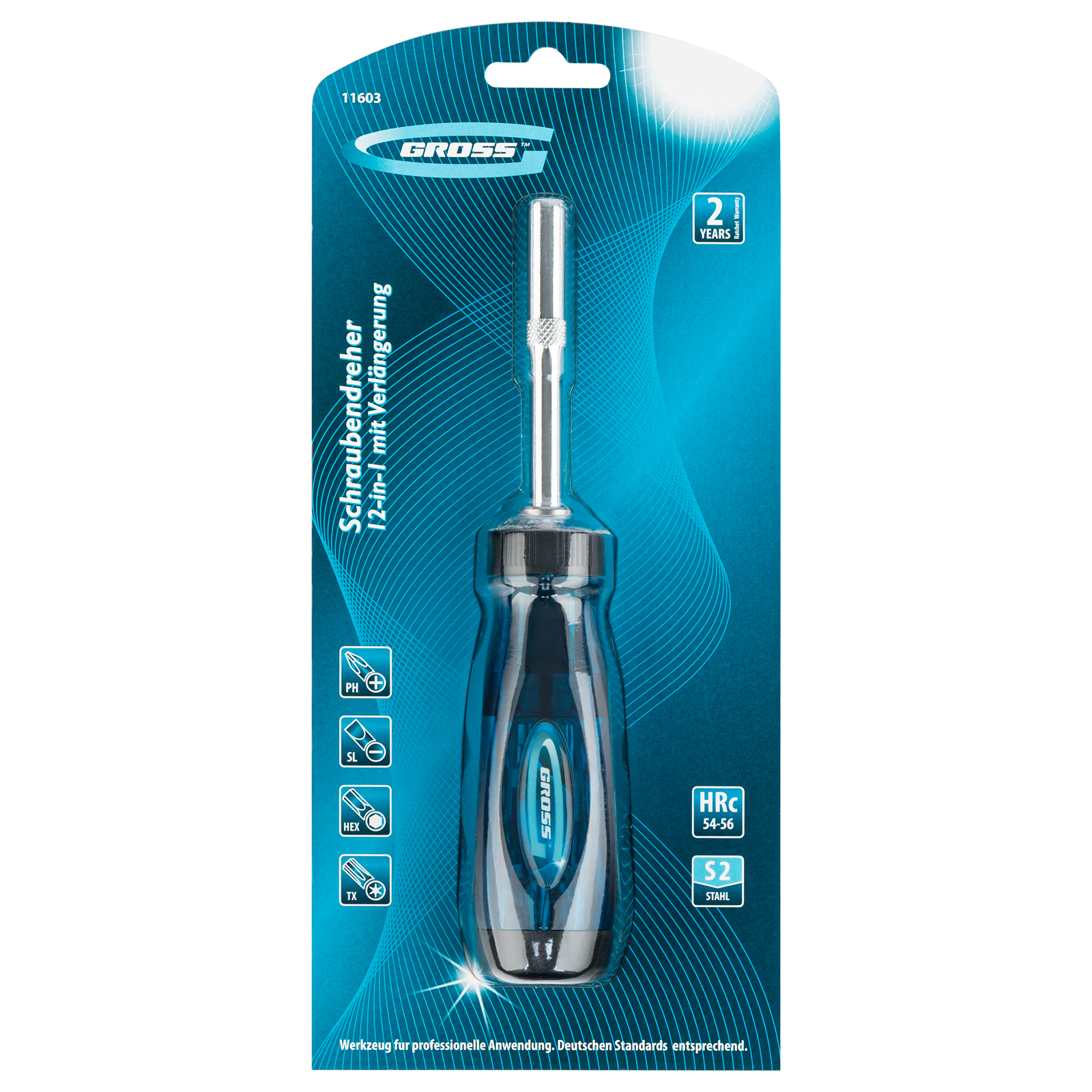 Реверсивная отвертка Gross 11603 с удлинителем и трещоткой на 72 зуба комплектуется 12 сменными битами из стали S2 для эффективной работы с саморезами, винтами и другим крепежом. Она пригодится при проведении монтажных, строительных, ремонтных работ. Для расширения возможностей отвертки можно использовать любые биты длиной 25 мм с хвостовиком 1/4 дюйма.