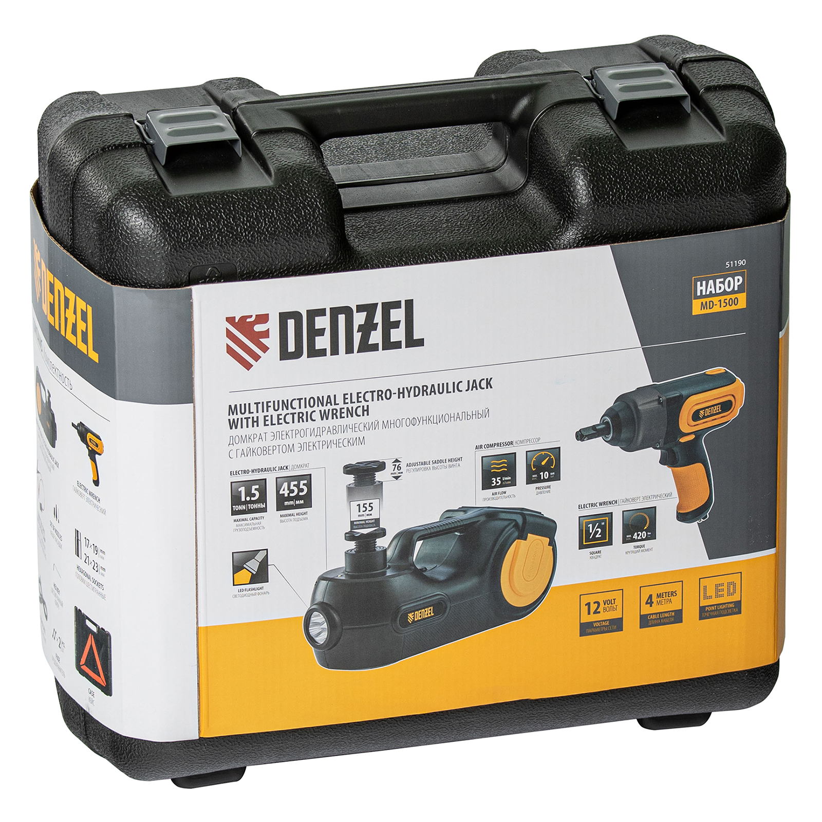 Электрогидравлический домкрат «3 в 1» Denzel 51190 в наборе с электрическим гайковертом работает от сети 12 В и представляет собой устройство для подъема грузов массой до 1,5 т на высоту 155-455 мм. Встроенный компрессор производительностью 35 л/мин служит для подкачки шин, мячей, матрацев и других резиновых изделий. Гайковерт с переключателем направления вращения позволяет откручивать и закручивать резьбовой крепеж во время замены колес. Набор будет полезен в гараже, автомастерской, также пригодится водителям в поездке.