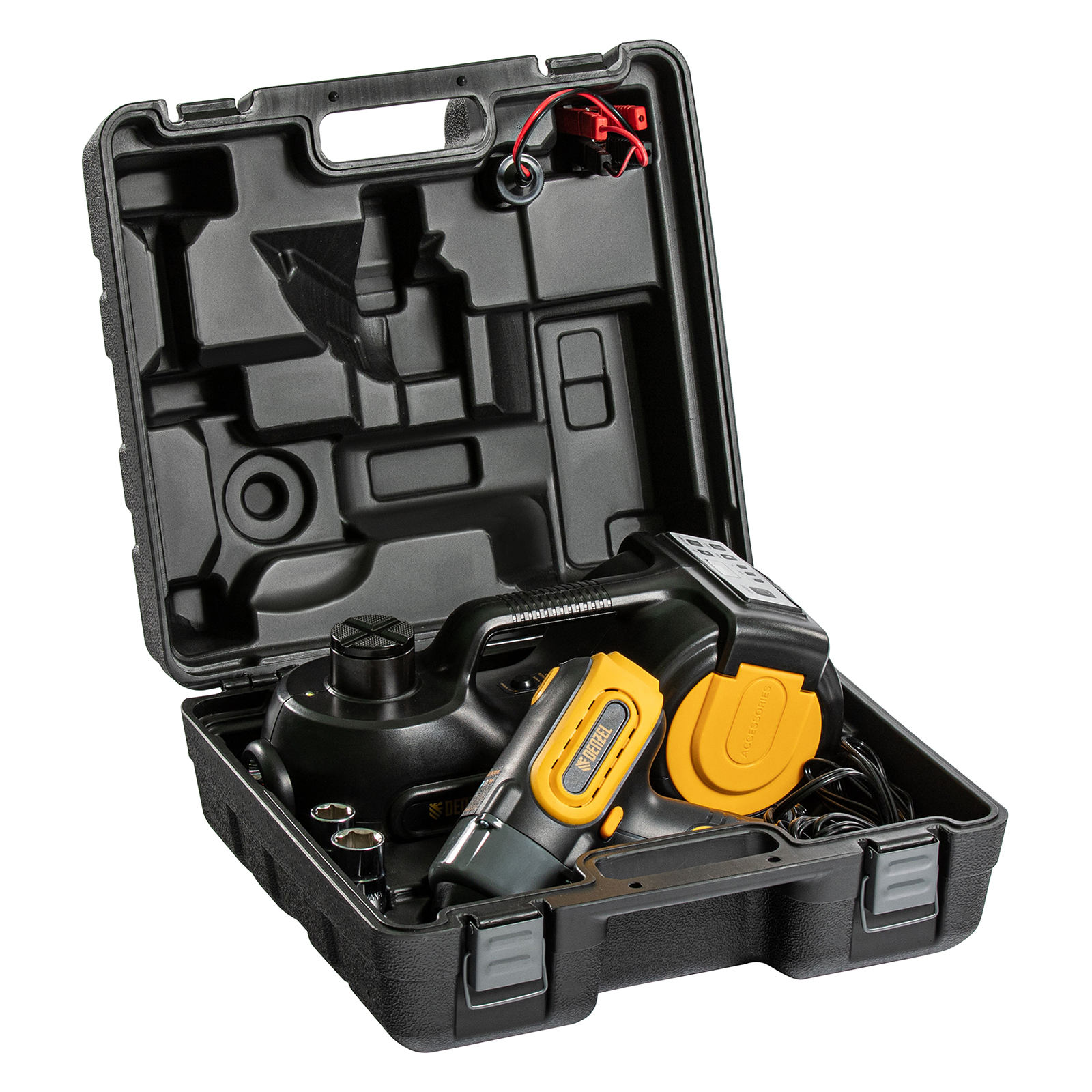 Электрогидравлический домкрат «3 в 1» Denzel 51190 в наборе с электрическим гайковертом работает от сети 12 В и представляет собой устройство для подъема грузов массой до 1,5 т на высоту 155-455 мм. Встроенный компрессор производительностью 35 л/мин служит для подкачки шин, мячей, матрацев и других резиновых изделий. Гайковерт с переключателем направления вращения позволяет откручивать и закручивать резьбовой крепеж во время замены колес. Набор будет полезен в гараже, автомастерской, также пригодится водителям в поездке.