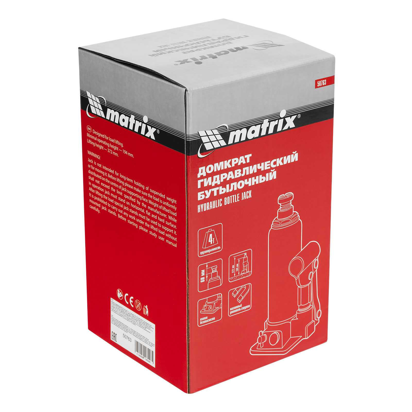 Гидравлический бутылочный домкрат Matrix 50763 предназначен для быстрого поднятия грузов массой до 4 т на высоту 194-372 мм. Будет полезен автолюбителям и мастерам СТО в качестве полупрофессионального инструмента. Встроенный магнитный уловитель металлической стружки защищает резиновые уплотнители от повреждений.