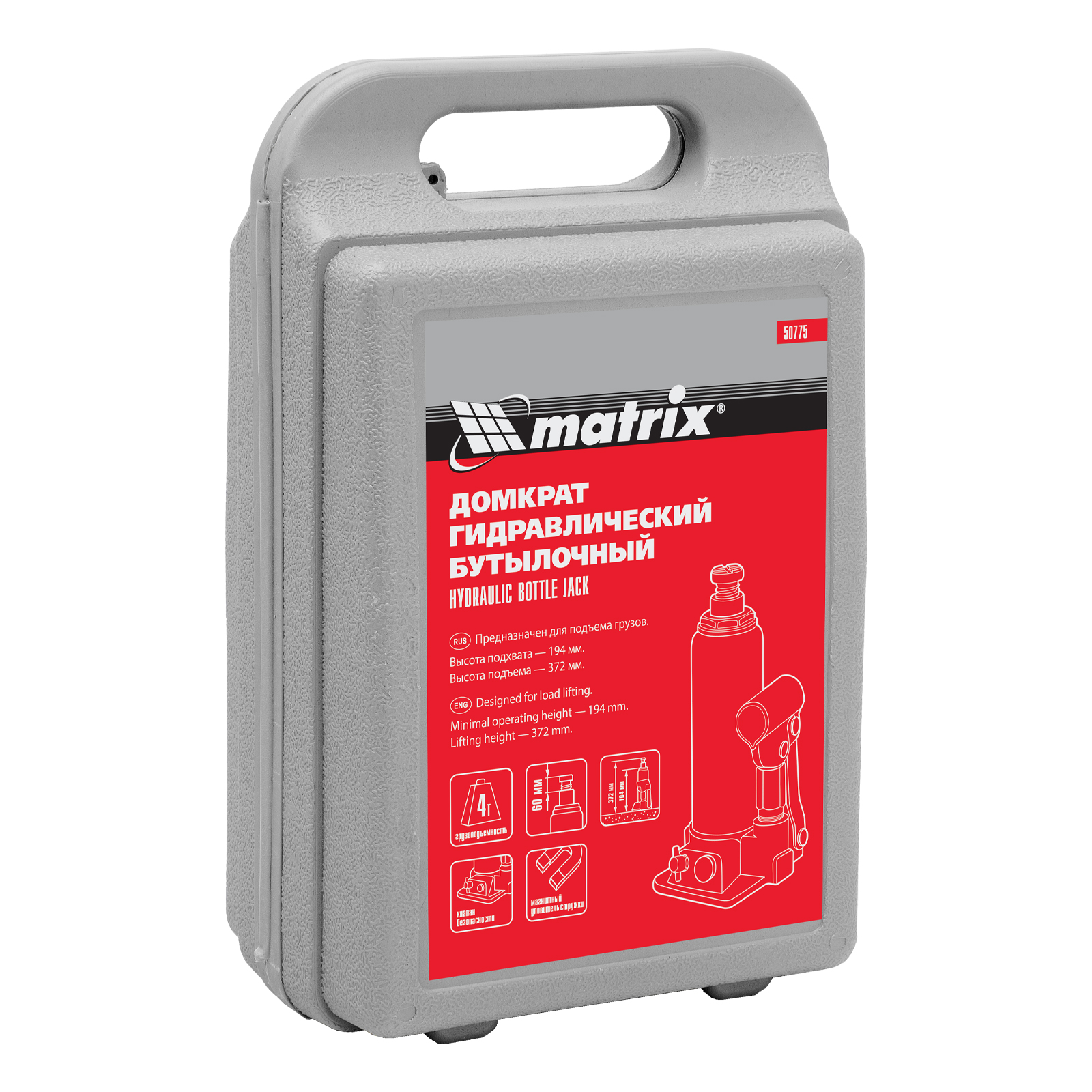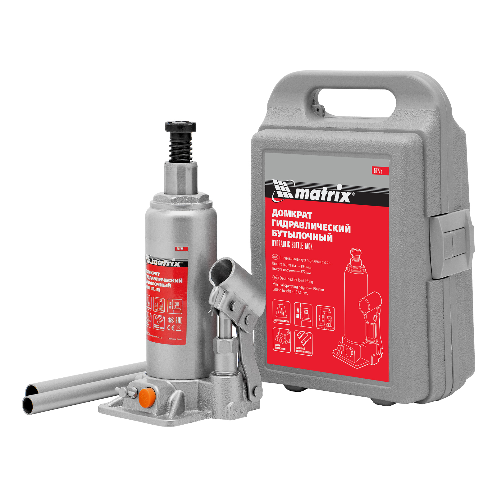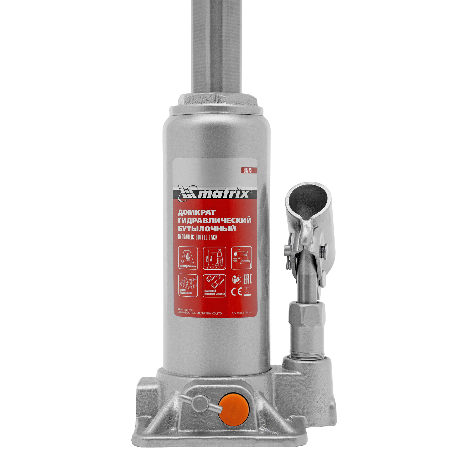 Гидравлический бутылочный домкрат Matrix 50775 позволяет быстро поднимать грузы массой до 4 т на высоту 194-372 мм. Встроенный магнитный уловитель собирает металлическую стружку, предотвращая преждевременный износ резиновых уплотнителей. Домкрат пригодится для полупрофессионального применения.