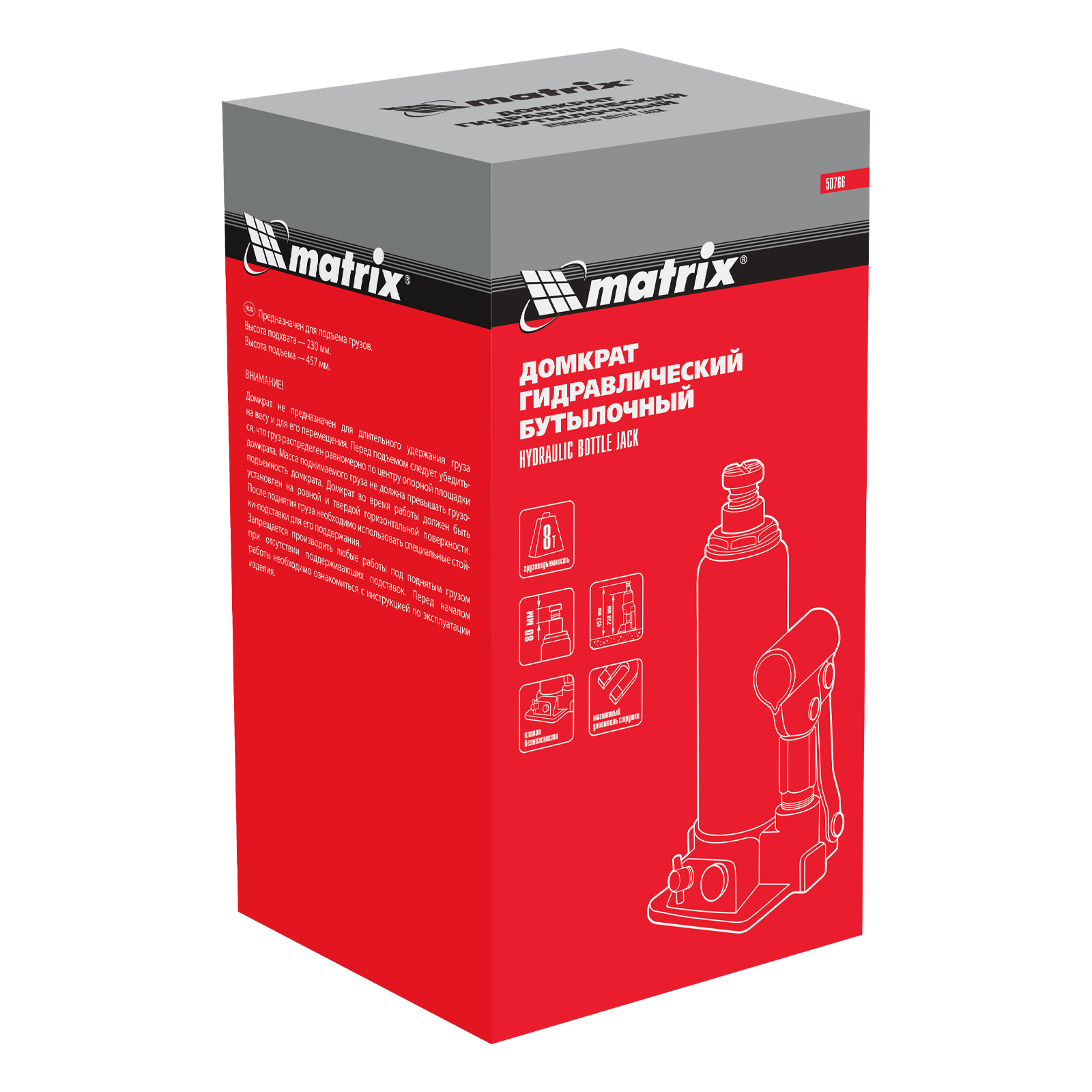 Гидравлический бутылочный домкрат Matrix 50766 предназначен для быстрого поднятия грузов массой до 8 т на высоту 230-457 мм. Будет полезен автолюбителям и мастерам СТО в качестве полупрофессионального инструмента. Встроенный магнитный уловитель металлической стружки защищает резиновые уплотнители от повреждений.