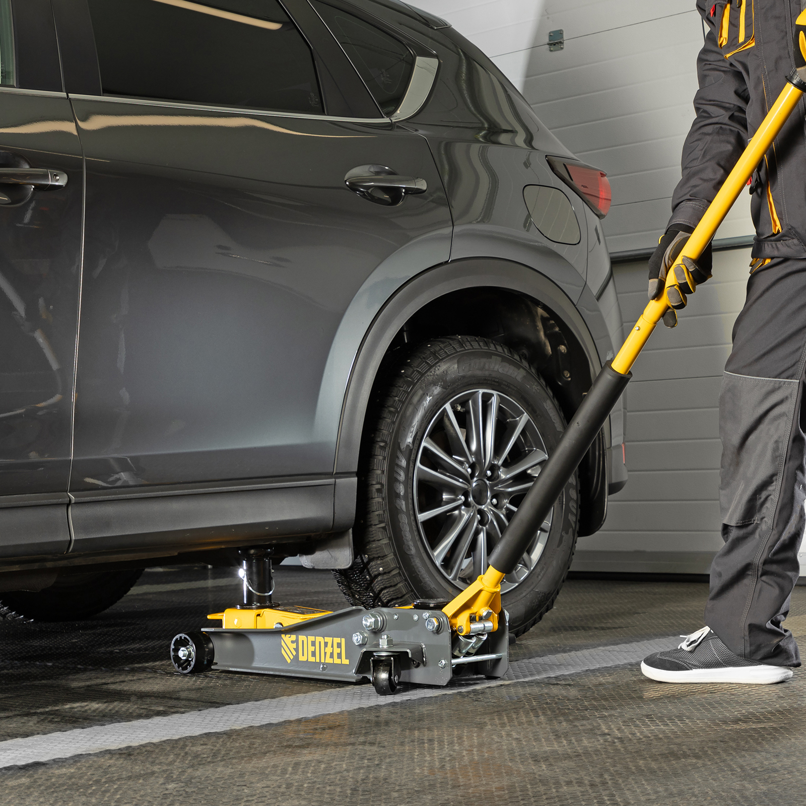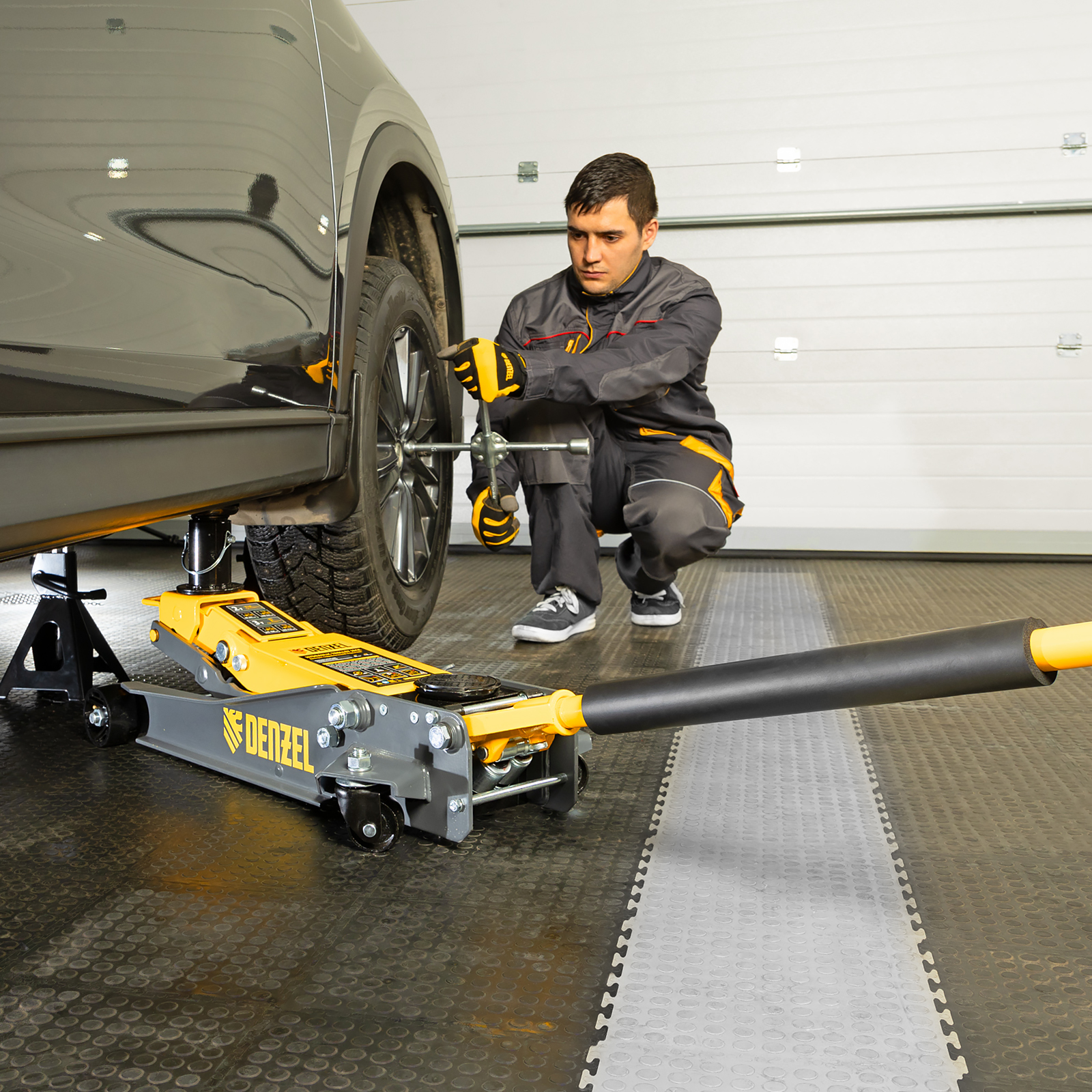 - Аккуратная работа — резиновая опора и прорезиненная рукоятка защищают кузов и днище автомобиля от нежелательных повреждений.