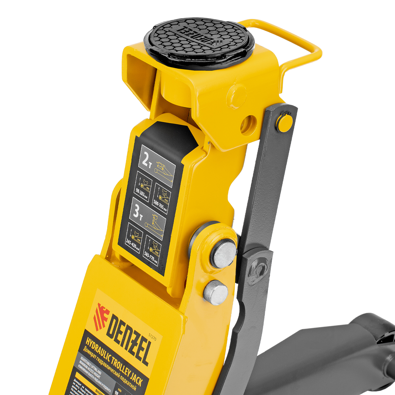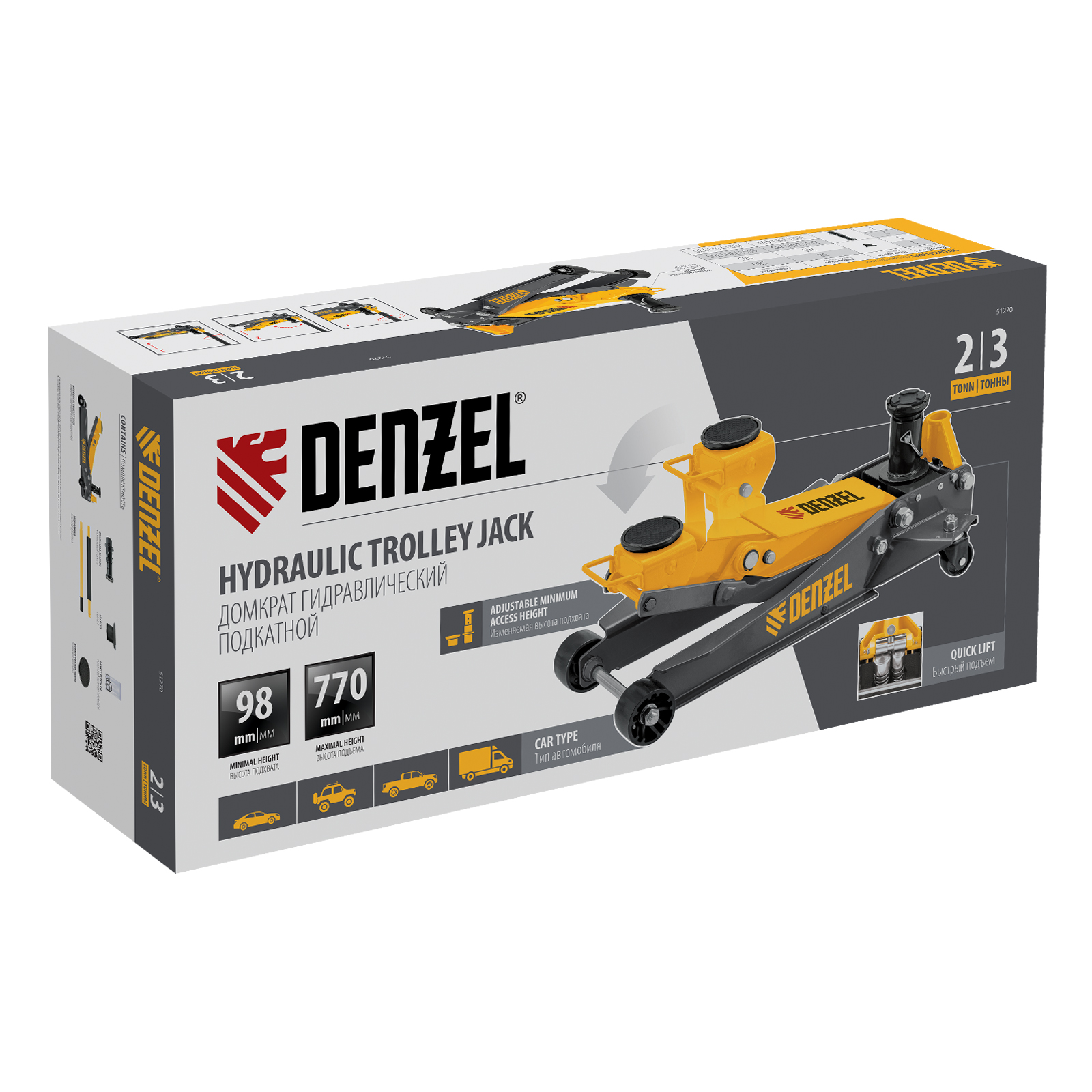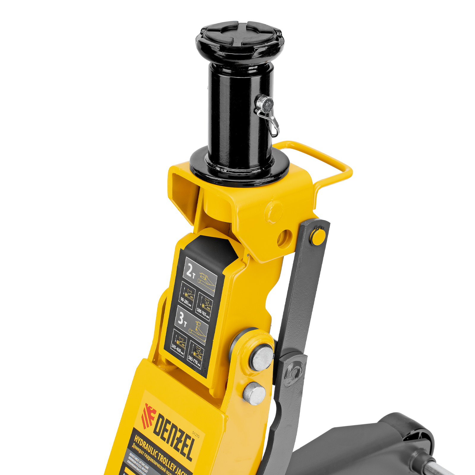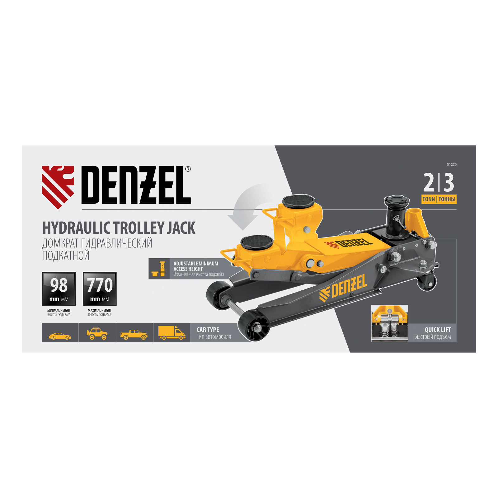 Профессиональный подкатной гидравлический домкрат Denzel 51270 с низким подхватом используется для быстрого подъема на высоту 98-770 мм всех типов автомобилей с любым клиренсом и массой до 2-3 т, в том числе SUV (внедорожников). Регулируемая проставка позволяет менять высоту подхвата и подъема, а также максимальную грузоподъемность. Высота подъема до 770 мм позволяет без труда обслуживать автомобили с высоким клиренсом, такие как рамные внедорожники, например, Dodge RAM, Ford Raptor и т.д.