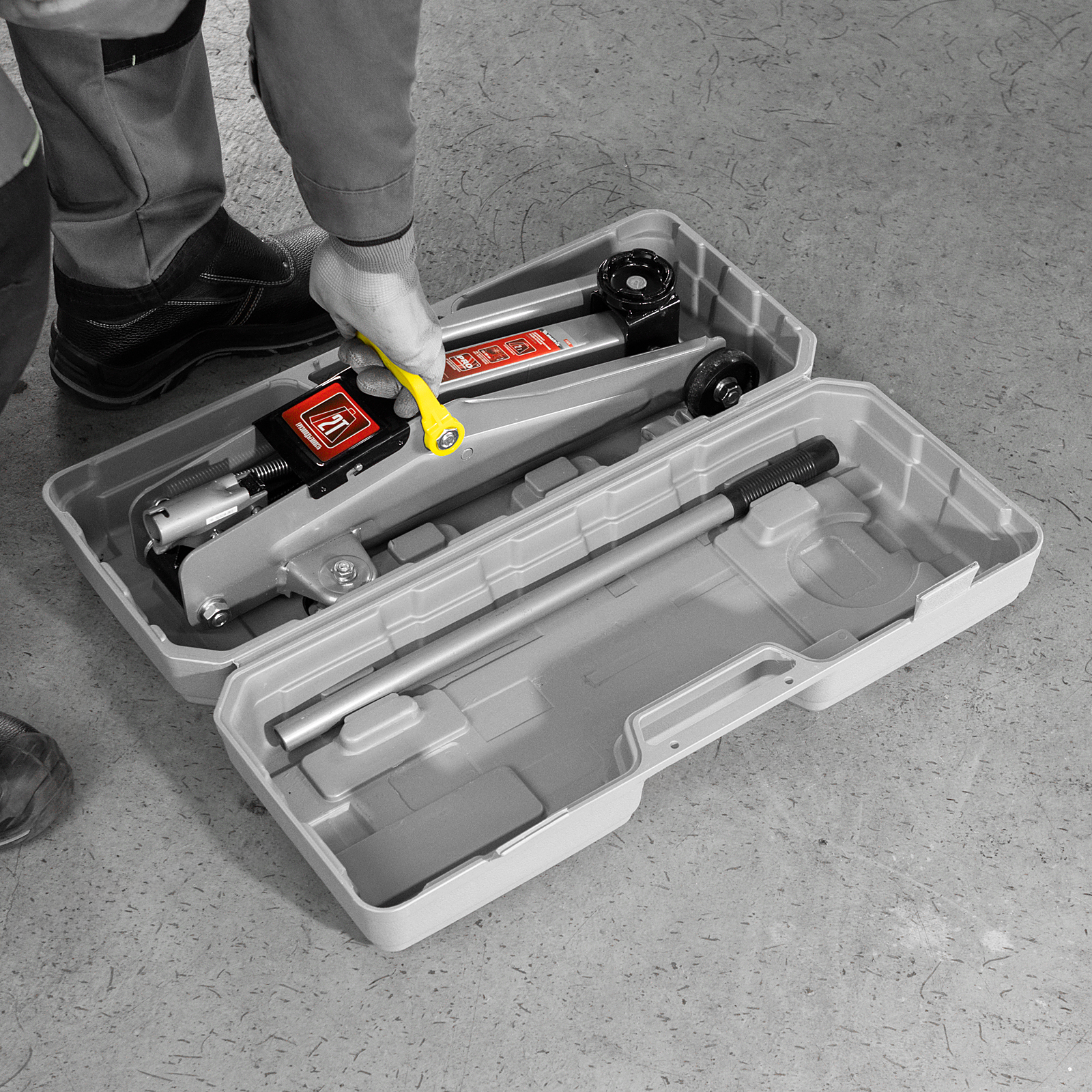 - Удобное хранение и транспортировка — домкрат поставляется в пластиковом кейсе.