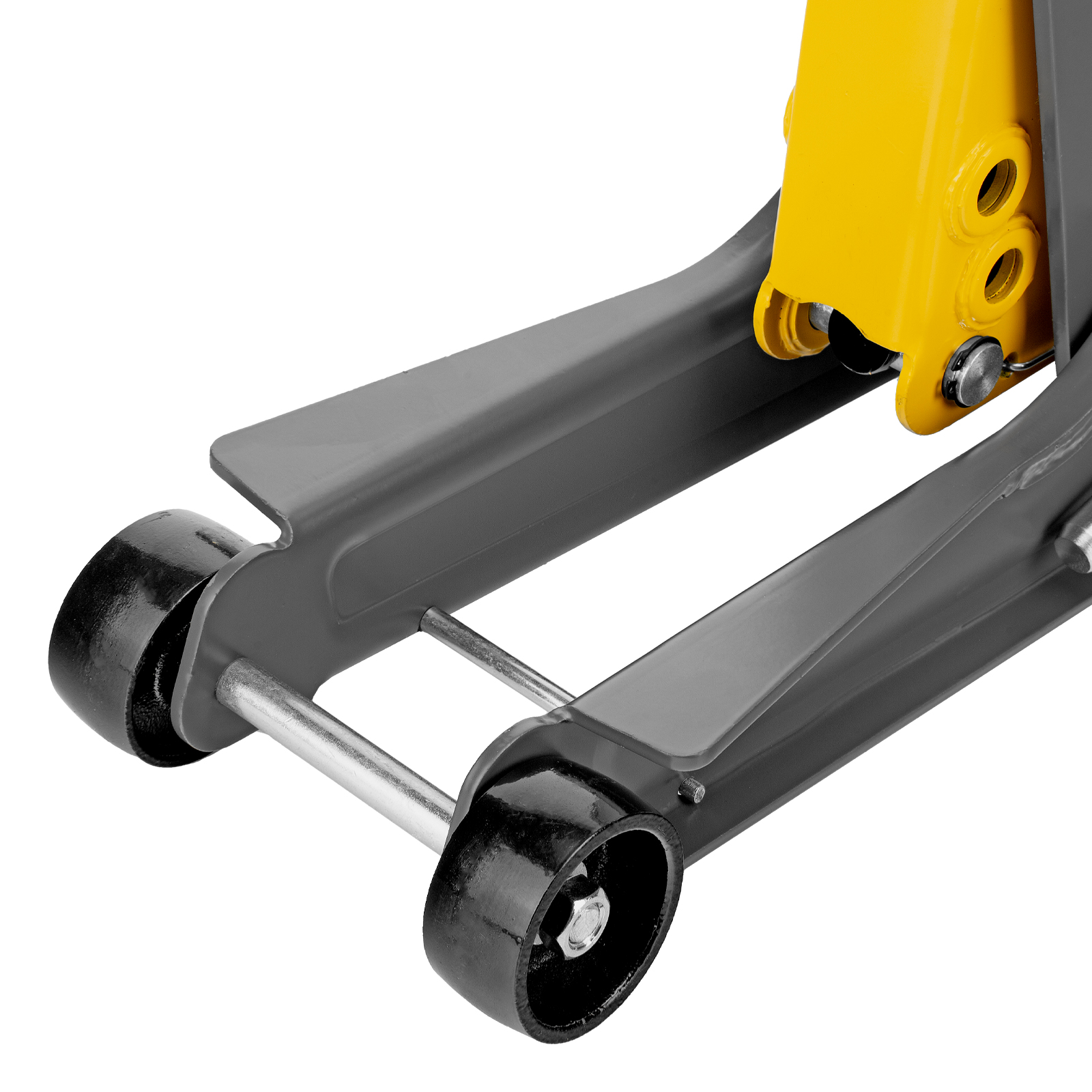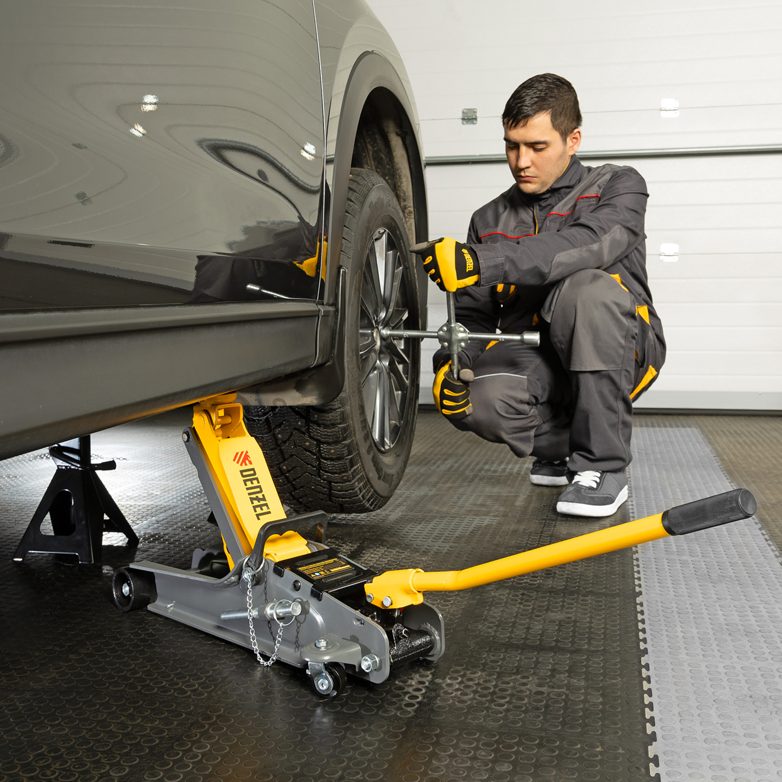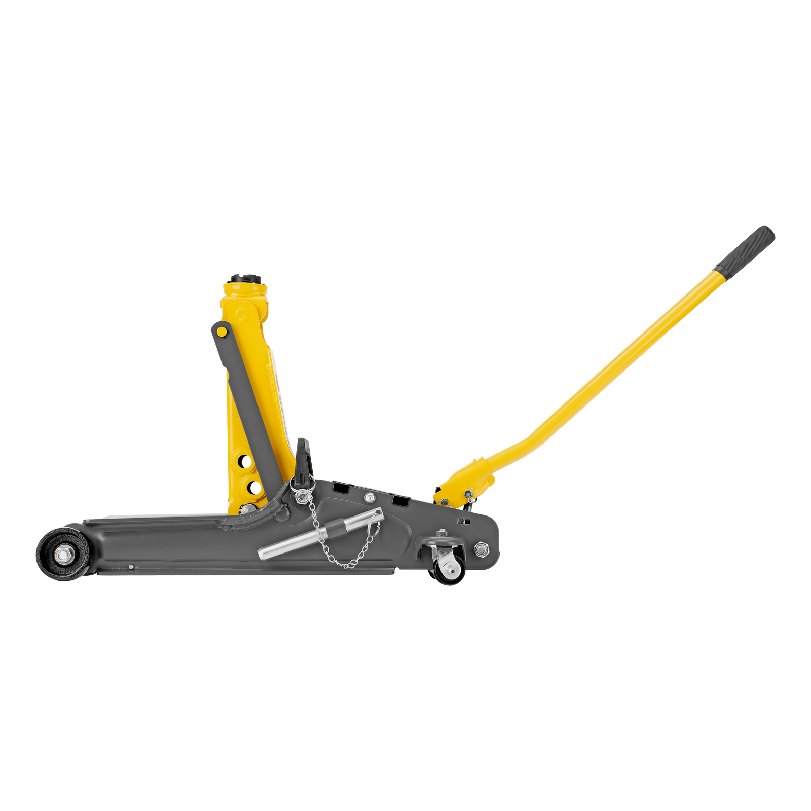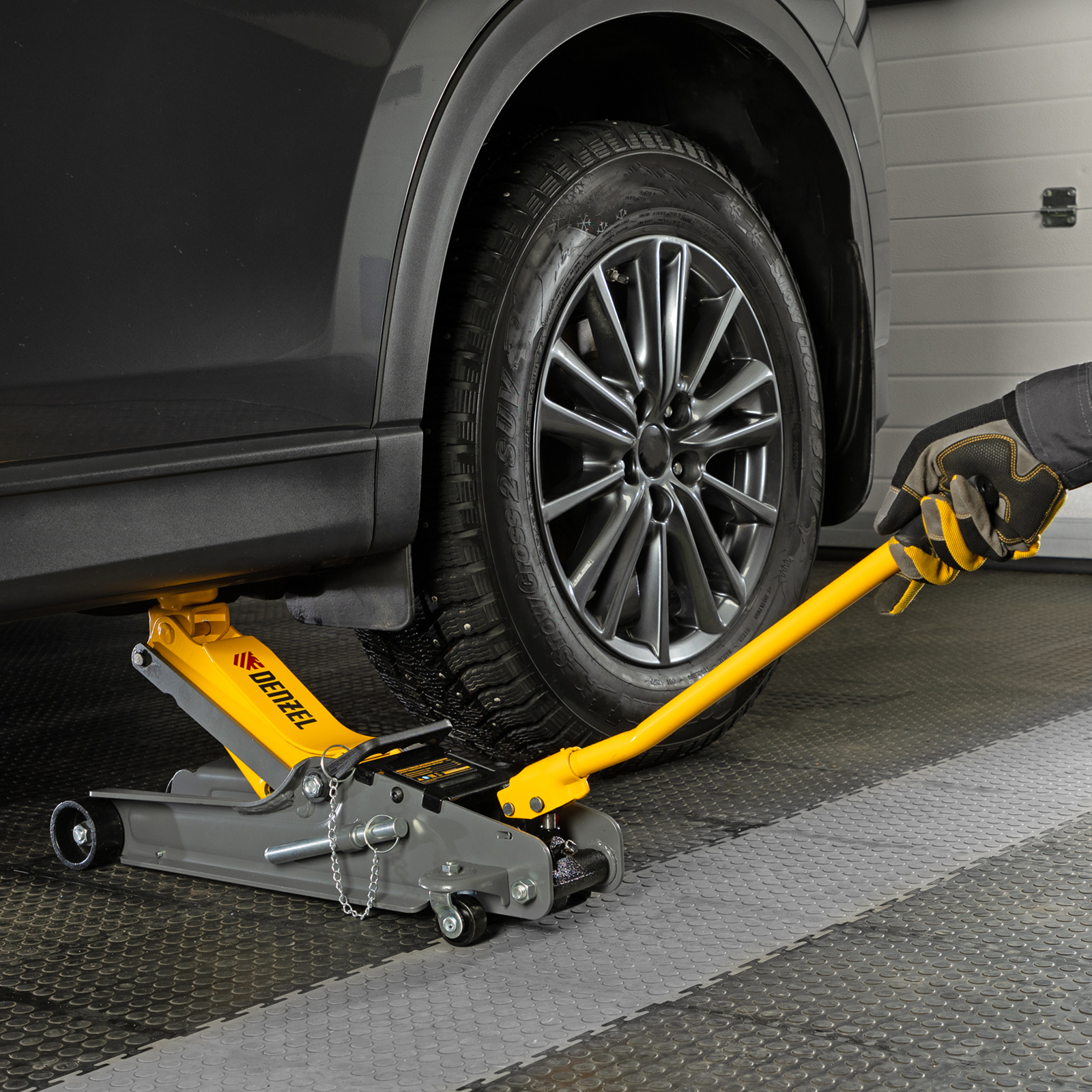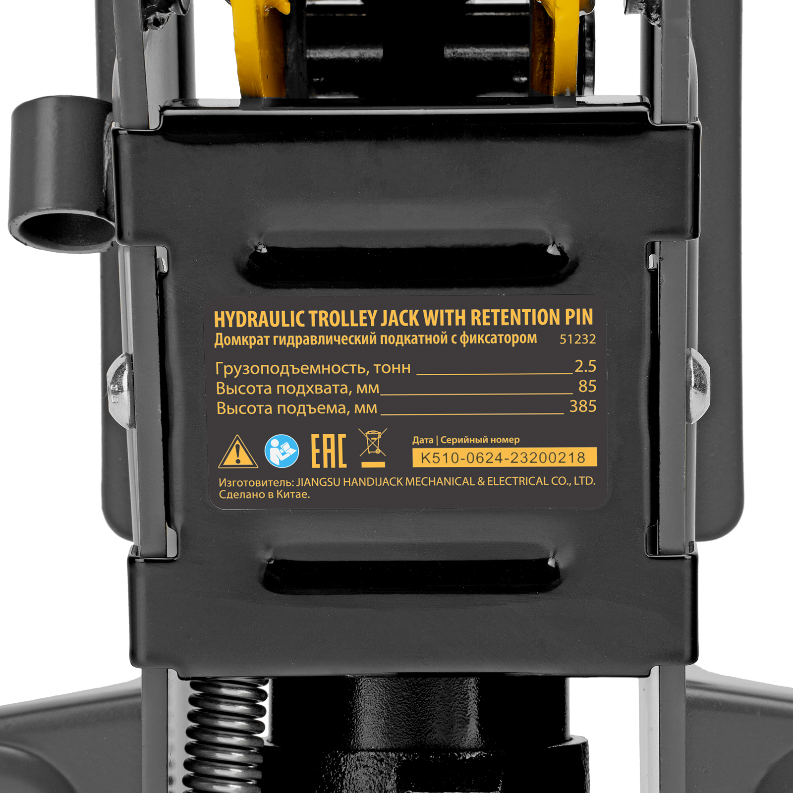 Гидравлический подкатной домкрат Denzel 51232 с фиксатором имеет высоту подхвата 85 мм и предназначен для плавного подъема грузов массой до 2,5 т на высоту до 385 мм. Страховочный штифт позволяет фиксировать подъемный рычаг на высоте 290 и 355 мм для безопасной работы. Домкрат пригодится владельцам легковых автомобилей с низким и стандартным клиренсом.