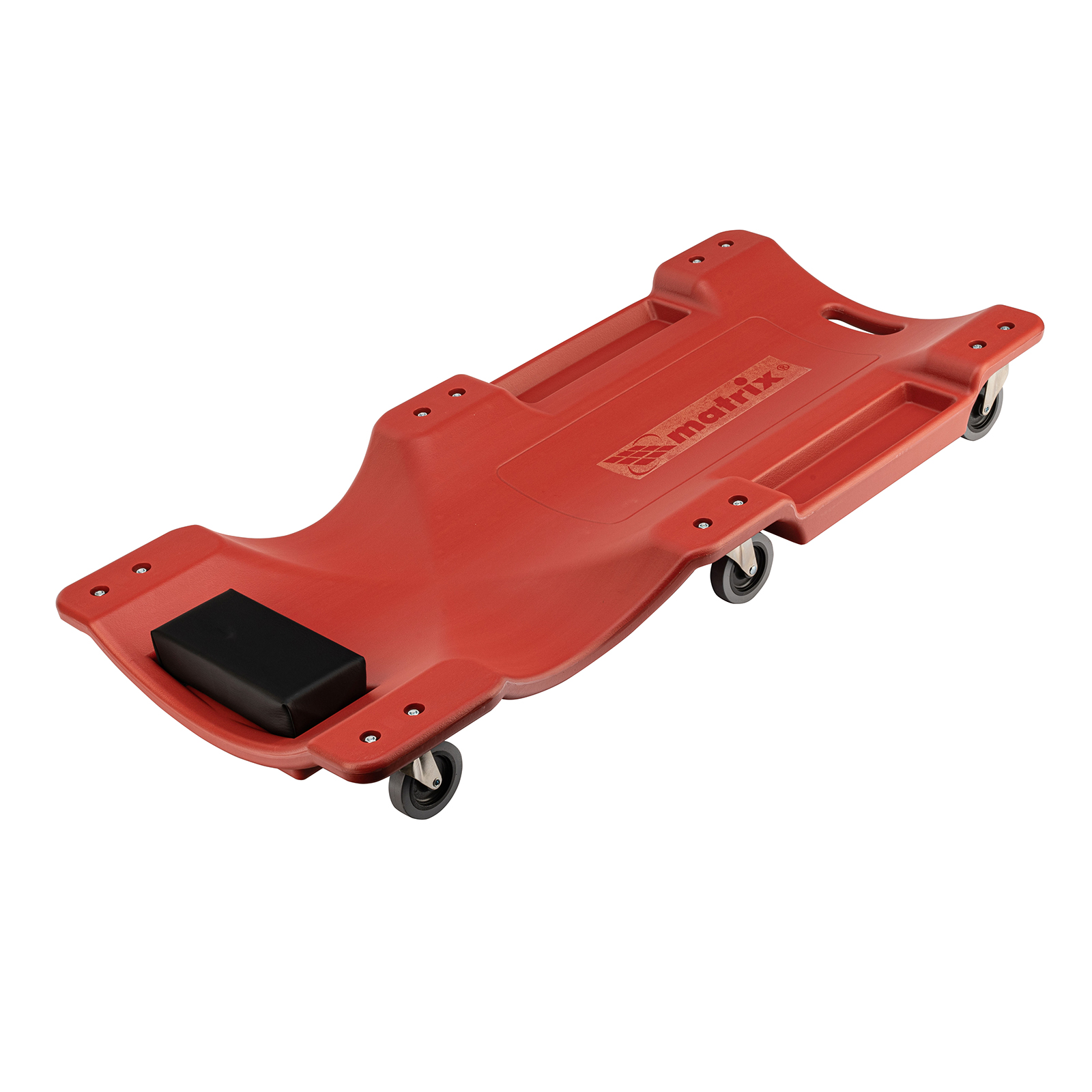 Лежак ремонтный на 6-ти колесах Matrix 567485, 1000 х 475 х 128 мм, пластиковый, облегчает работу при проведении ремонта в нижней части авто. Он будет полезен для автолюбителей в гараже. А благодаря двум встроенным инструментальным лоткам все необходимые инструменты будут под рукой.