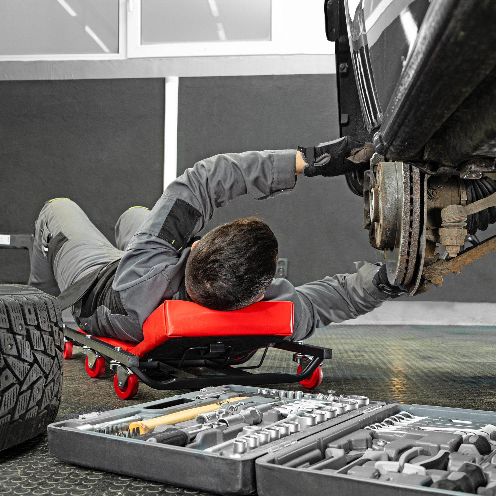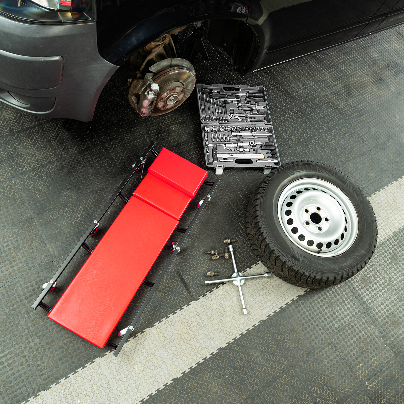 Лежак ремонтный на 6-ти колесах Matrix 567455, 1030 х 440 х 120 мм, с поднимающимся подголовником, позволяет легко въехать под машину для осуществления ее техобслуживания, ремонта систем питания, выпускной системы, трансмиссии и т.д. Он станет незаменимым помощником для автолюбителей в гараже и профессионалов в автомастерской.