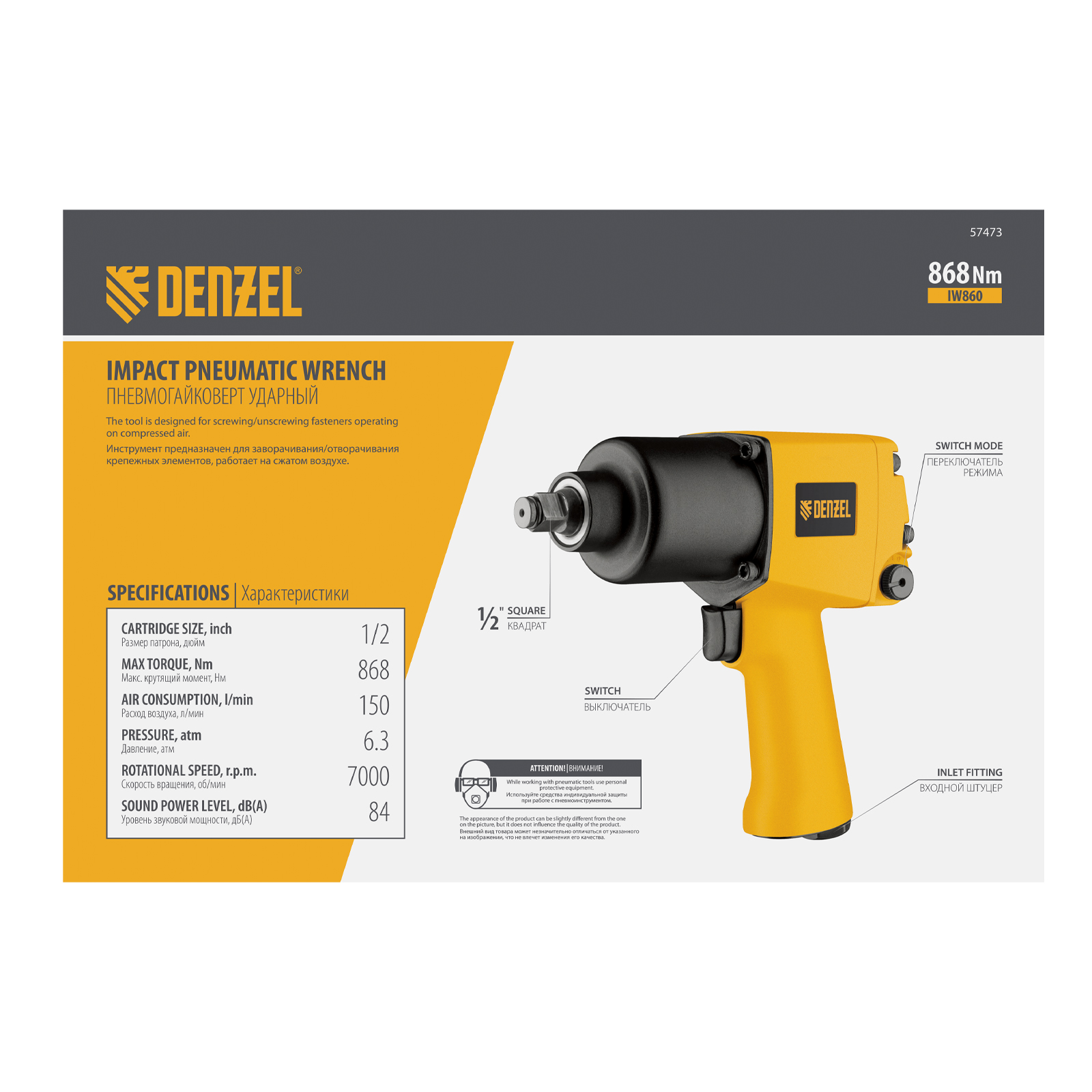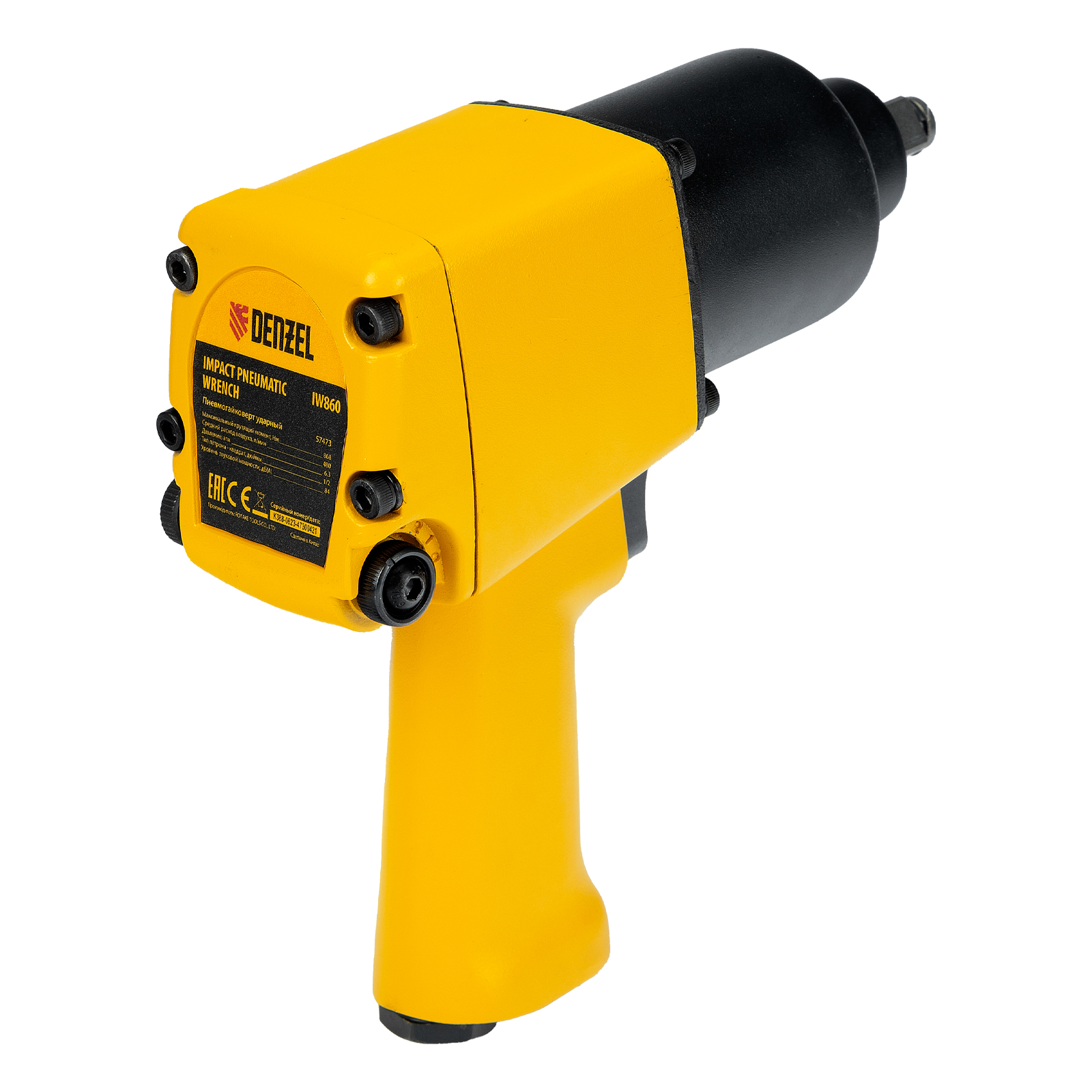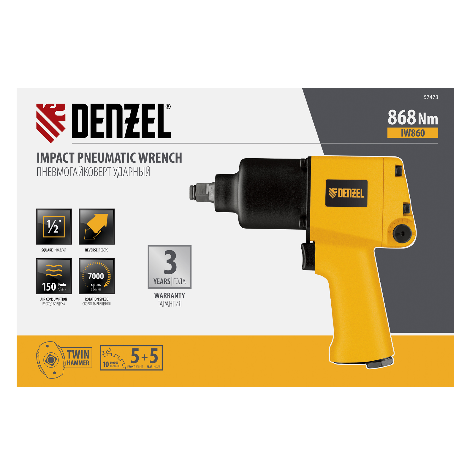 Ударный пневмогайковерт Denzel IW860 57473 с присоединительным квадратом 1/2″, скоростью вращения шпинделя 7000 об/мин и максимальным крутящим моментом 868 Нм служит для монтажа и демонтажа резьбовых соединений, в том числе высоконагруженных. Предусмотрено 10 режимов работы, что позволяет точно установить оптимальную скорость. Инструмент предназначен для профессионального использования в цехе, на строительной площадке или в автосервисе.