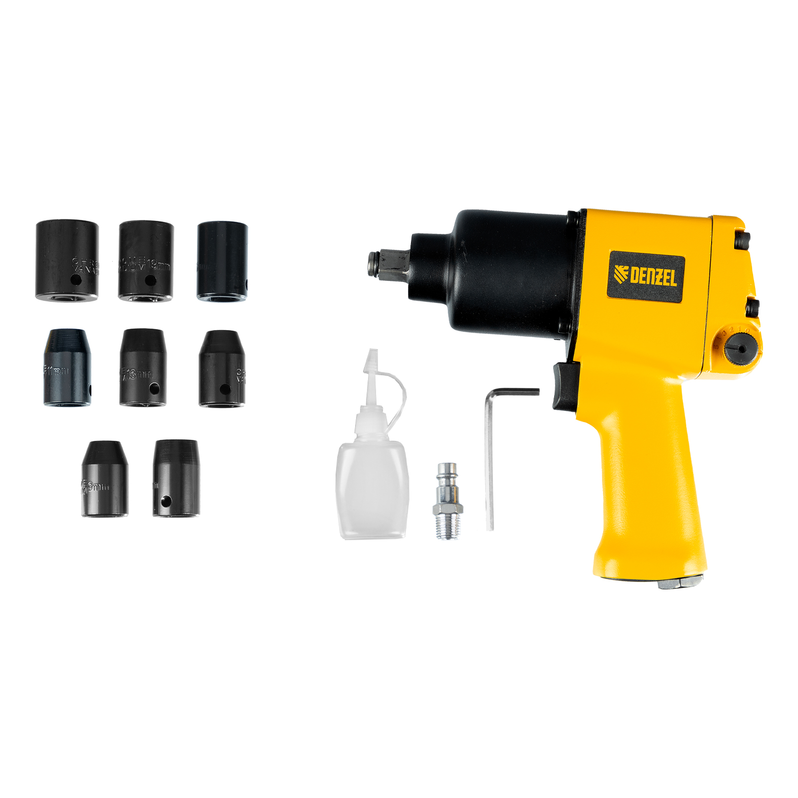 - Расширенная комплектация — в набор входит 8 торцевых головок и штуцер для подключения к компрессору, что позволяет сразу приступить к работе.