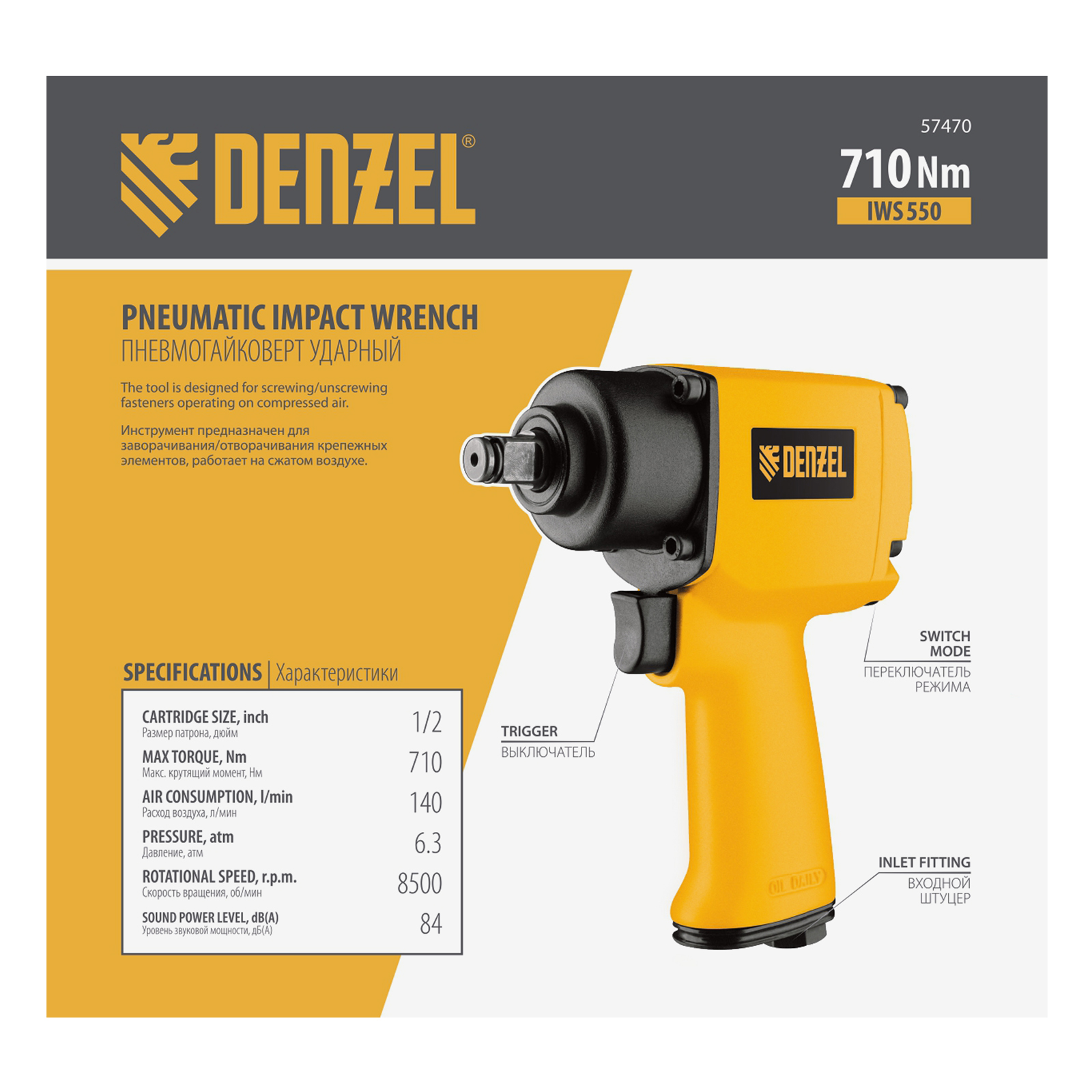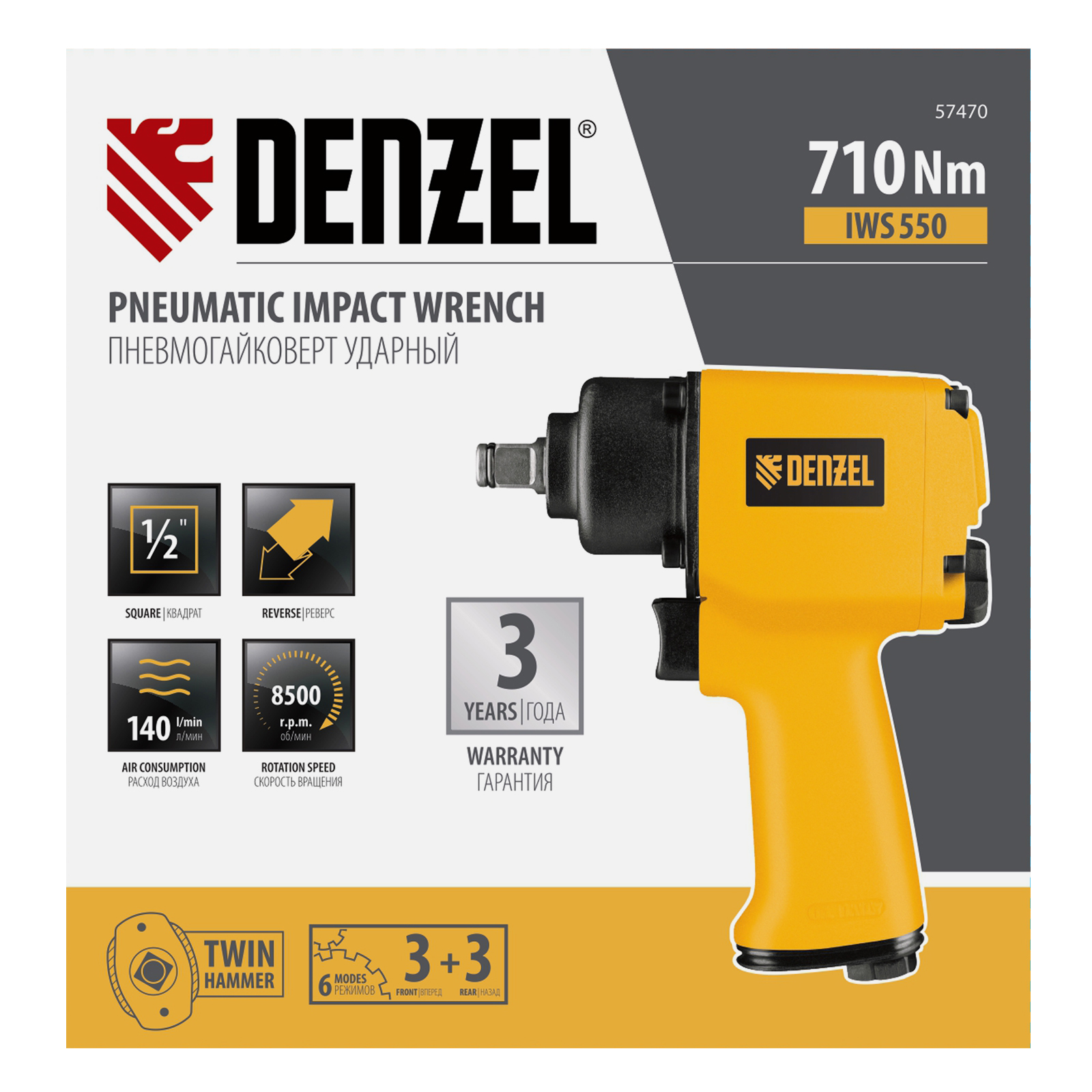 Ударный пневмогайковерт Denzel IWS550 Compact 57470 с присоединительным квадратом 1/2″ обеспечивает скорость вращения шпинделя 8500 об/мин и максимальный крутящий момент 710 Н·м. Используется для закручивания и выкручивания резьбового крепежа. Благодаря встроенному механизму Twin Hammer инструмент справляется даже с проржавевшими соединениями. Пневмогайковерт применяется для решения профессиональных задач в цехах, на строительных площадках и в автосервисах.