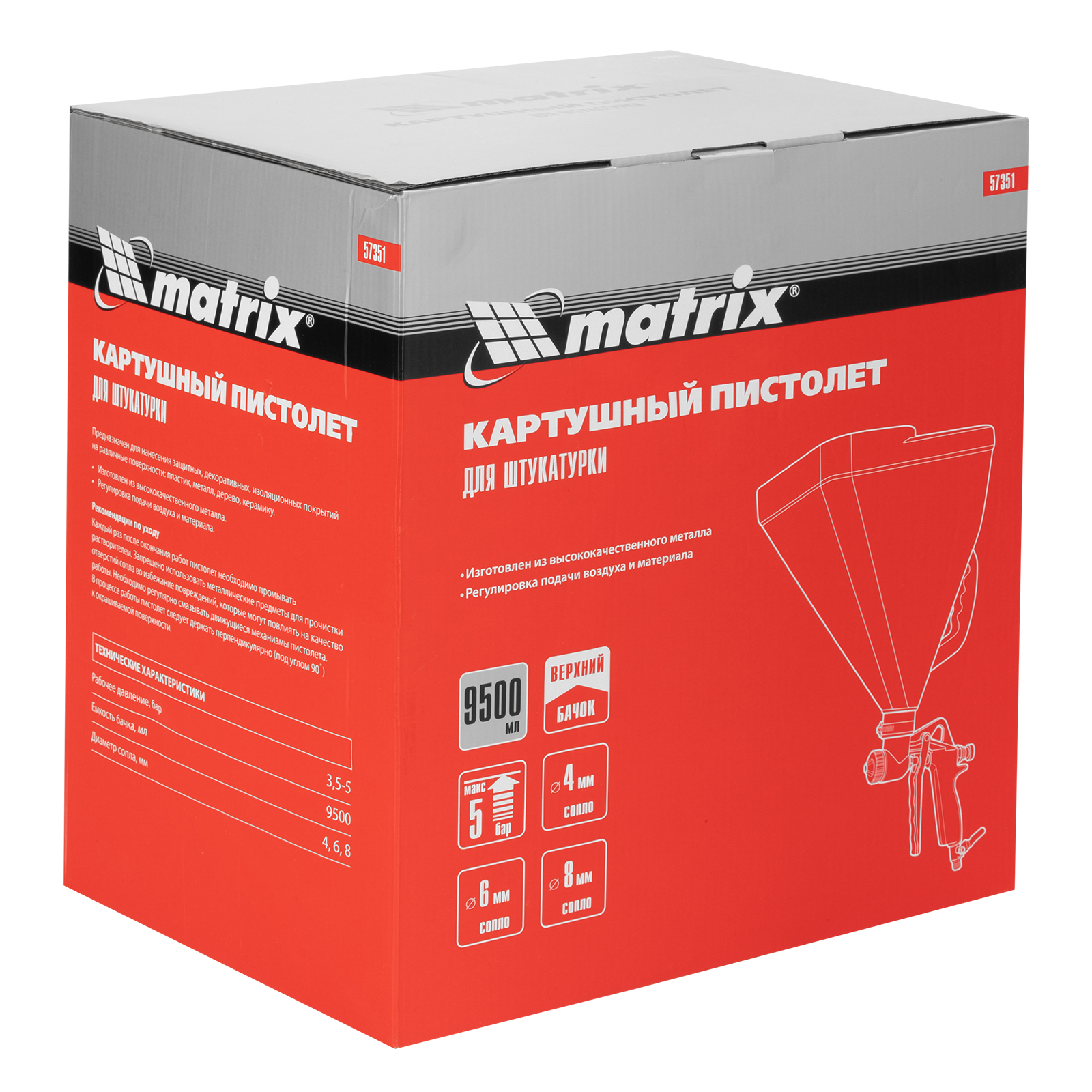 Картушный пистолет Matrix 57351 с объемом бака 9,5 л и соплами 4 и 6 мм предназначен для нанесения штукатурки, вязких красок и других растворов. Высокая скорость распыления материала позволяет быстро обрабатывать участки большой площади. Инструмент используется для проведения отделочных работ.
