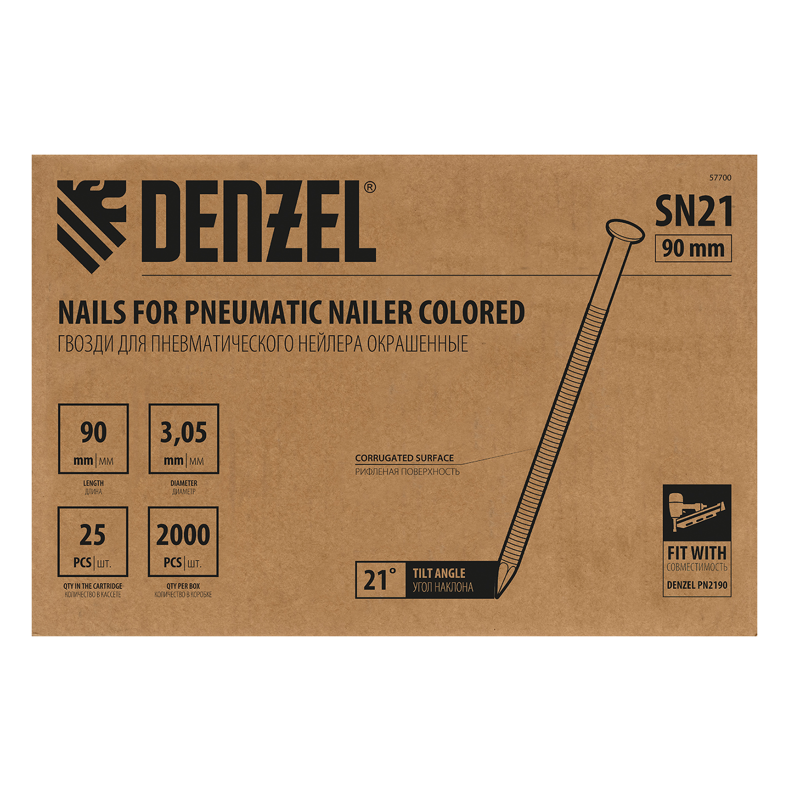 Гвозди Denzel 57700 типа SN21, длиной 90 мм и диаметром 3,05 мм, с крашеной поверхностью, 2000 шт. в упаковке, — расходники для пневматического нейлера. Используются для скрепления различных материалов, будут полезны во время сборочных и отделочных работ.