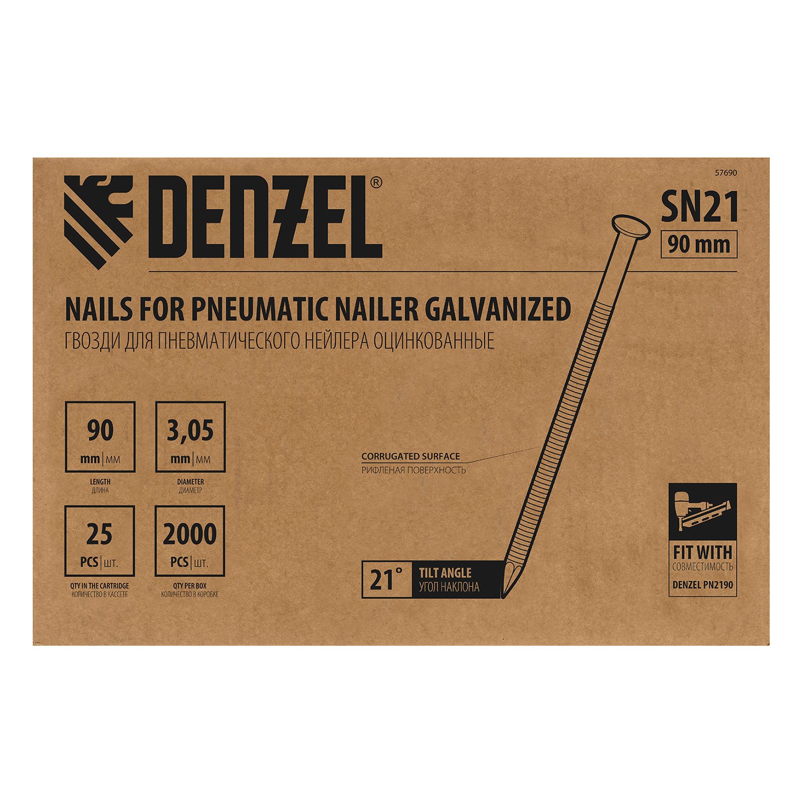 Оцинкованные гвозди Denzel 57690 типа SN21, длиной 90 мм и диаметром 3,05 мм, 2000 шт. в упаковке, — расходники для пневматического нейлера. Используются для скрепления различных материалов, будут полезны во время сборочных и отделочных работ.