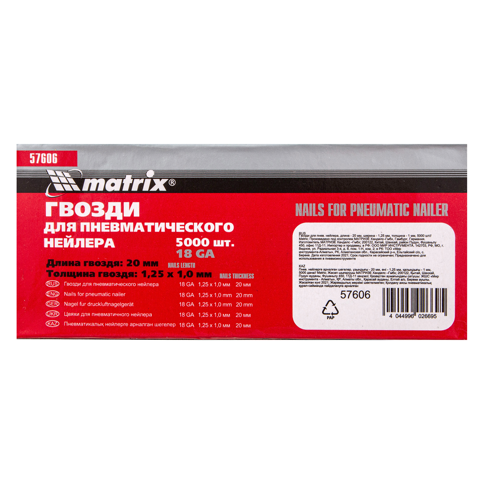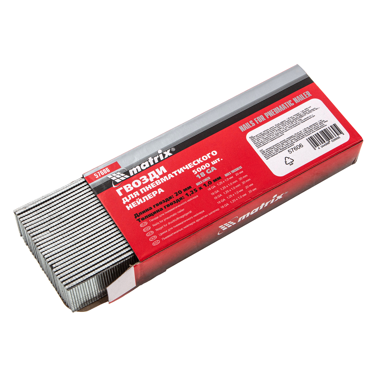 Гвозди Matrix 57606 типа 18GA, длиной 20 мм и шириной 1,25 мм, толщиной 1 мм, 5000 шт. в упаковке, предназначены для работы с пневматическим нейлером любой торговой марки. Обеспечивают быстрое и надежное скрепление деревянных деталей, упрощают монтаж уголков, металлических полос, а также выполнение других бытовых задач.