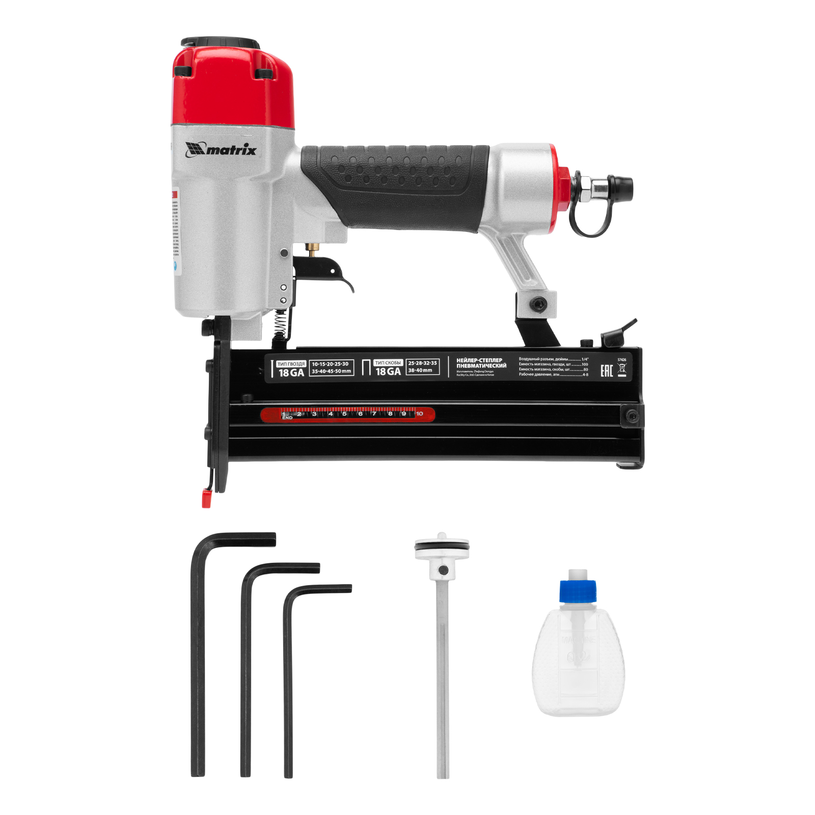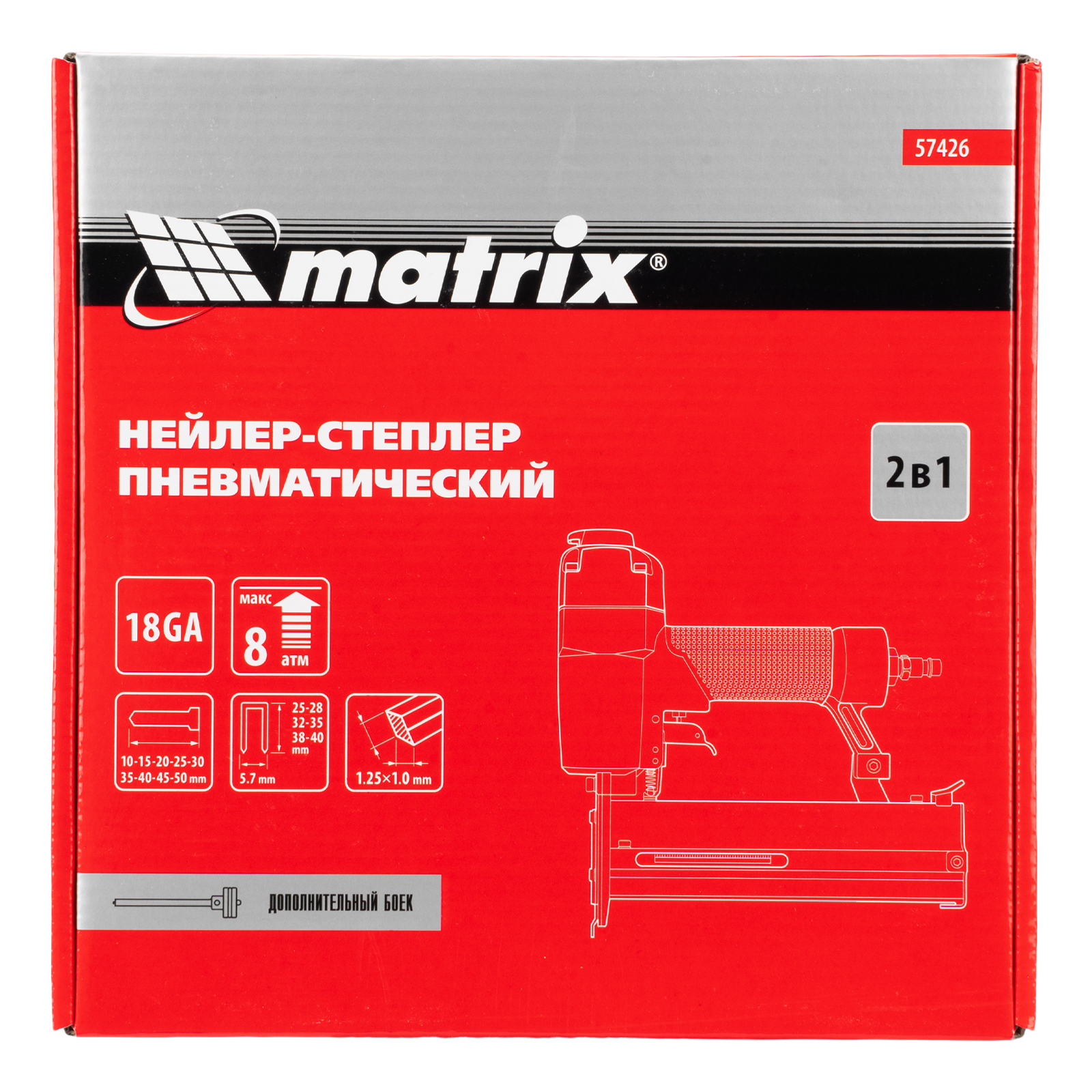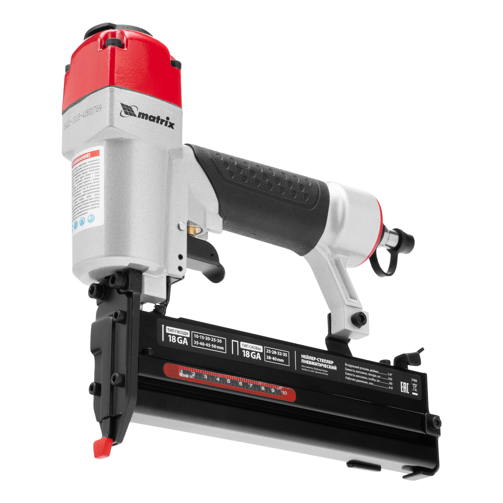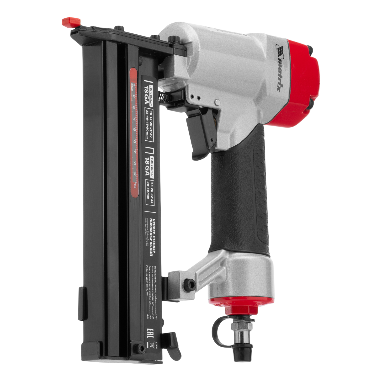 Пневматический нейлер-степлер 2 в 1 Matrix 57426 работает с двумя типами крепежей 18GA: гвоздями длиной 10-50 мм и скобами длиной 25-40 мм. Пригодится при сборке мебели и деревянных каркасов, для обшивки и утепления дома, при установке окон, дверей, плинтусов, напольных покрытий и для производства упаковки. Низкий расход воздуха 0,7 л/мин позволяет использовать инструмент с любыми типами компрессоров.