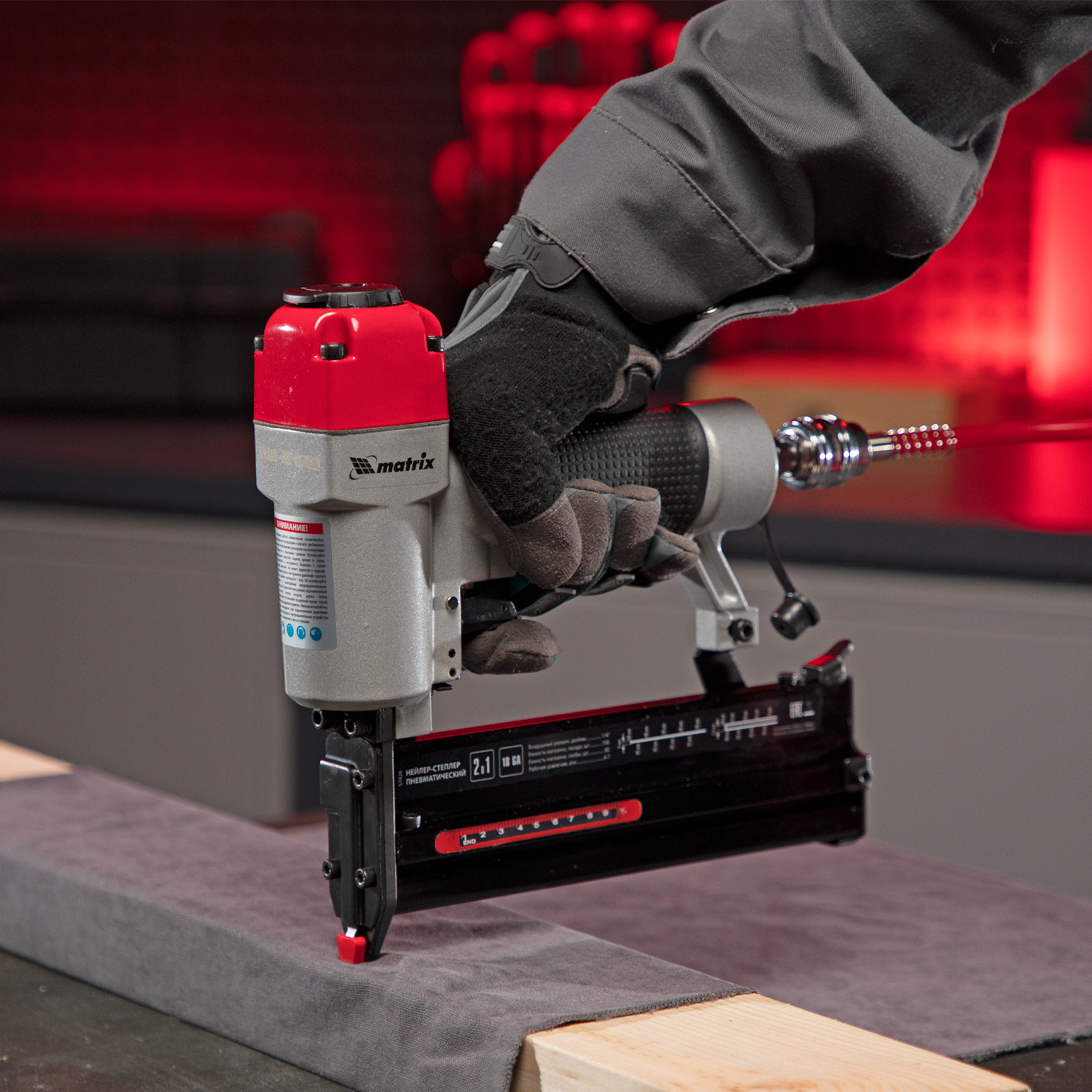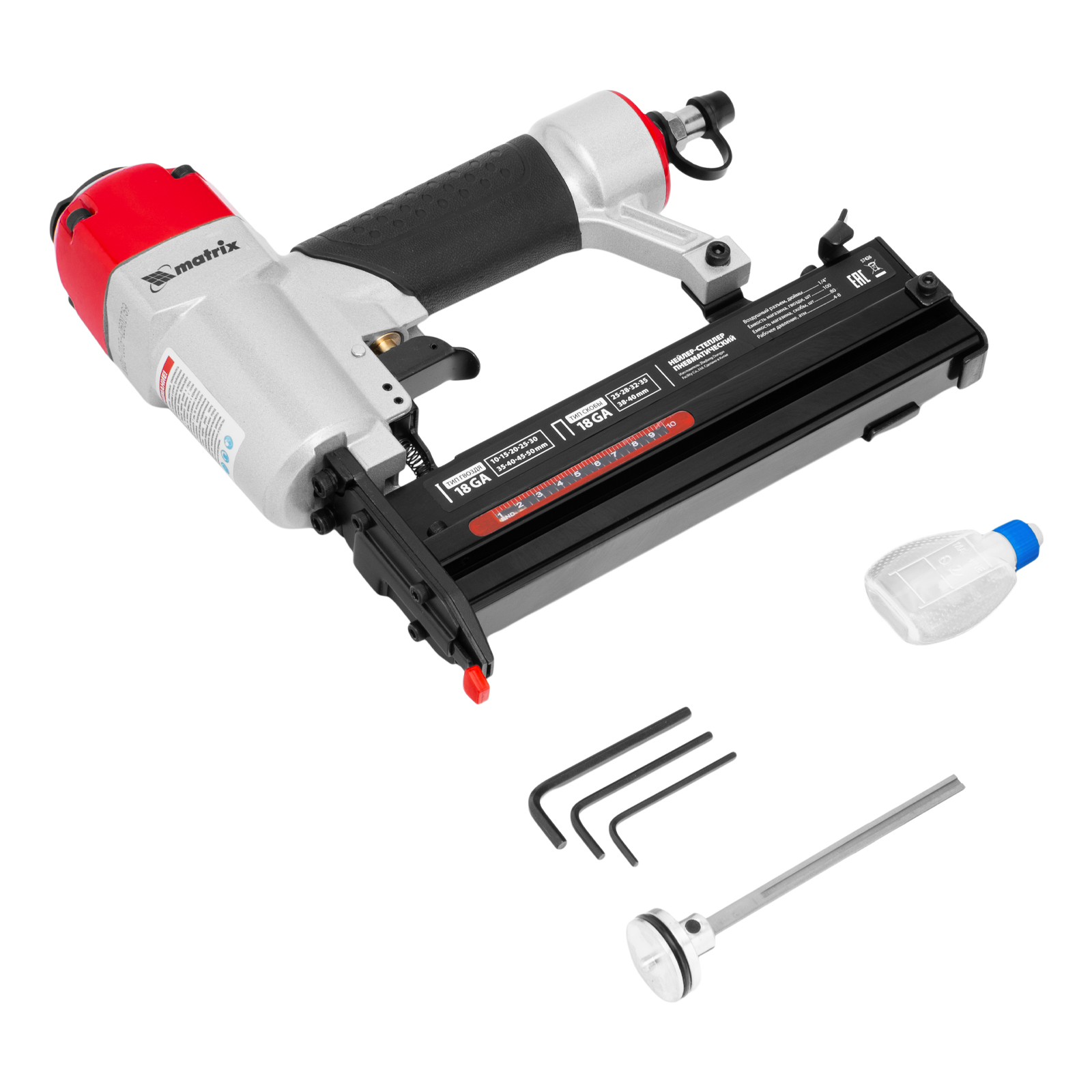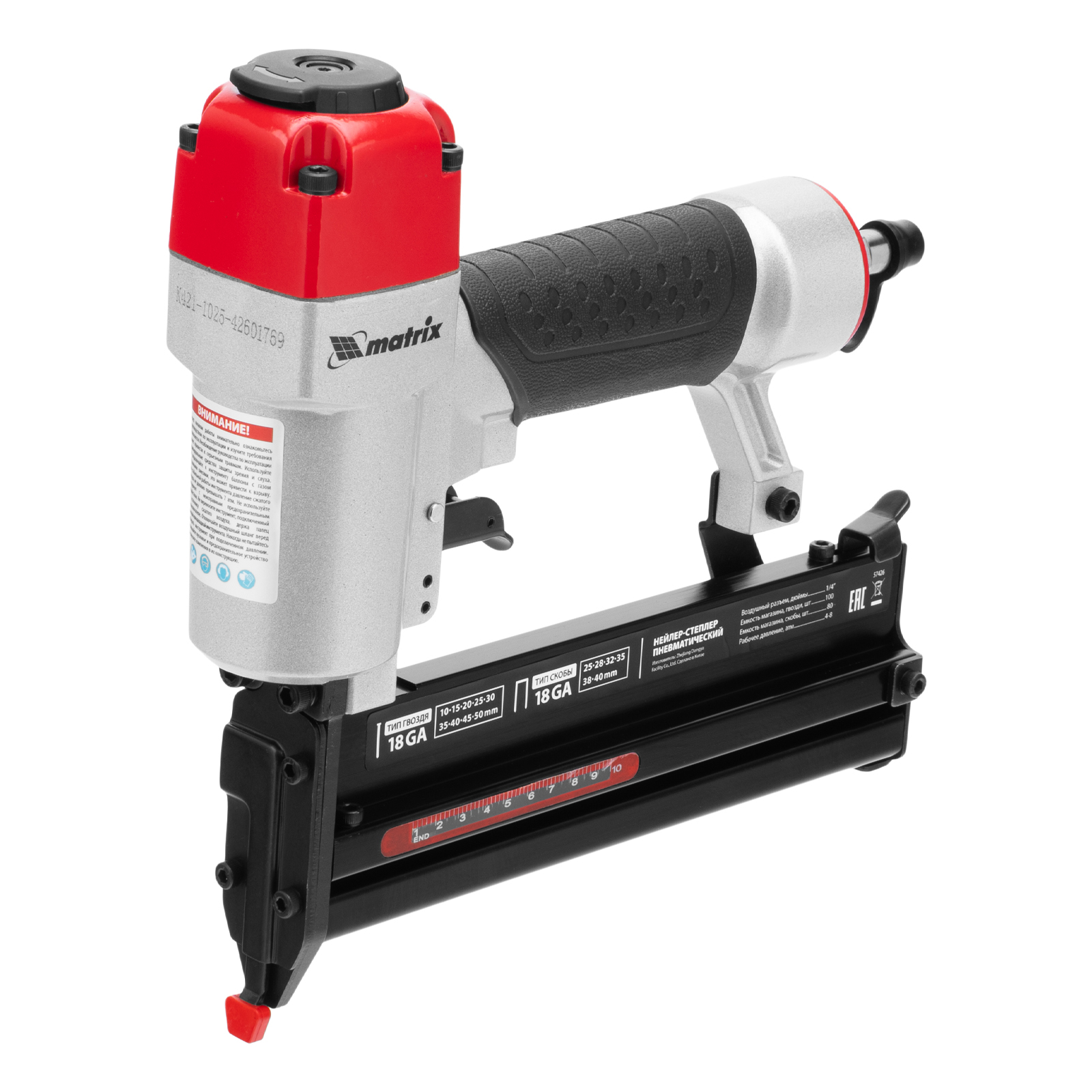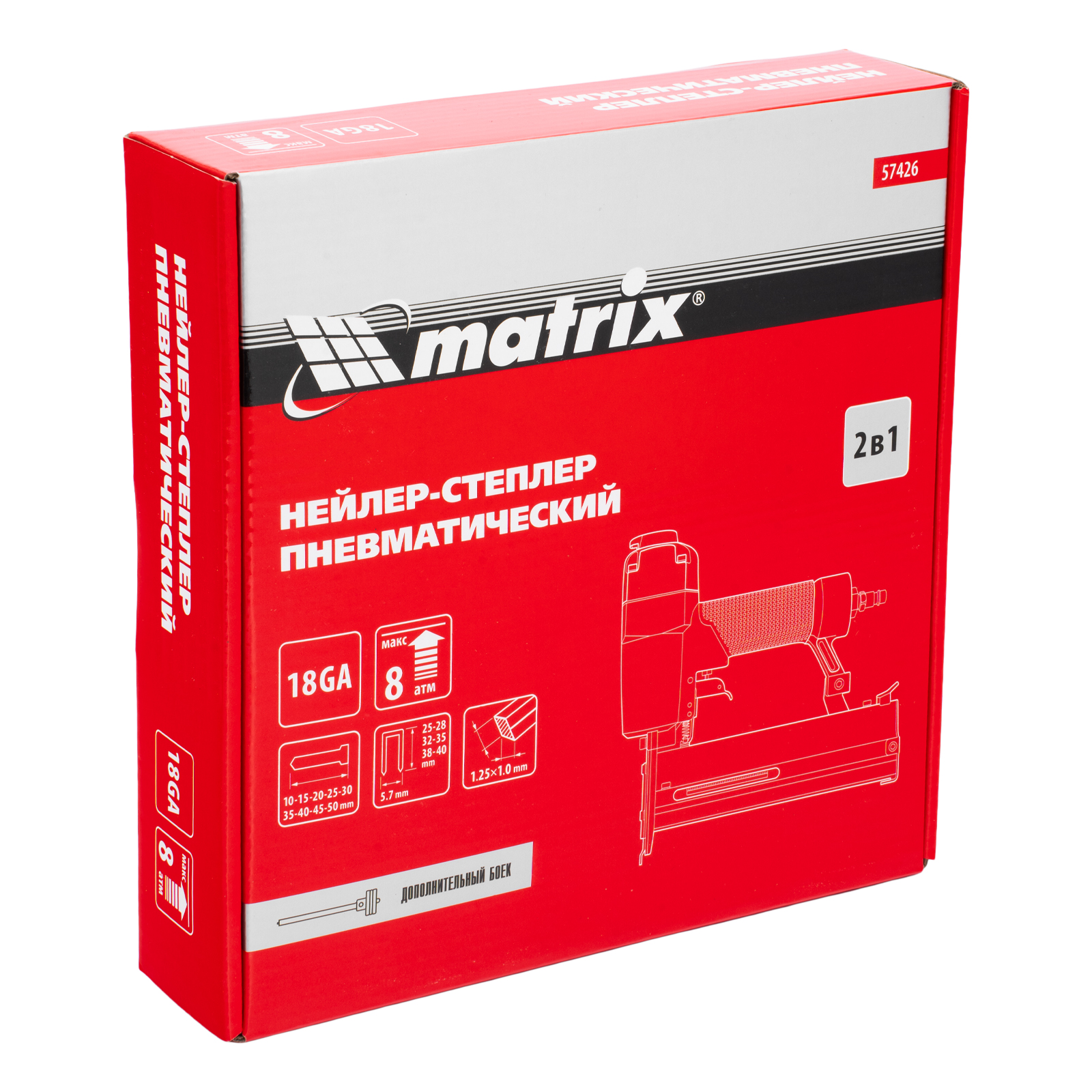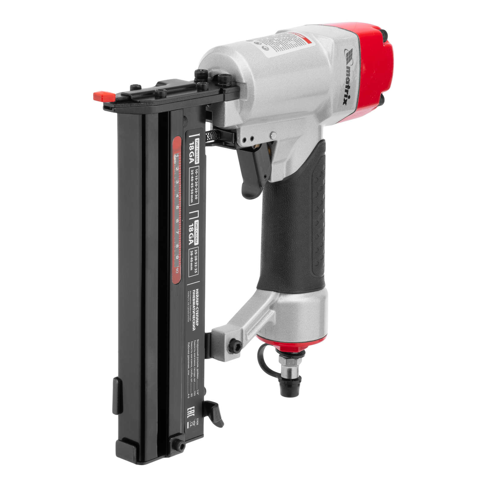 Пневматический нейлер-степлер 2 в 1 Matrix 57426 работает с двумя типами крепежей 18GA: гвоздями длиной 10-50 мм и скобами длиной 25-40 мм. Пригодится при сборке мебели и деревянных каркасов, для обшивки и утепления дома, при установке окон, дверей, плинтусов, напольных покрытий и для производства упаковки. Низкий расход воздуха 0,7 л/мин позволяет использовать инструмент с любыми типами компрессоров.
