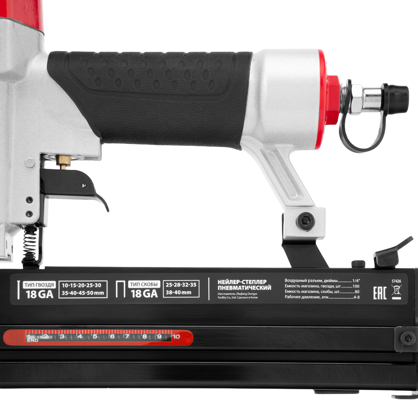 - Длительная работа без перебоев — в магазин вмещается 80 скоб или 100 гвоздей.