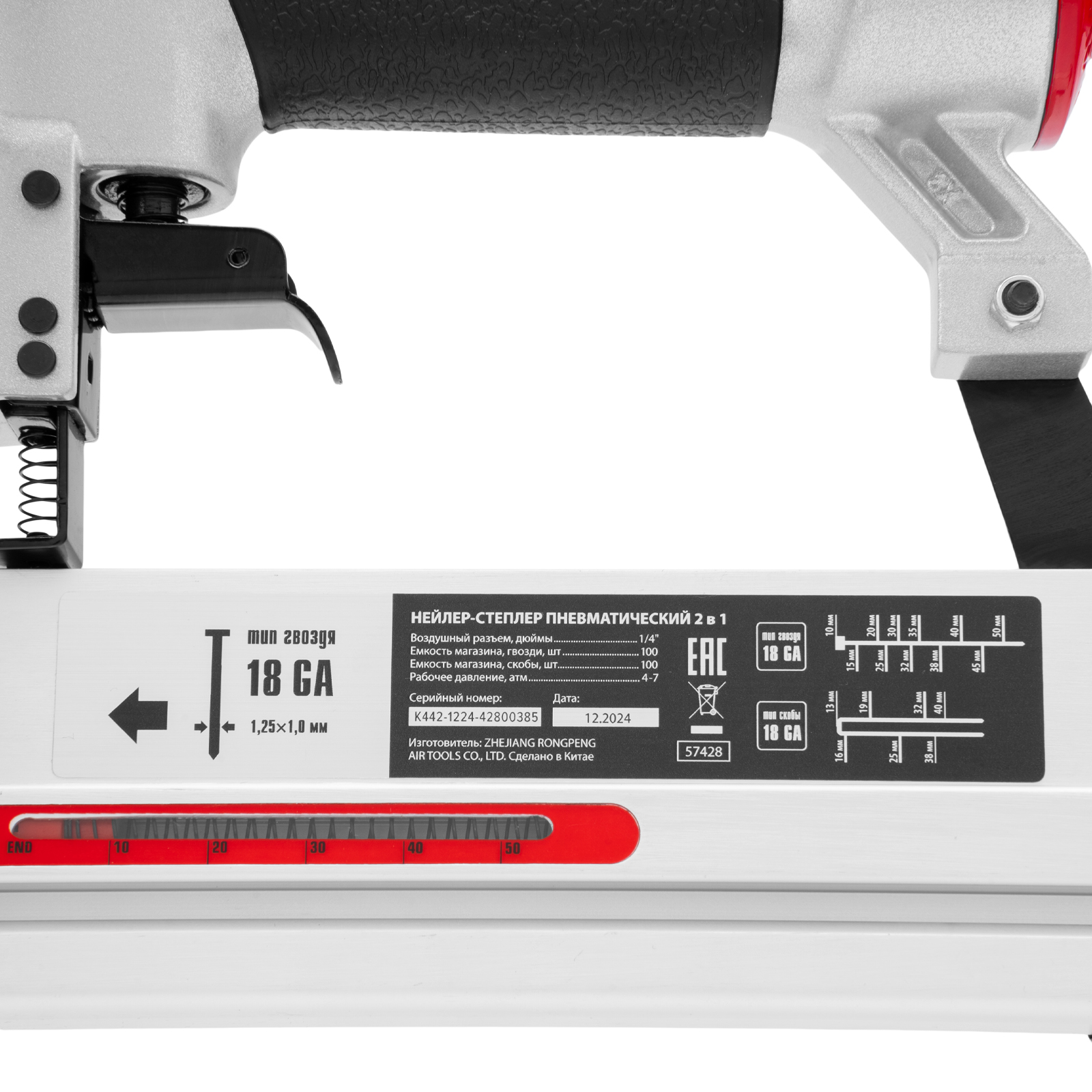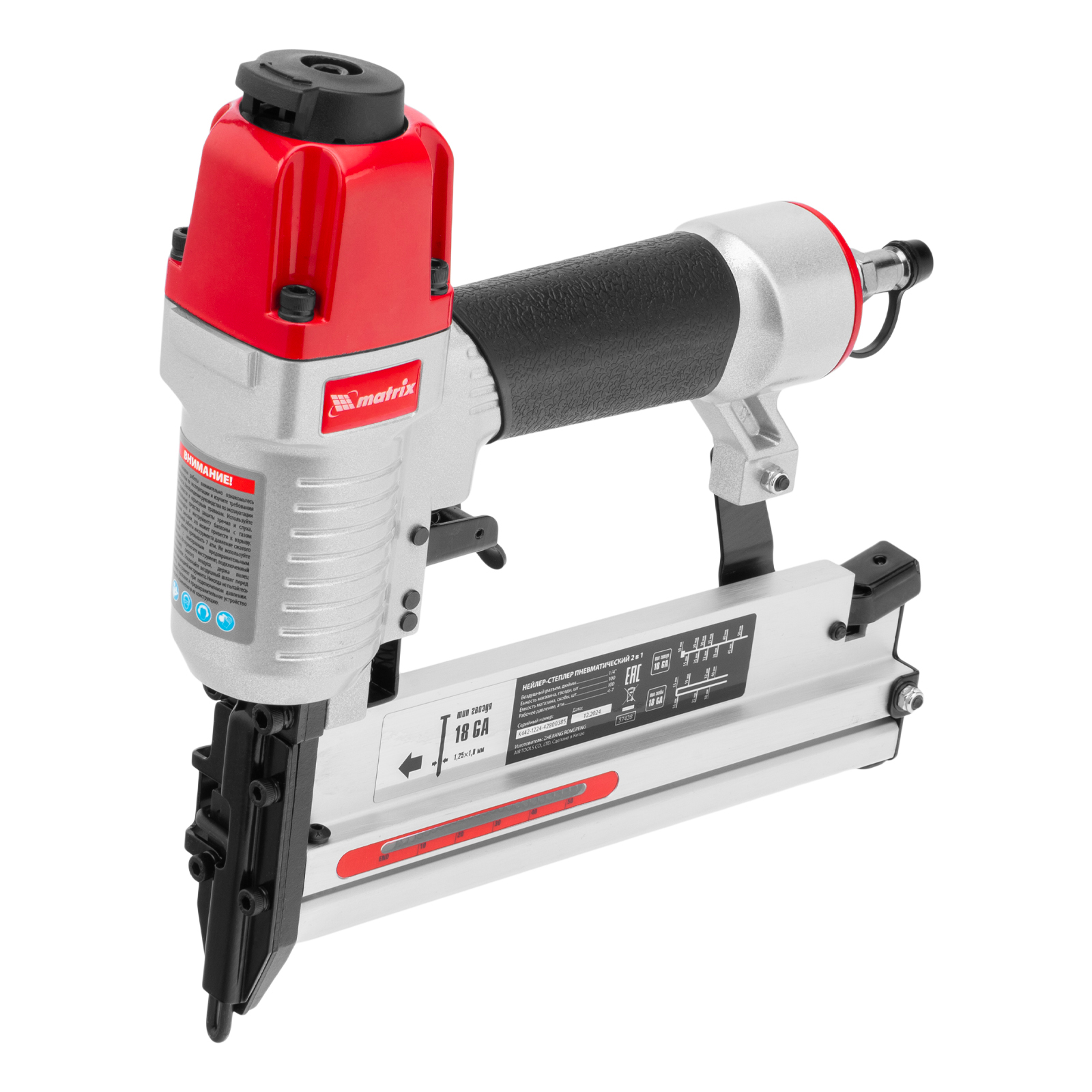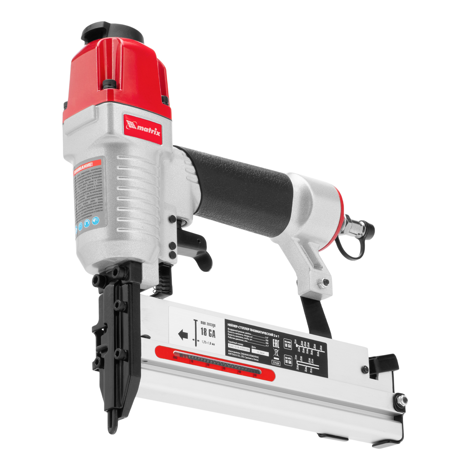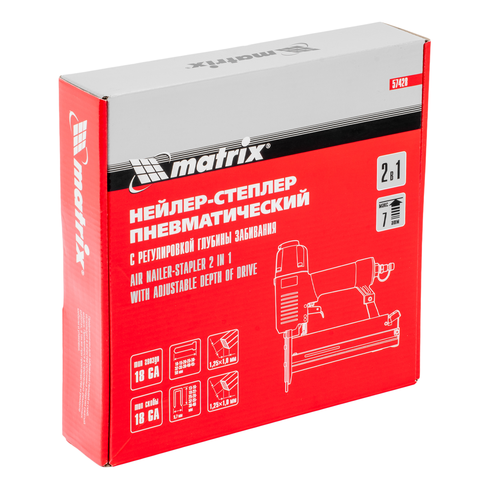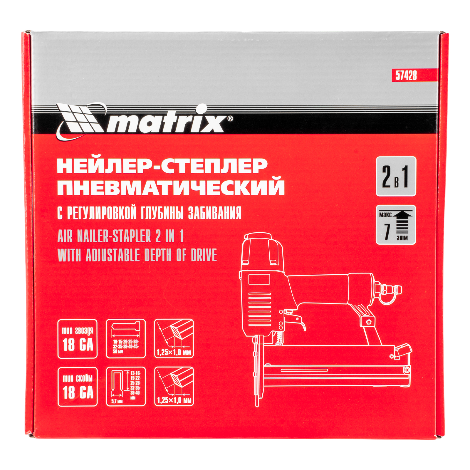 Пневматический нейлер-степлер Matrix 2 в 1 57428 с функцией регулировки глубины забивания предназначен для быстрого скрепления различных материалов гвоздями и скобами 18GA. Его используют для сборки мебели и деревянных каркасов, обшивки и утепления домов, монтажа окон, дверей, плинтусов или напольных покрытий. Нейлер-степлер подключается к любым типам компрессоров, т.к. расход воздуха составляет всего 0,7 л/мин.