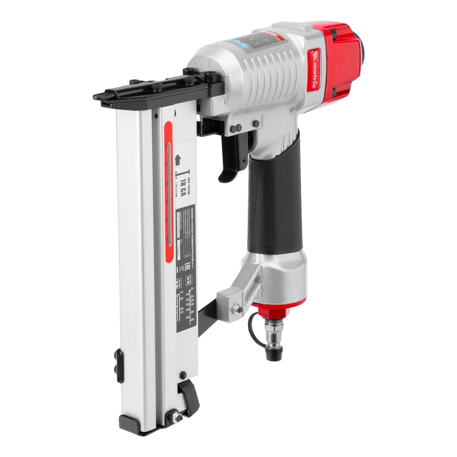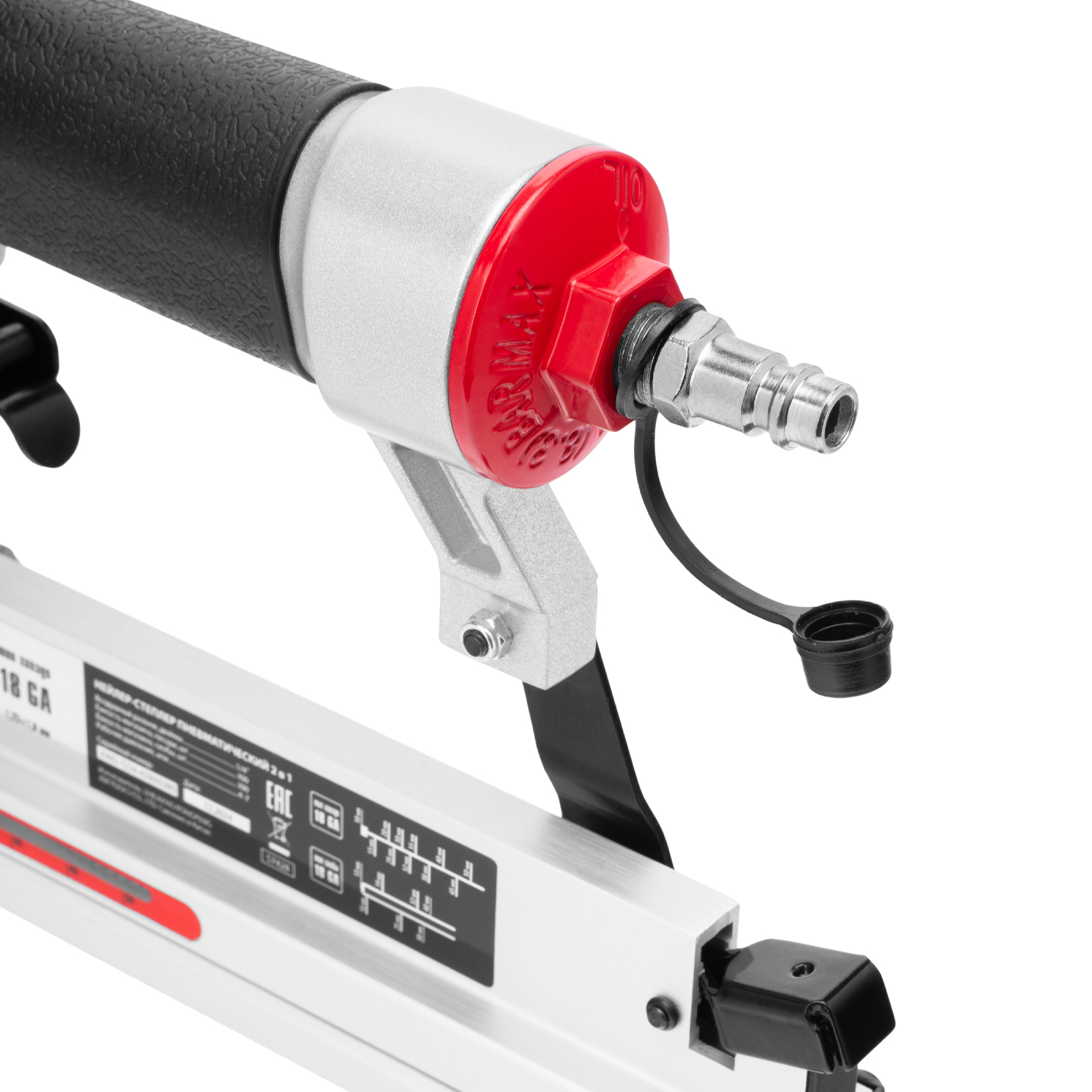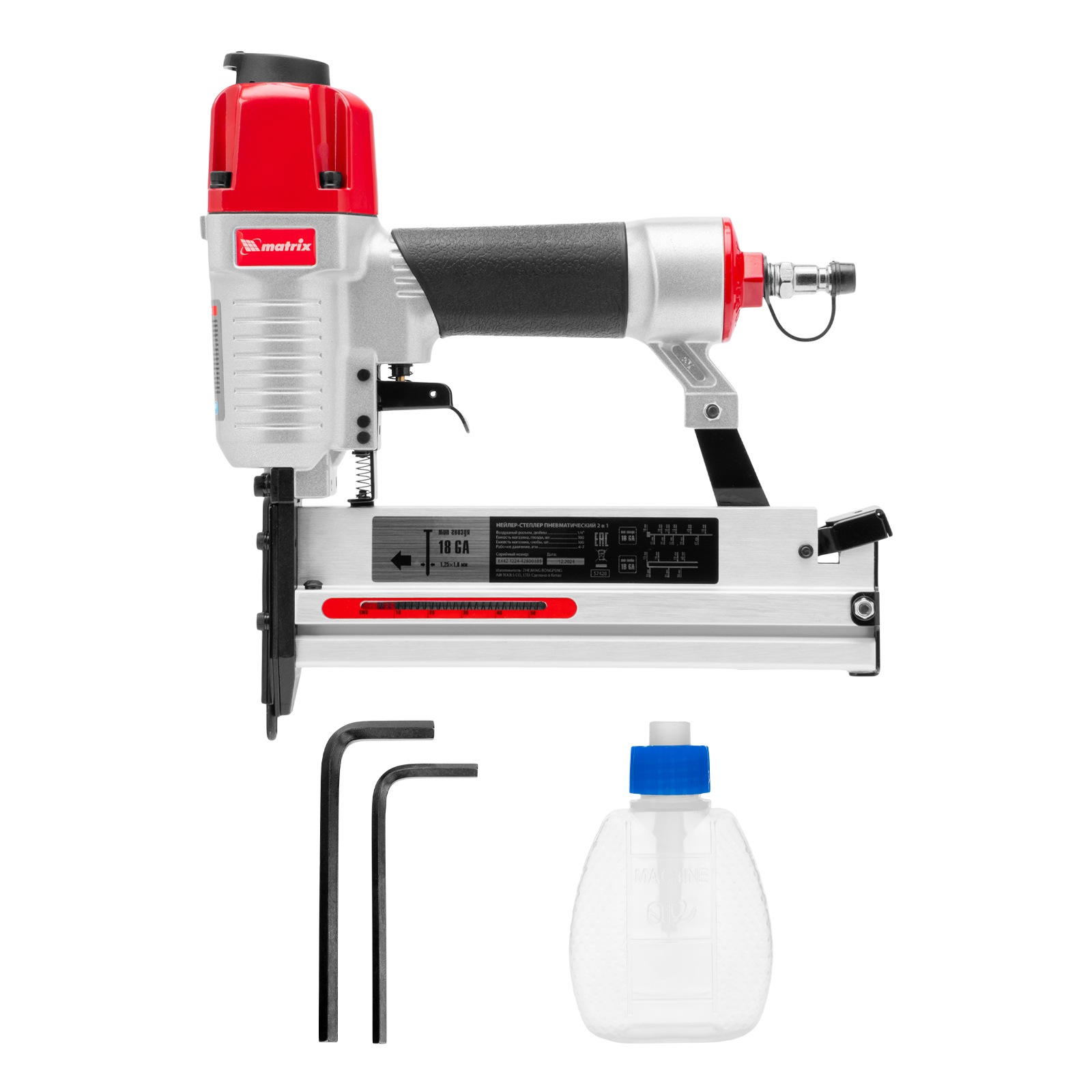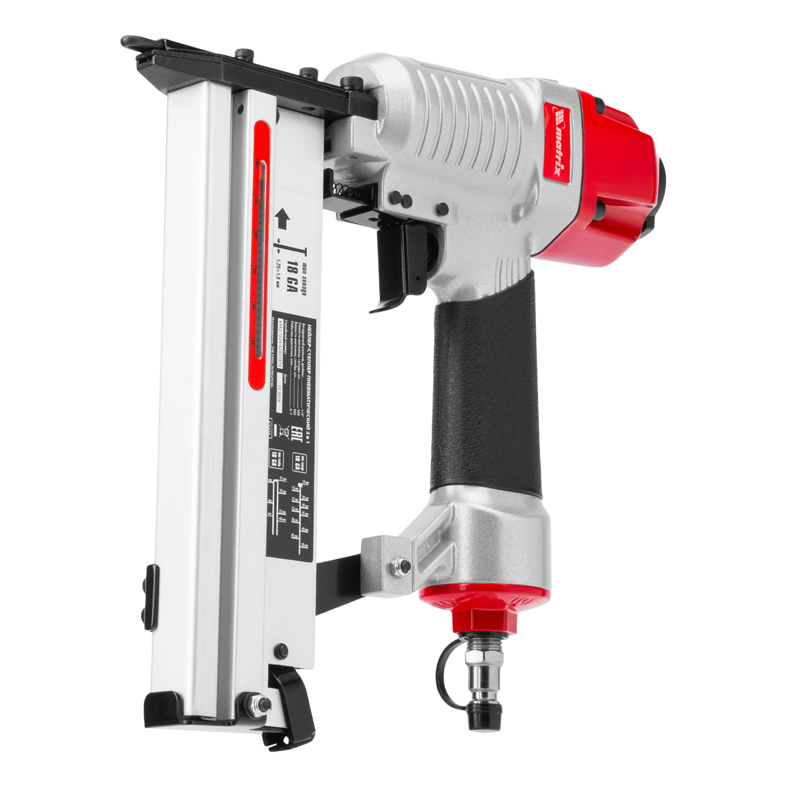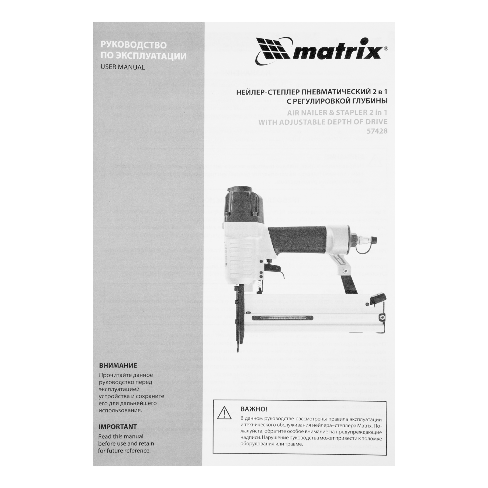 Пневматический нейлер-степлер Matrix 2 в 1 57428 с функцией регулировки глубины забивания предназначен для быстрого скрепления различных материалов гвоздями и скобами 18GA. Его используют для сборки мебели и деревянных каркасов, обшивки и утепления домов, монтажа окон, дверей, плинтусов или напольных покрытий. Нейлер-степлер подключается к любым типам компрессоров, т.к. расход воздуха составляет всего 0,7 л/мин.