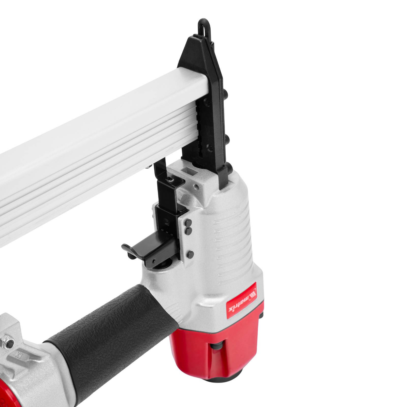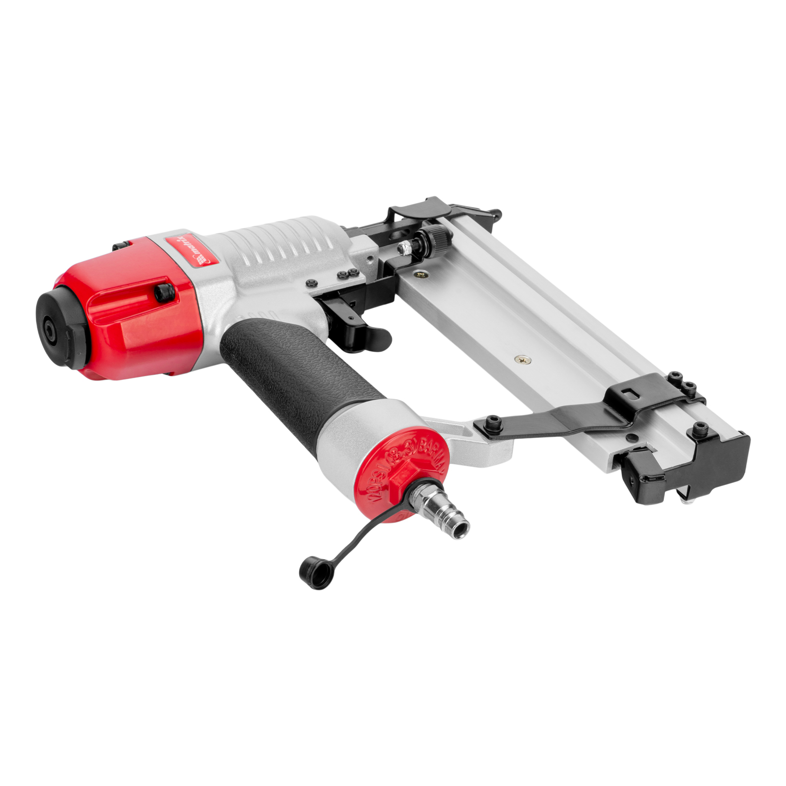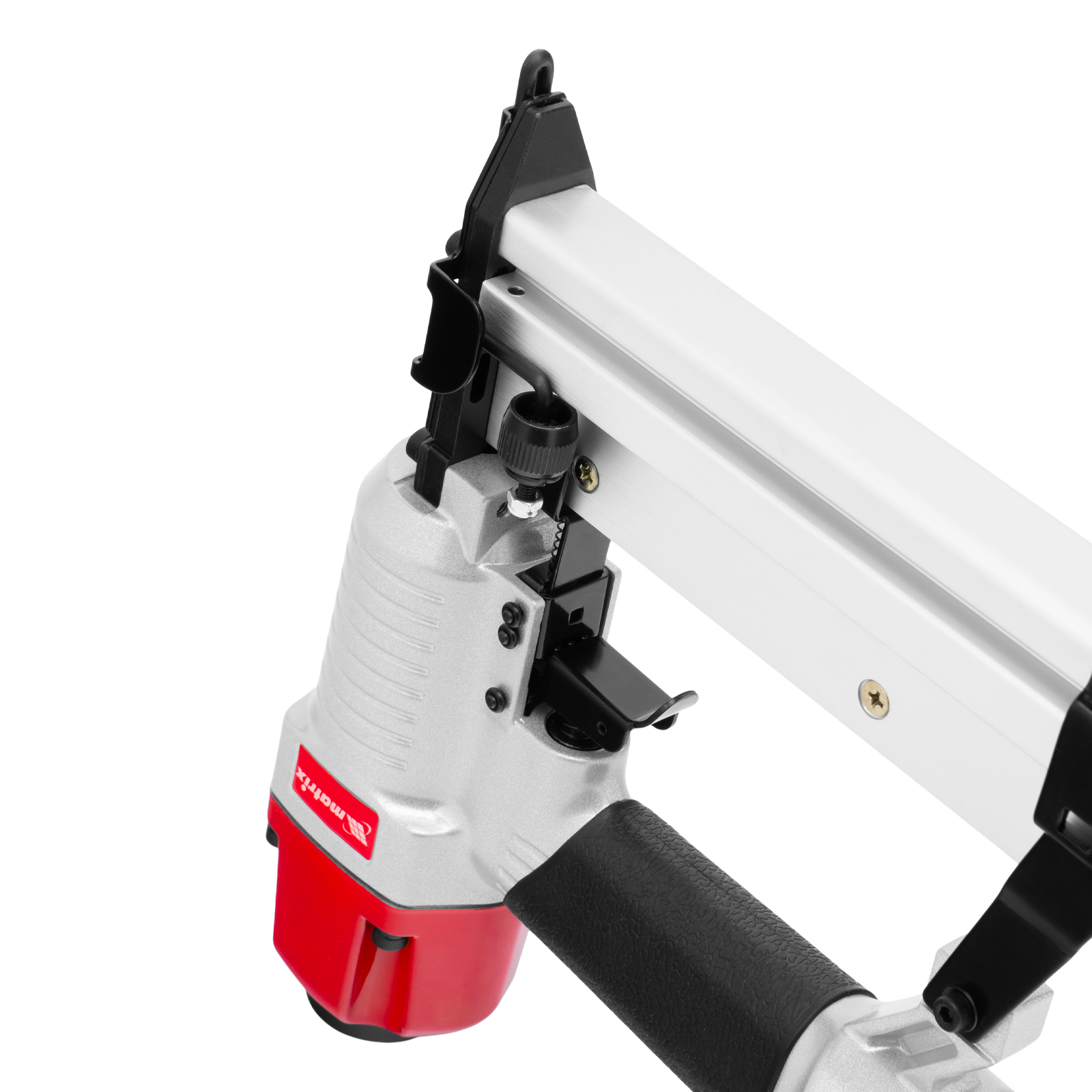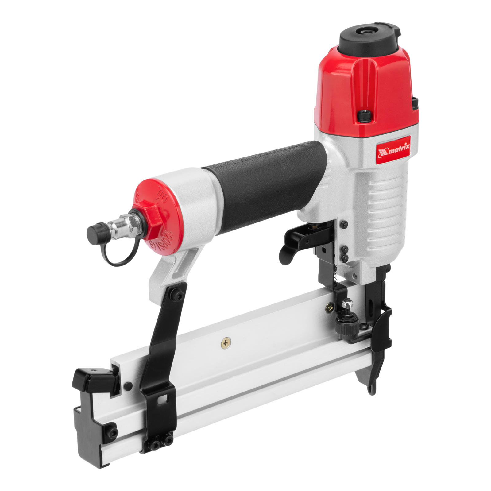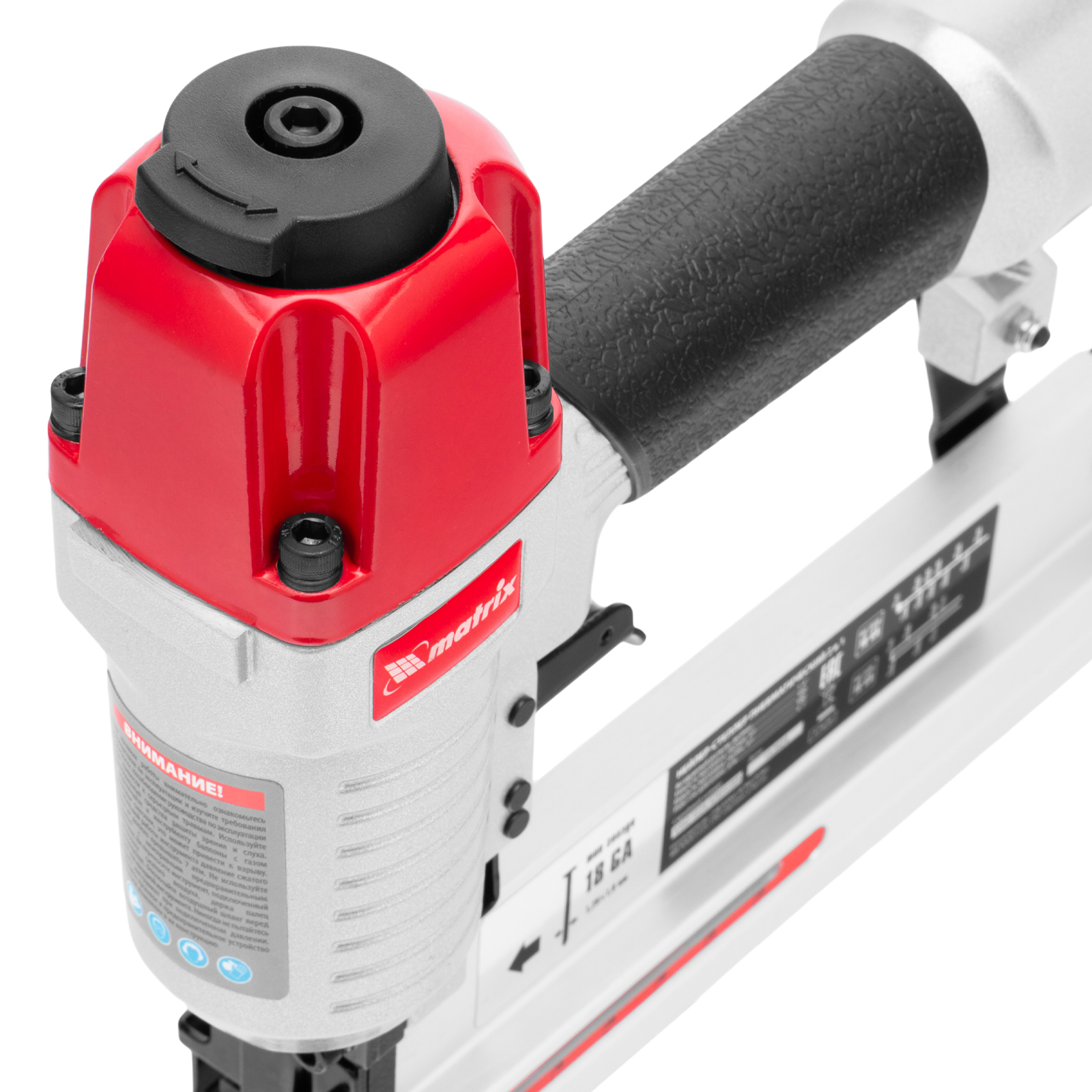 Пневматический нейлер-степлер Matrix 2 в 1 57428 с функцией регулировки глубины забивания предназначен для быстрого скрепления различных материалов гвоздями и скобами 18GA. Его используют для сборки мебели и деревянных каркасов, обшивки и утепления домов, монтажа окон, дверей, плинтусов или напольных покрытий. Нейлер-степлер подключается к любым типам компрессоров, т.к. расход воздуха составляет всего 0,7 л/мин.