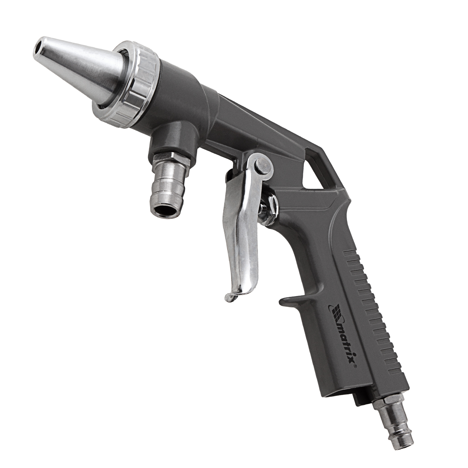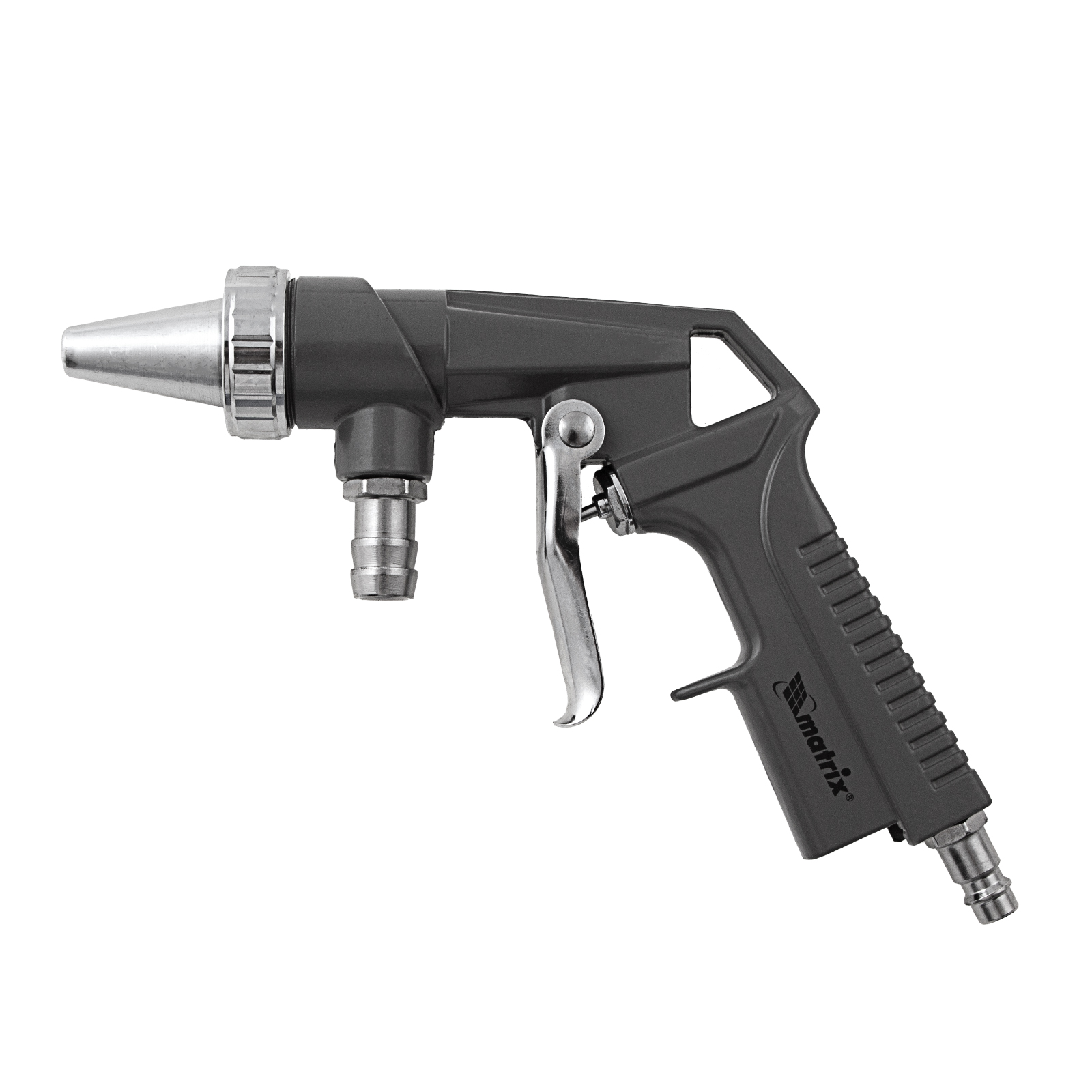 Пневматический пескоструйный пистолет Matrix 57328 со шлангом для забора абразива помогает очистить металлические поверхности от окалины, грязи, налета ржавчины, также используется для шлифовки и декорирования. Воздушно-песчаная смесь подается под давлением 4 бар через сопло диаметром 6 мм, расход воздуха составляет 600 л/мин. Инструмент пригодится при проведении строительных и ремонтных работ, будет полезен в автомастерской.