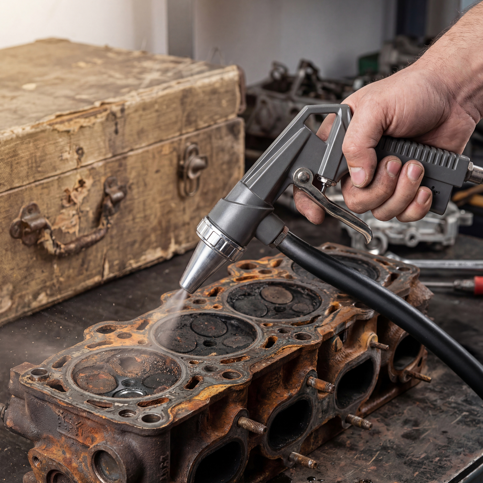 - Обработка поверхностей большой площади — абразив подается из отдельной емкости.