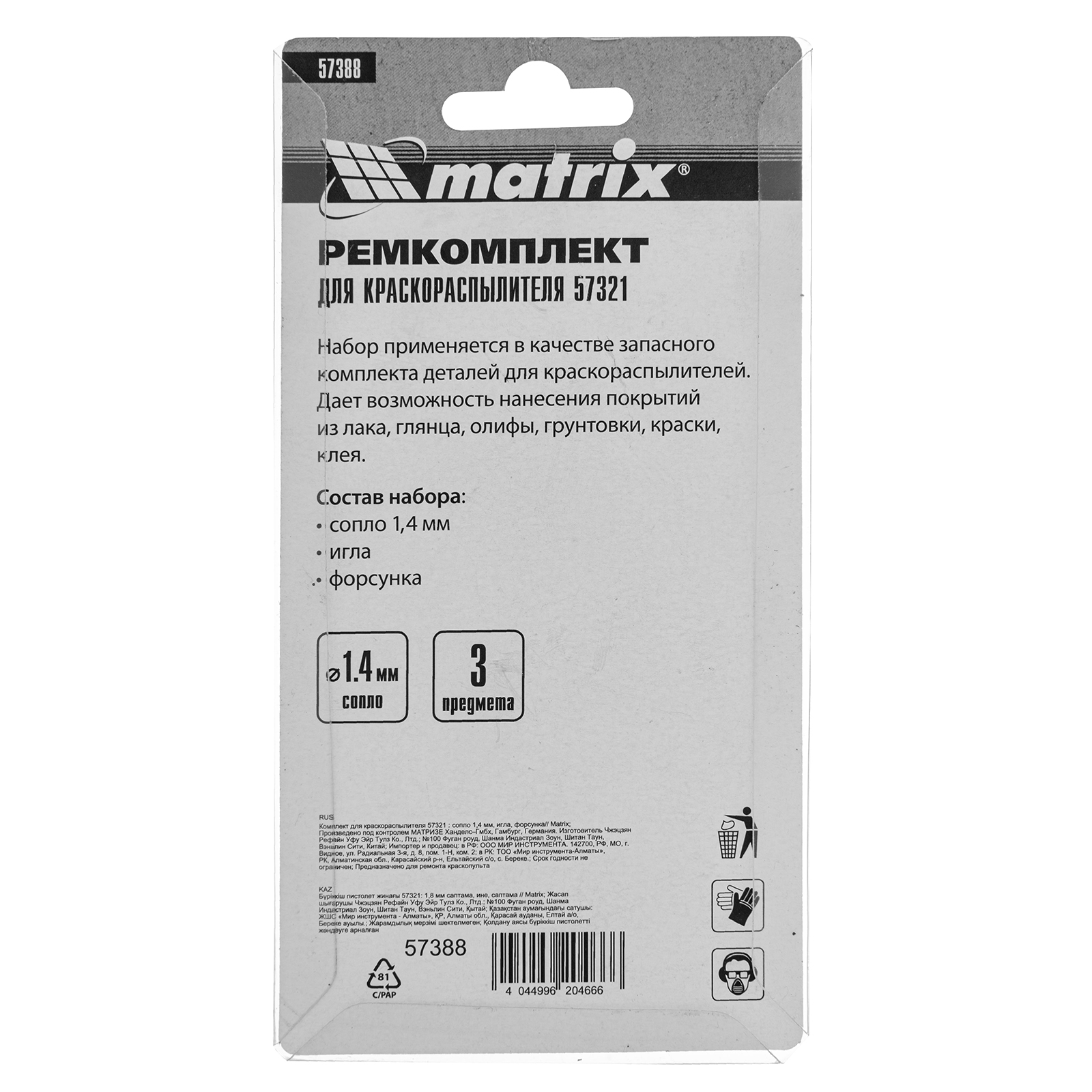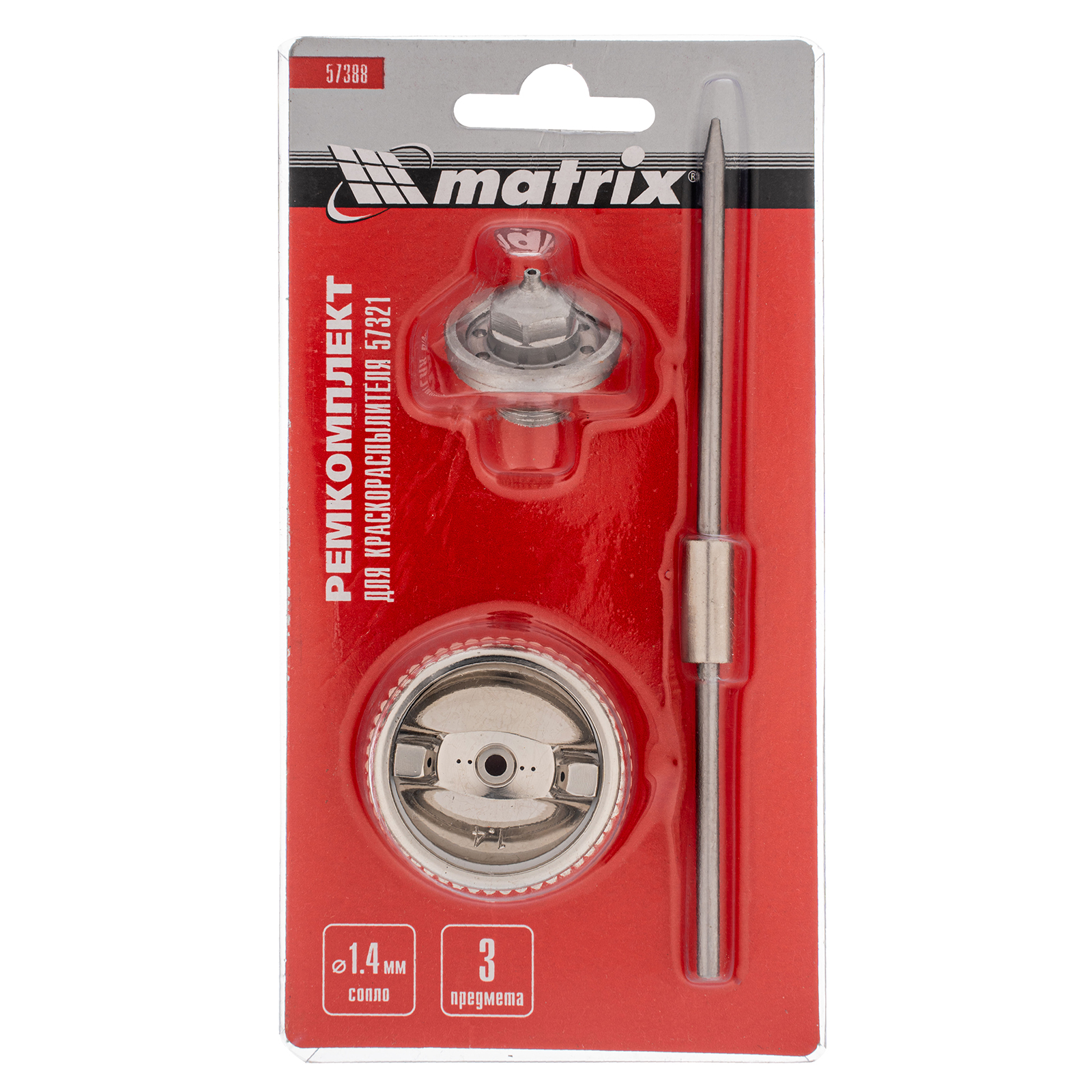 Комплект Matrix 57388 для краскораспылителя Matrix 57321 включает в себя 3 предмета: сопло диаметром 1,4 мм, иглу и форсунку. Их можно использовать для ремонта инструмента или расширения его функциональных возможностей.