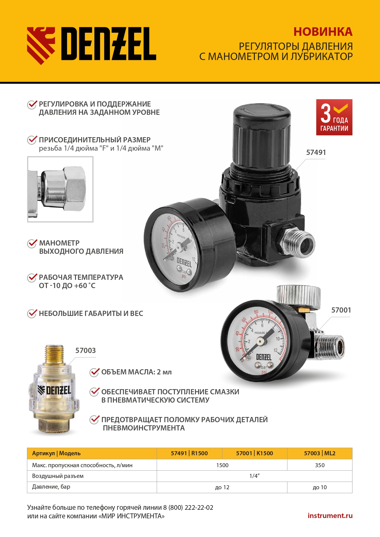 Лубрикатор Denzel ML2 57003 с рабочим давлением 10 бар и присоединительным размером 1/4" имеет пропускную способность 350 л/мин и обеспечивает поступление смазки в пневматическую систему. Предотвращает преждевременный износ и поломку рабочих деталей пневмоинструмента: гайковерта, дрели, молотка и т.д.