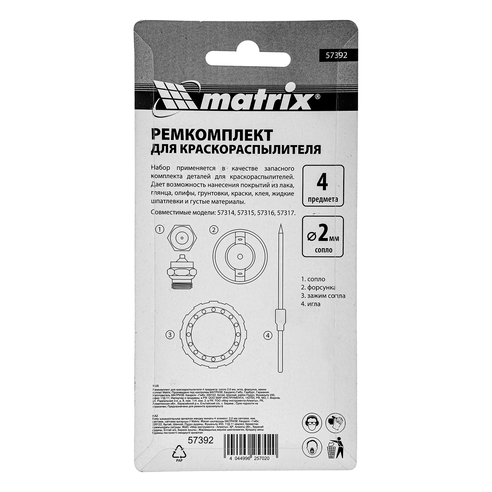 Ремкомплект для краскораспылителя Matrix 57392 состоит из 4 предметов: сопла диаметром 2 мм, иглы, форсунки и зажима сопла. Набор можно использовать для восстановления работоспособности краскопульта или расширения возможностей его использования. Совместимые краскопульты Matrix 57314, 57315, 57316, 57317.