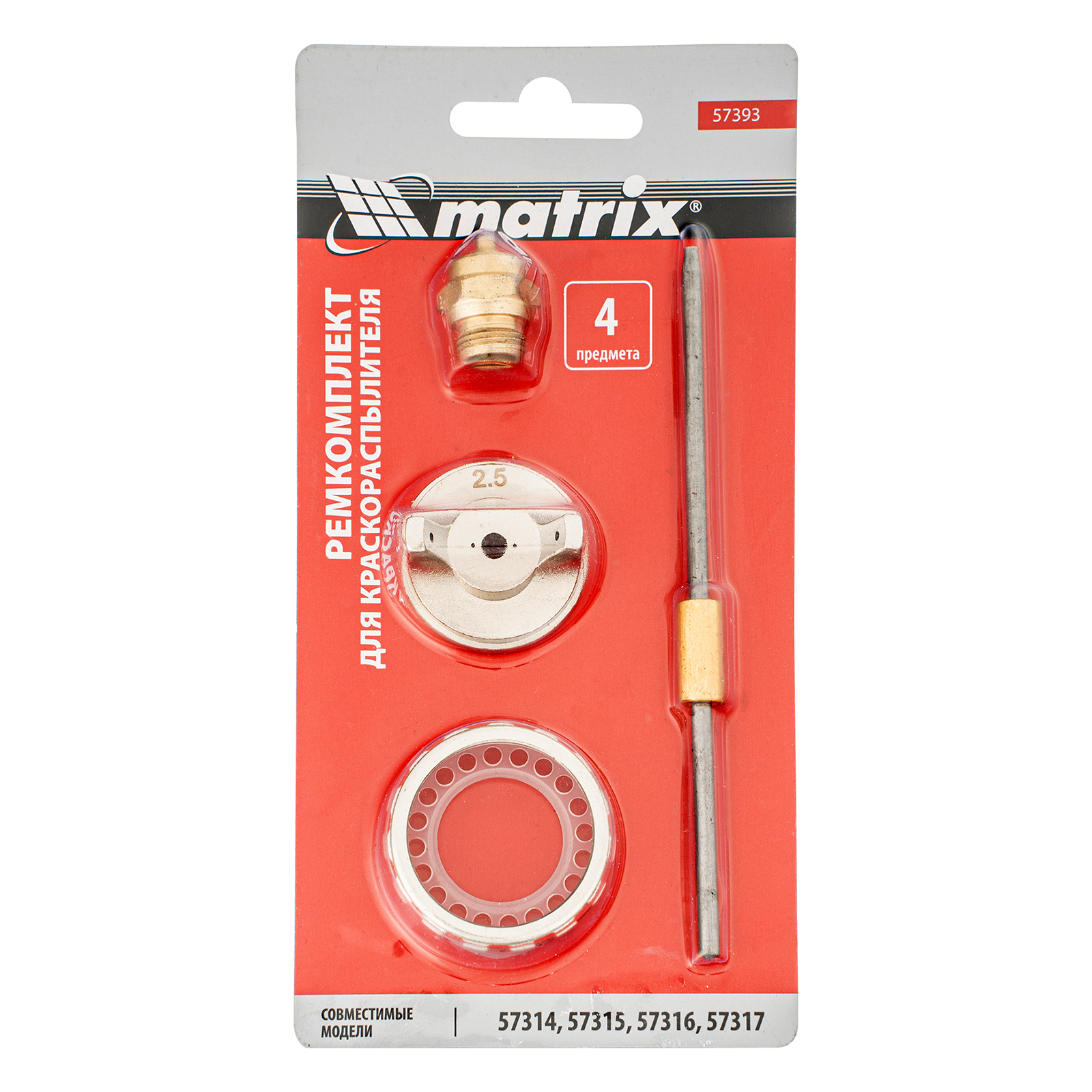 Ремкомплект для краскораспылителя Matrix 57393 состоит из 4 предметов: сопла диаметром 2,5 мм, иглы, форсунки и зажима сопла. Набор можно использовать для восстановления работоспособности краскопульта или расширения возможностей его использования. Совместимые краскопульты Matrix 57314, 57315, 57316, 57317.