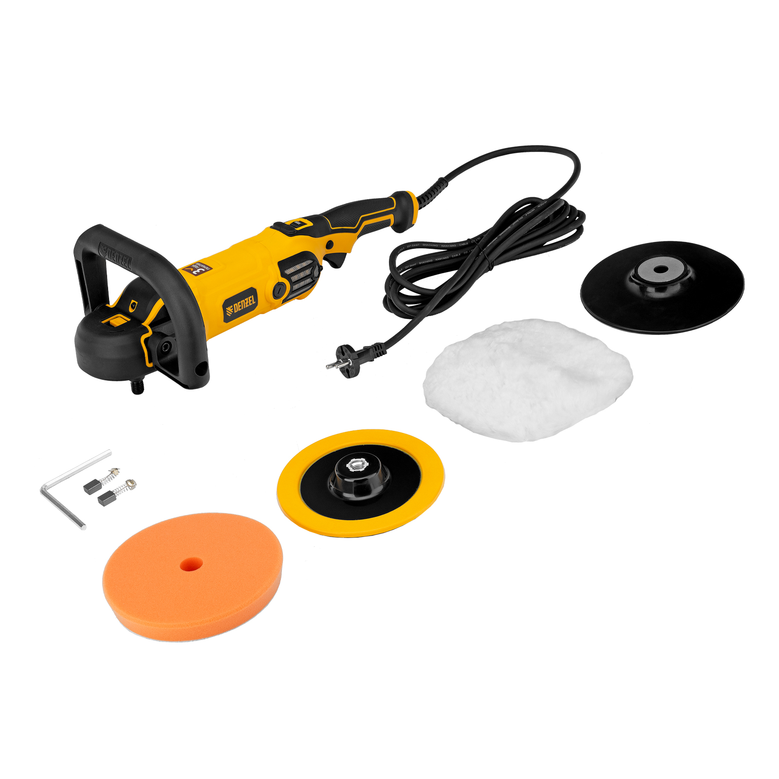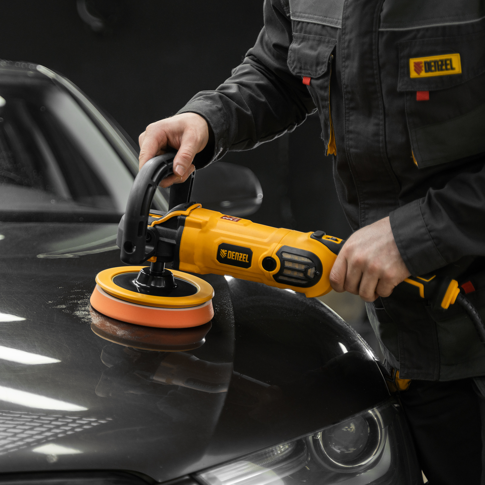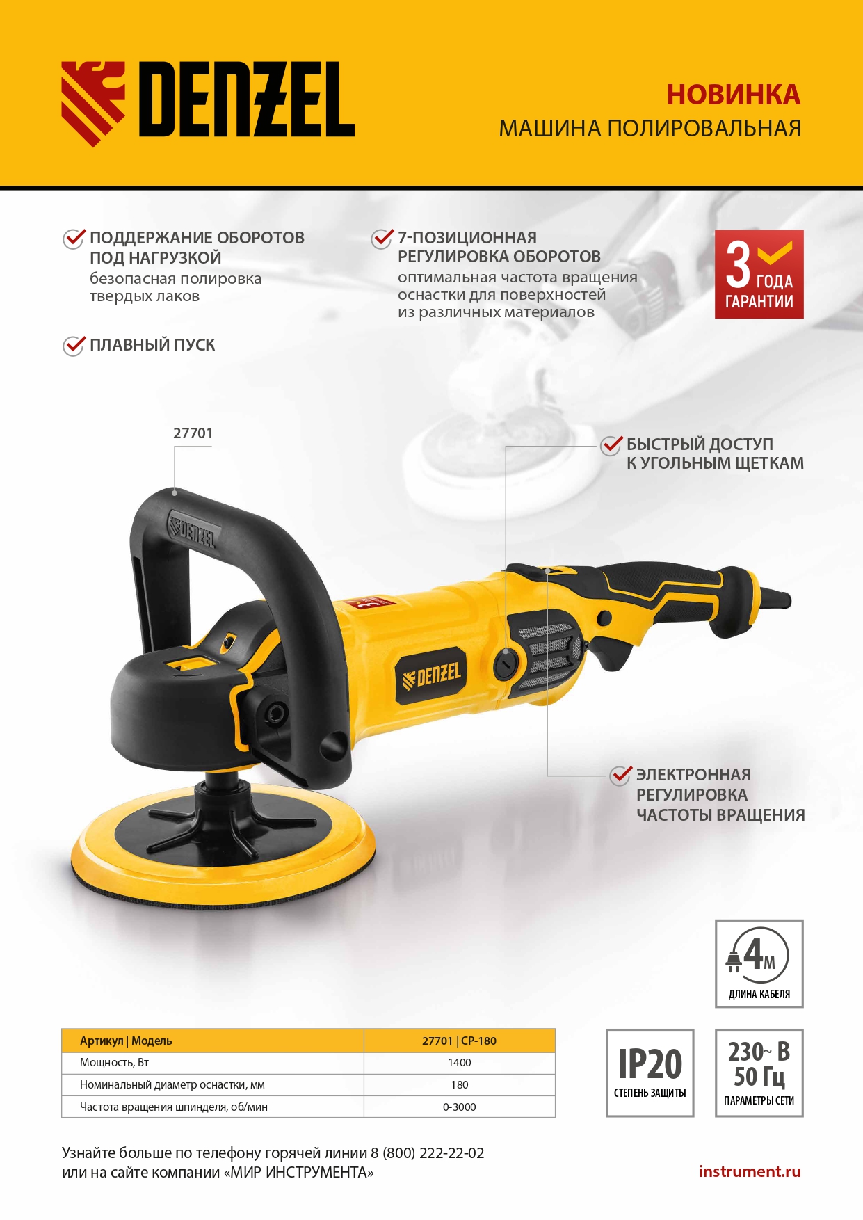 Полировальная машина Denzel CP-180 27701 мощностью 1400 Вт обеспечивает частоту вращения шпинделя 0-3000 об/мин и совместима с оснасткой диаметром 180 мм. Используется для снятия старого лакокрасочного покрытия, подготовки поверхности к покраске и финишной полировки лакированных, деревянных и других поверхностей, придает им гладкость и блеск. Благодаря 7-позиционной регулировке оборотов можно выбрать оптимальный режим для обработки поверхностей из различных материалов. Машина пригодится в мастерской и на СТО.