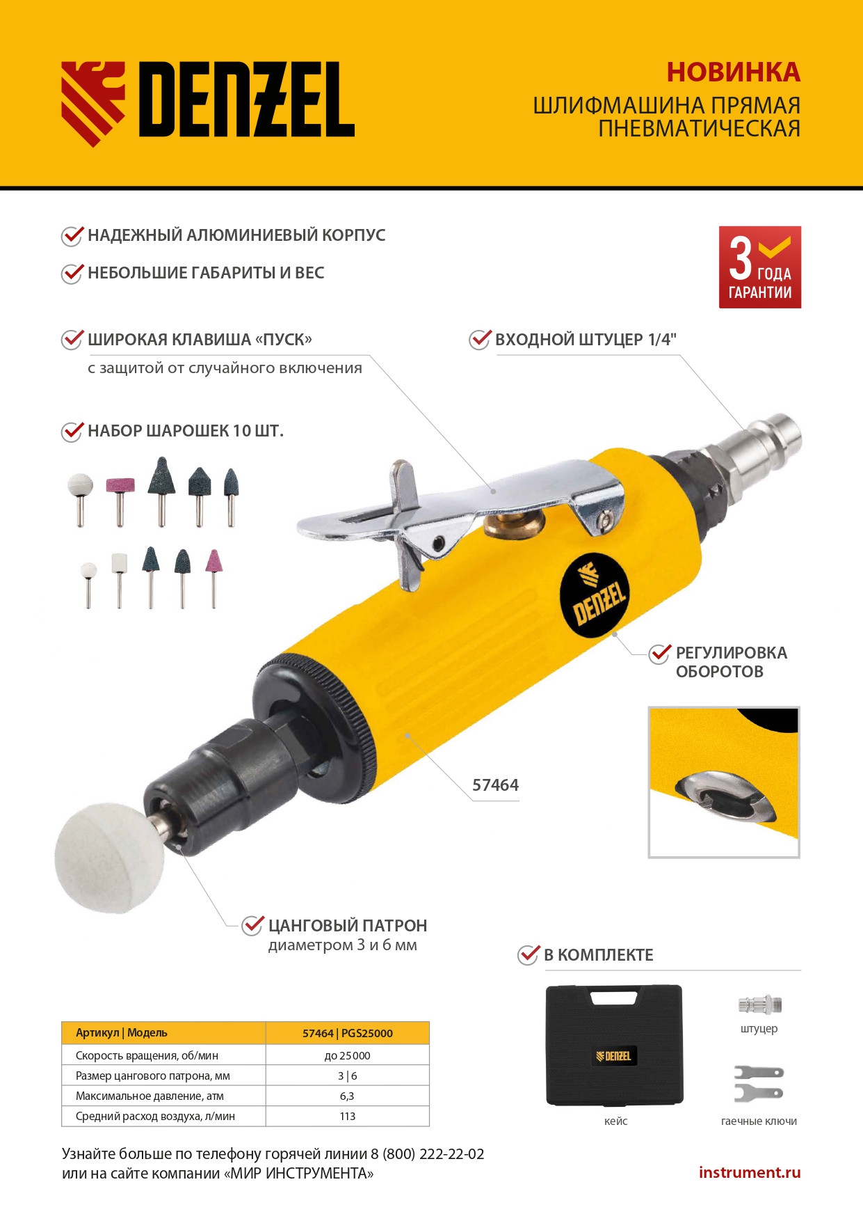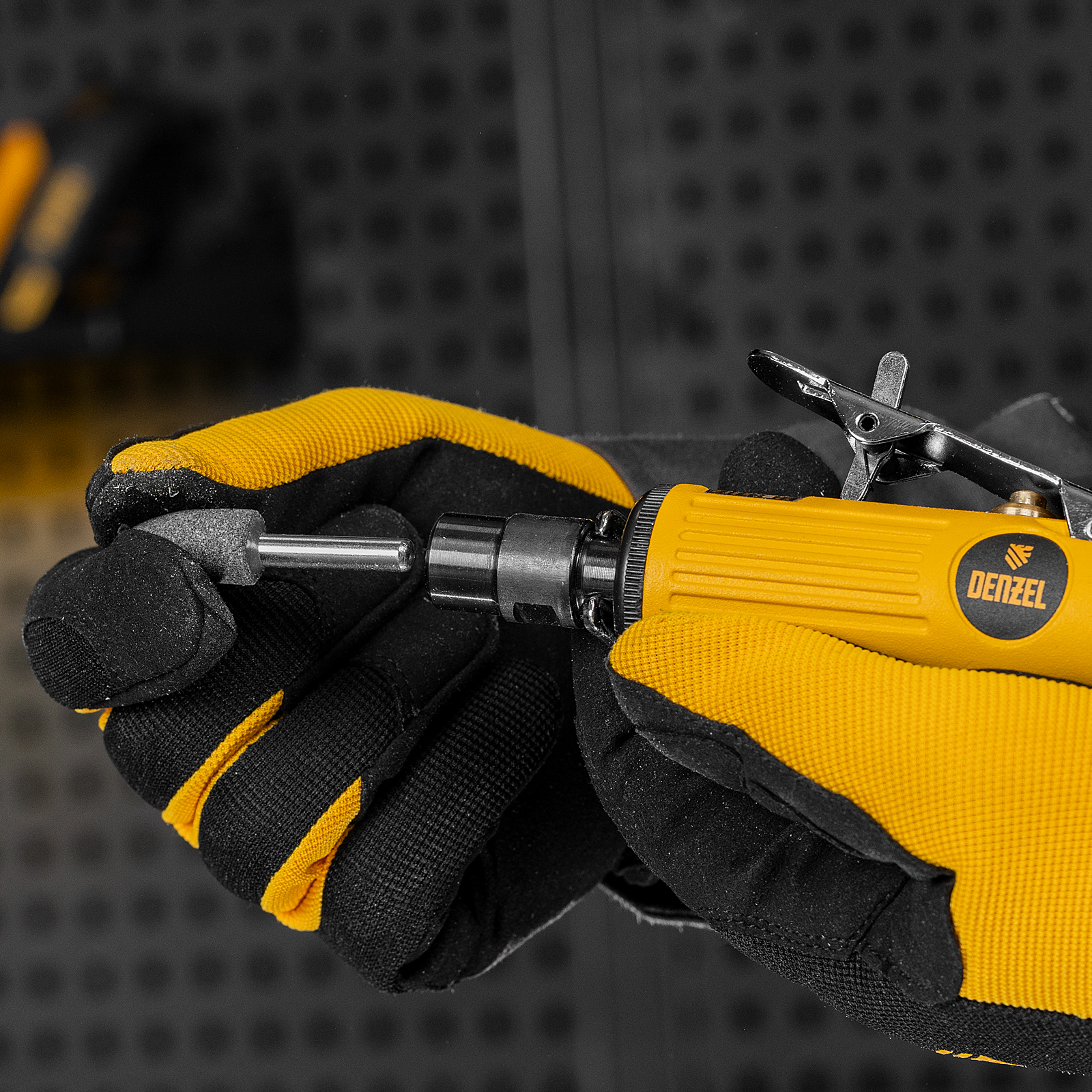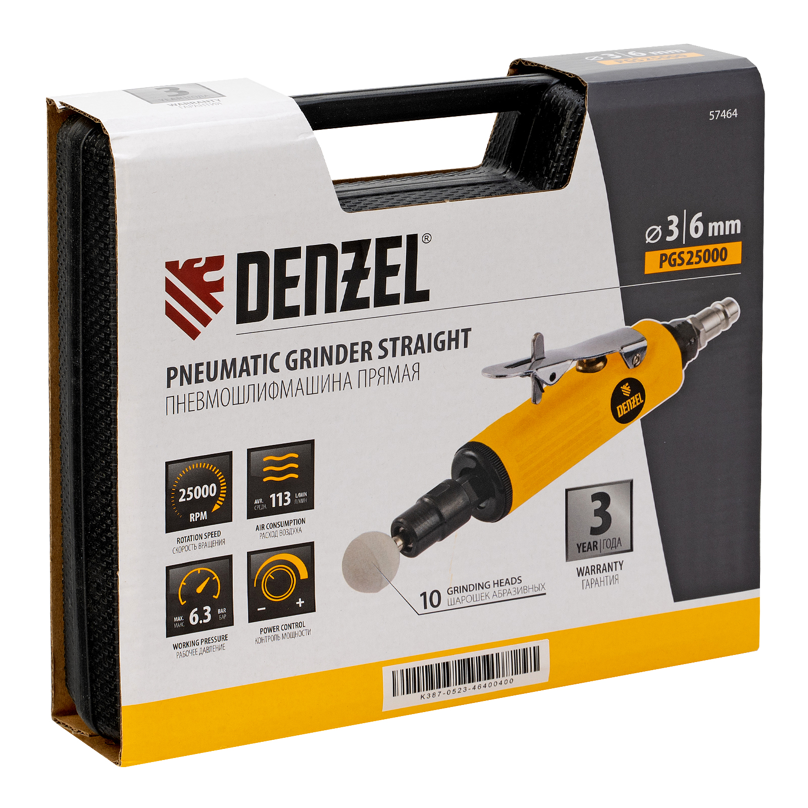 Прямая пневмошлифмашина Denzel PGS25000 57464 поставляется с 10 шлифовальными камнями и цангами 3 и 6 мм, потребляет 113 л сжатого воздуха в минуту и обеспечивает скорость вращения оснастки 25000 об/мин. Используется для обработки изделий из пластика, древесины и металла. Позволяет удалять заусенцы, зачищать сварные швы, снимать тонкий слой ржавчины или лакокрасочного покрытия на небольших участках, выполнять шлифовальные работы. Инструмент оптимален для работы в условиях ограниченного пространства, подходит для профессионального и бытового использования.