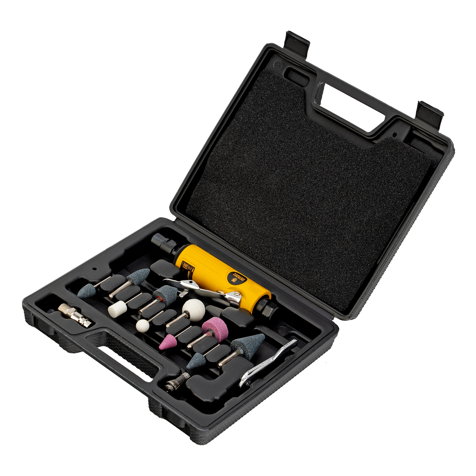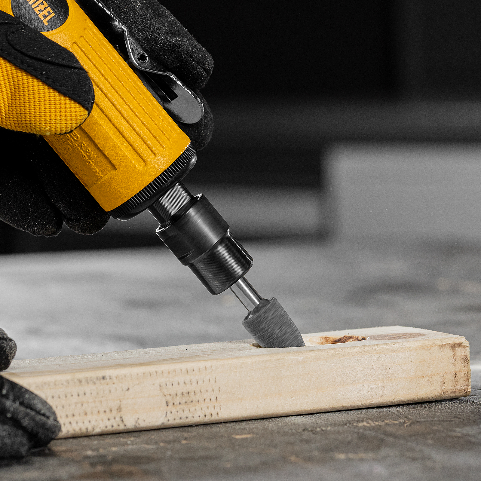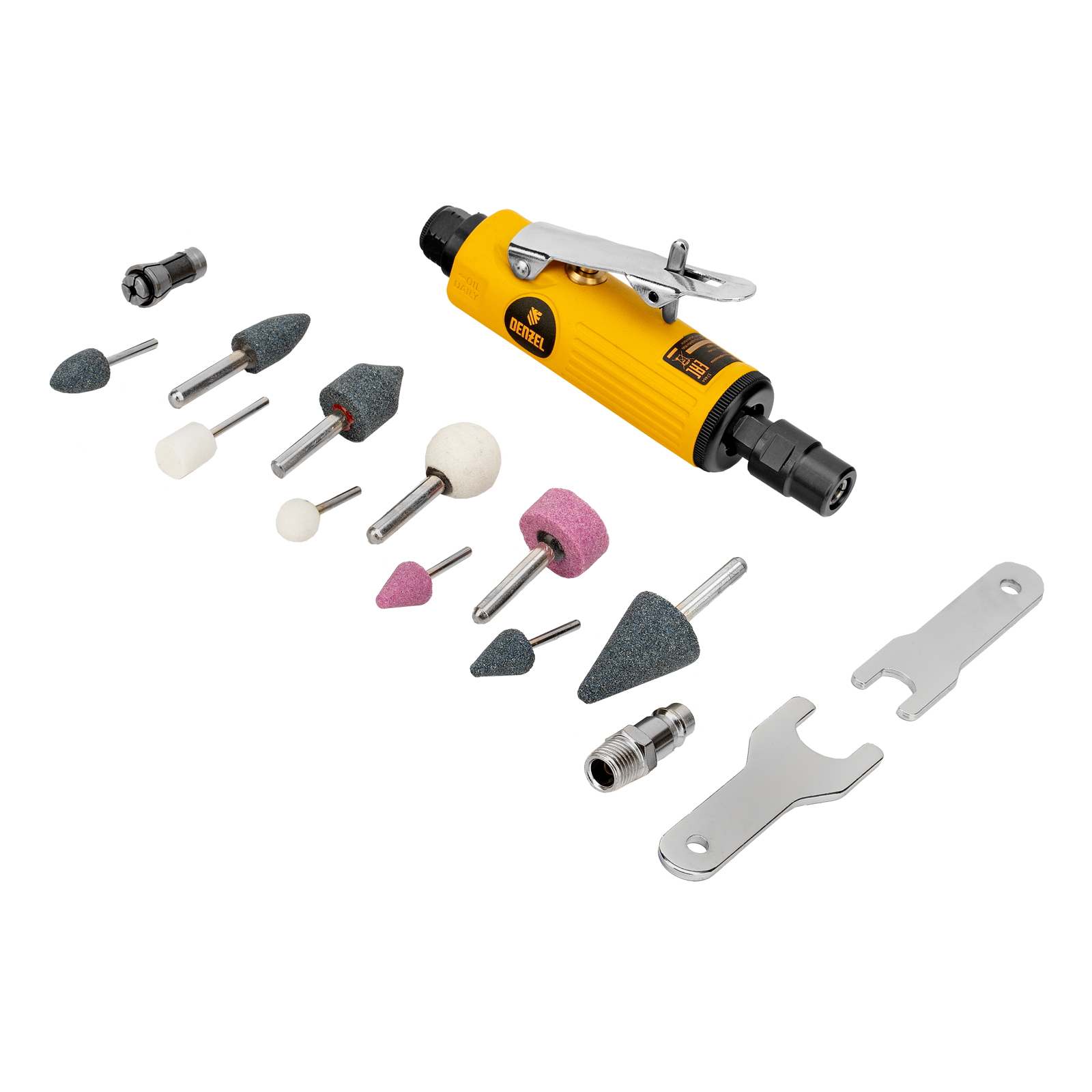 Прямая пневмошлифмашина Denzel PGS25000 57464 поставляется с 10 шлифовальными камнями и цангами 3 и 6 мм, потребляет 113 л сжатого воздуха в минуту и обеспечивает скорость вращения оснастки 25000 об/мин. Используется для обработки изделий из пластика, древесины и металла. Позволяет удалять заусенцы, зачищать сварные швы, снимать тонкий слой ржавчины или лакокрасочного покрытия на небольших участках, выполнять шлифовальные работы. Инструмент оптимален для работы в условиях ограниченного пространства, подходит для профессионального и бытового использования.
