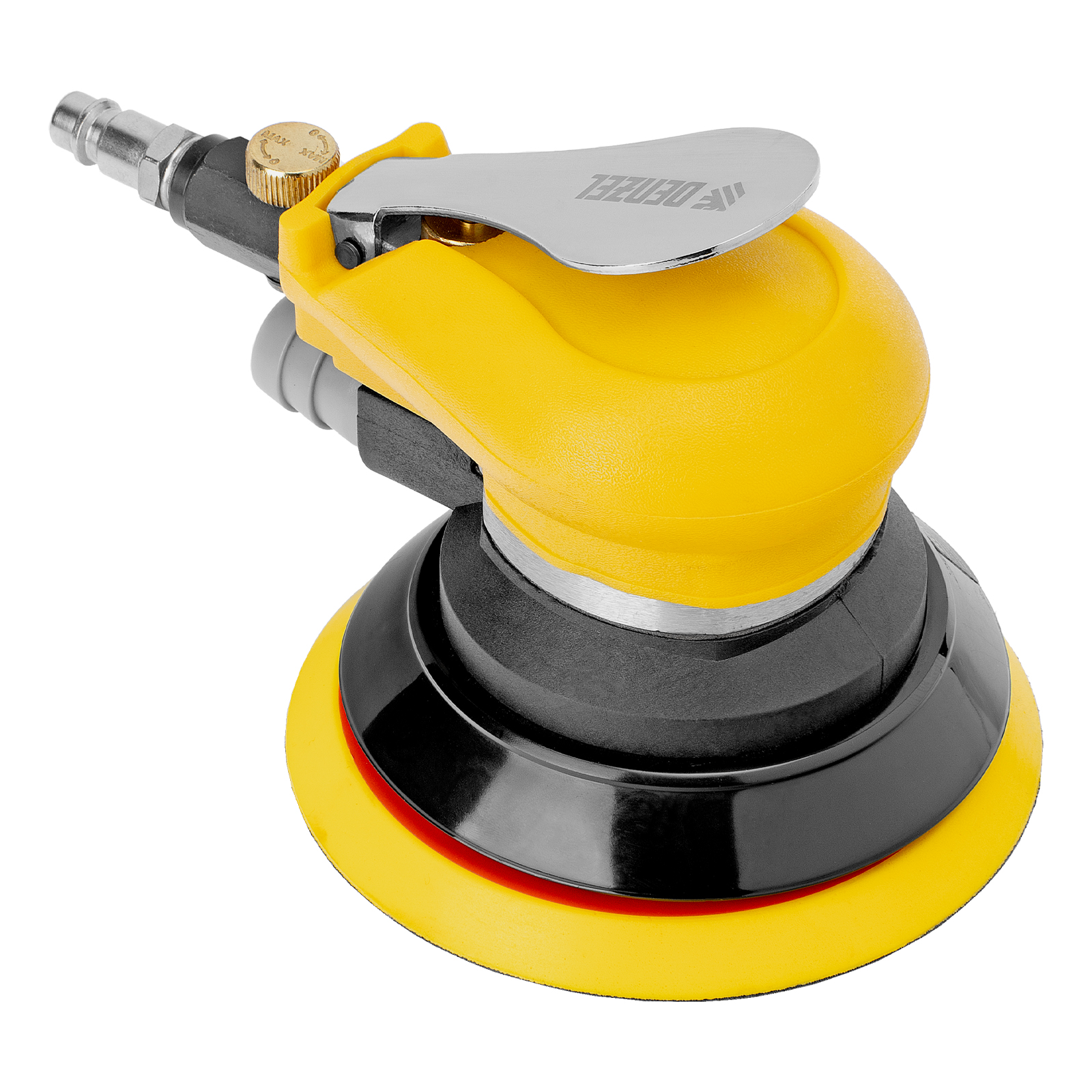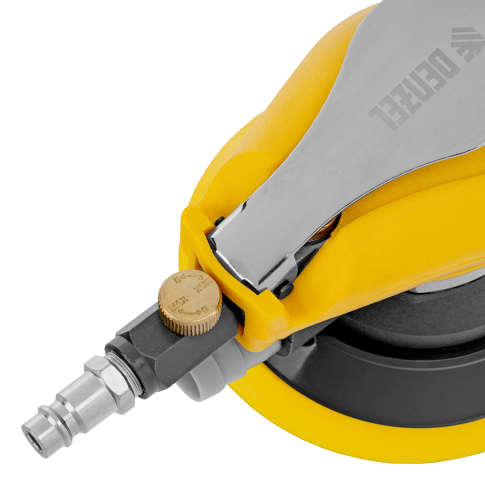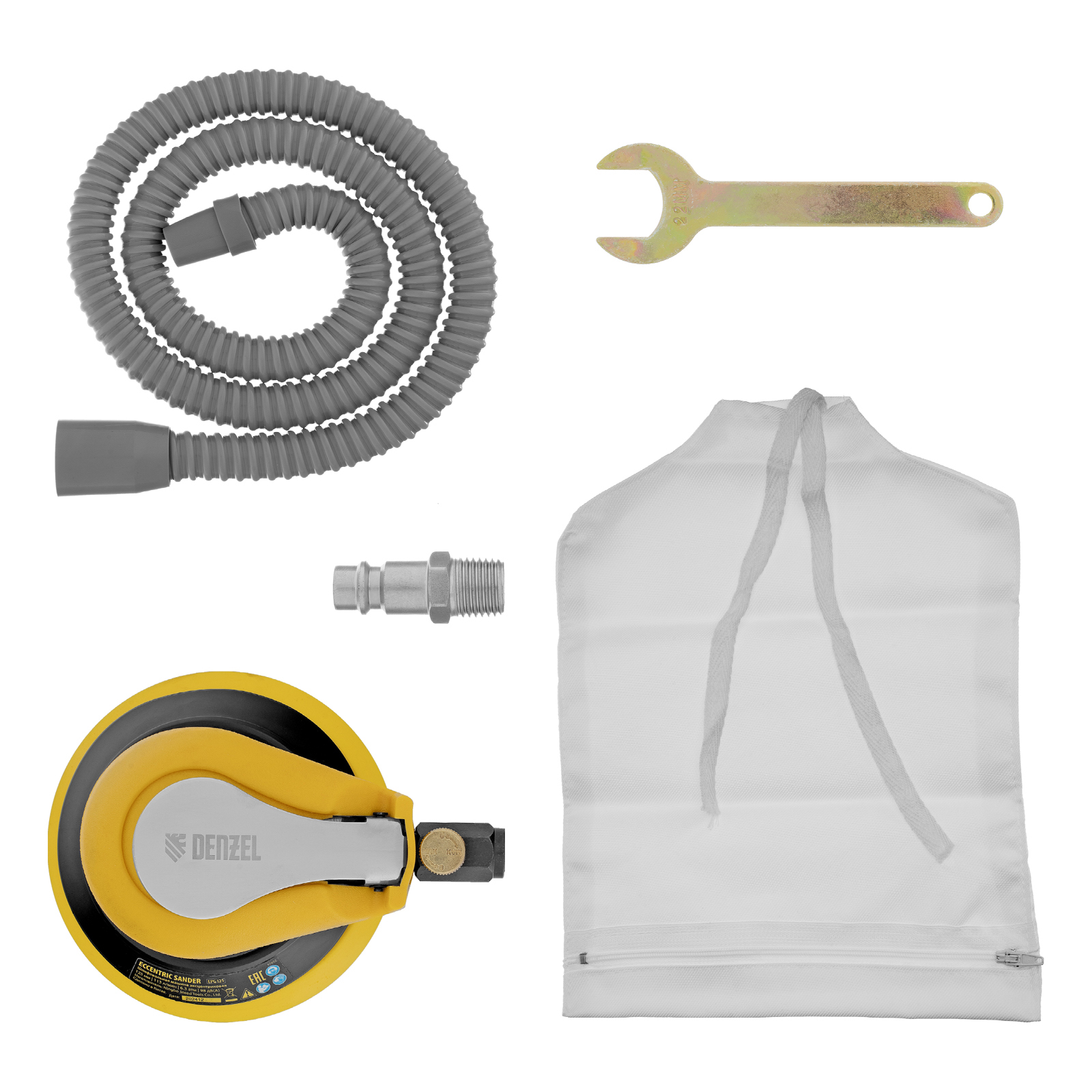 Эксцентриковая шлифмашина позволяет легко выровнять поверхность древесины, металла или пластика. Во время эксплуатации важно не забывать о добавлении специального масла ISO 46, которое можно наносить непосредственно на входной штуцер или использовать с блоком подготовки воздуха Denzel 57469, оснащенным лубрикатором для автоматического расхода масла.