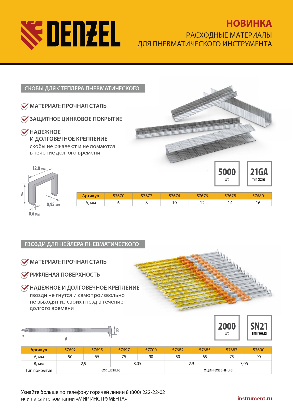 Скобы 21GA Denzel 57670 шириной 12,8 мм, 5000 шт. в упаковке, предназначены для пневматического степлера, совместимого с крепежом размером 6 х 0,95 х 0,6 мм. Используются для крепления листовых материалов к деревянному основанию, подходят для обивки мебели, укладки напольного покрытия, фиксации утеплителя.