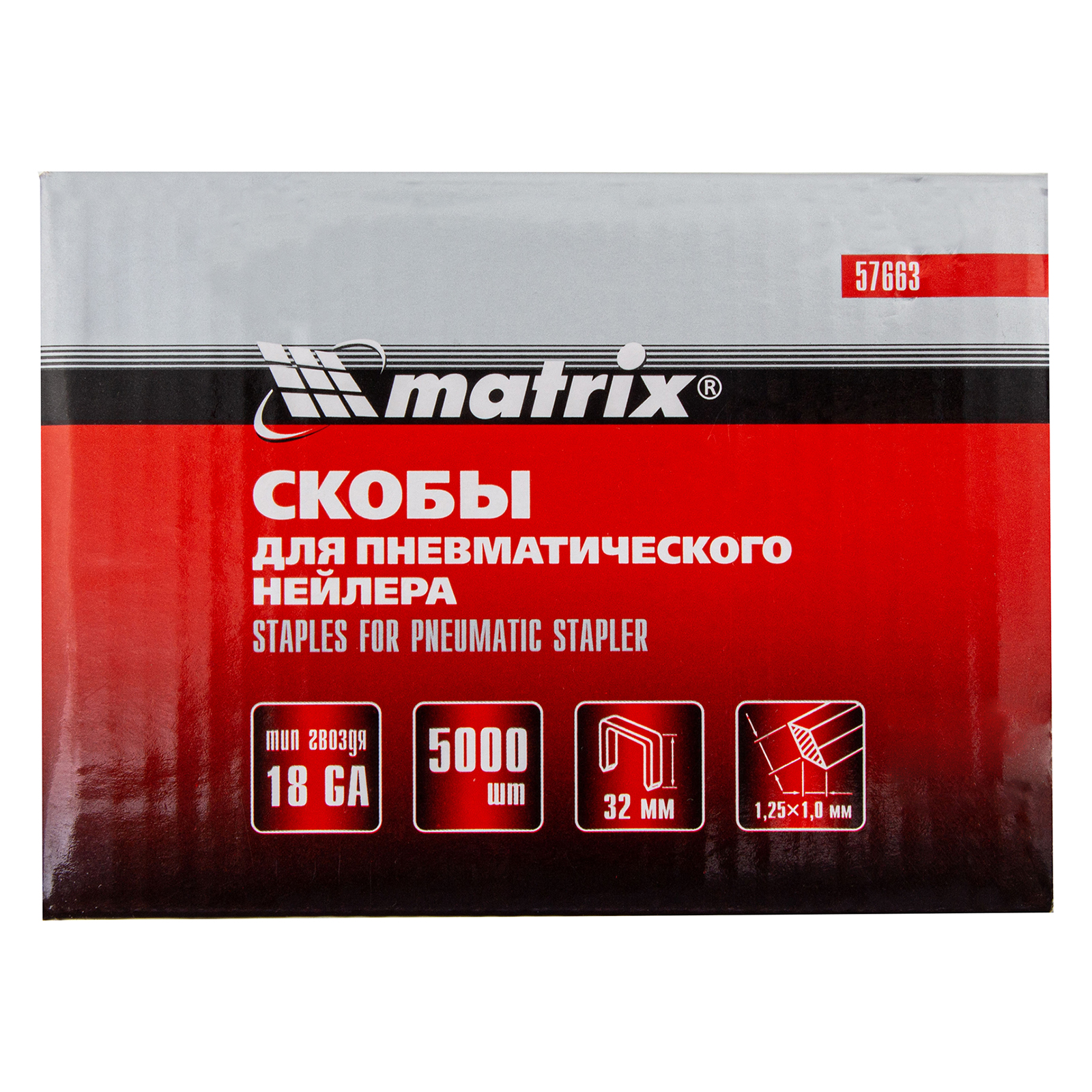 Скобы Matrix 57663 типа 18GA, 5000 шт. в упаковке, подходят к пневматическим степлерам, совместимым с крепежом сечением 1,25 х 1 мм, длиной 32 и шириной 5,7 мм. Они используются для монтажа обивочных и утеплительных материалов, крепления кабелей и плинтусов к деревянным поверхностям.