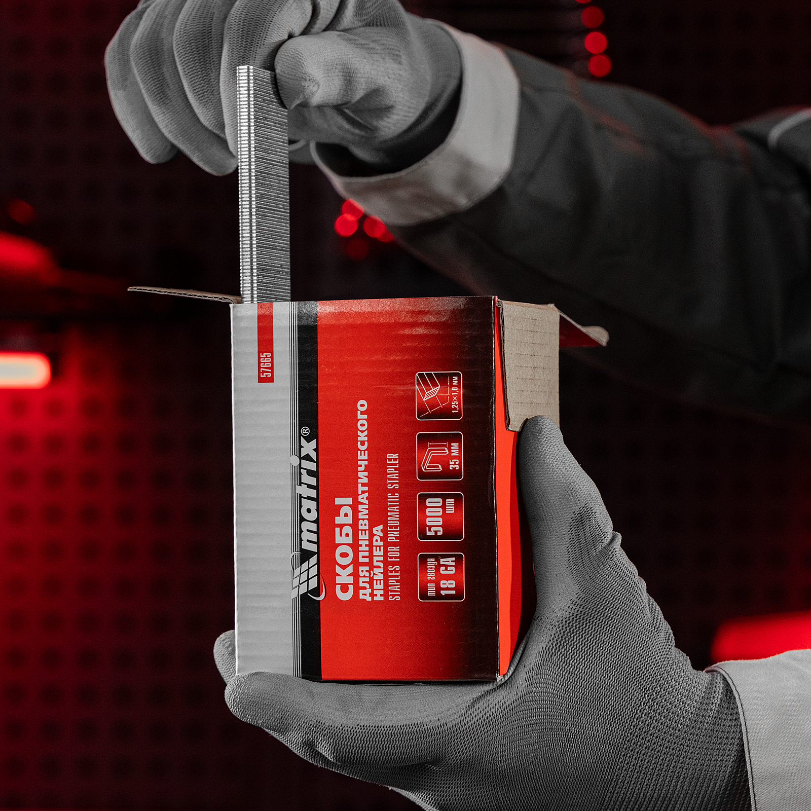 Скобы Matrix 57665 типа 18GA, 5000 шт. в упаковке, предназначены для установки в пневматический степлер, совместимый с крепежами длиной 35, шириной 5,7 мм и сечением 1,25 х 1,0 мм. Применяются для крепления обивочных материалов, кабелей, плинтусов и утеплителей к деревянным поверхностям.