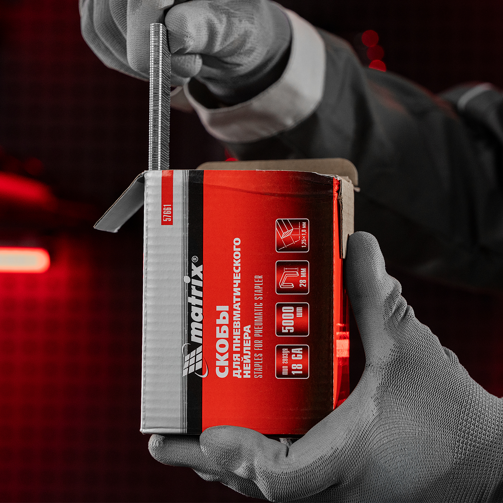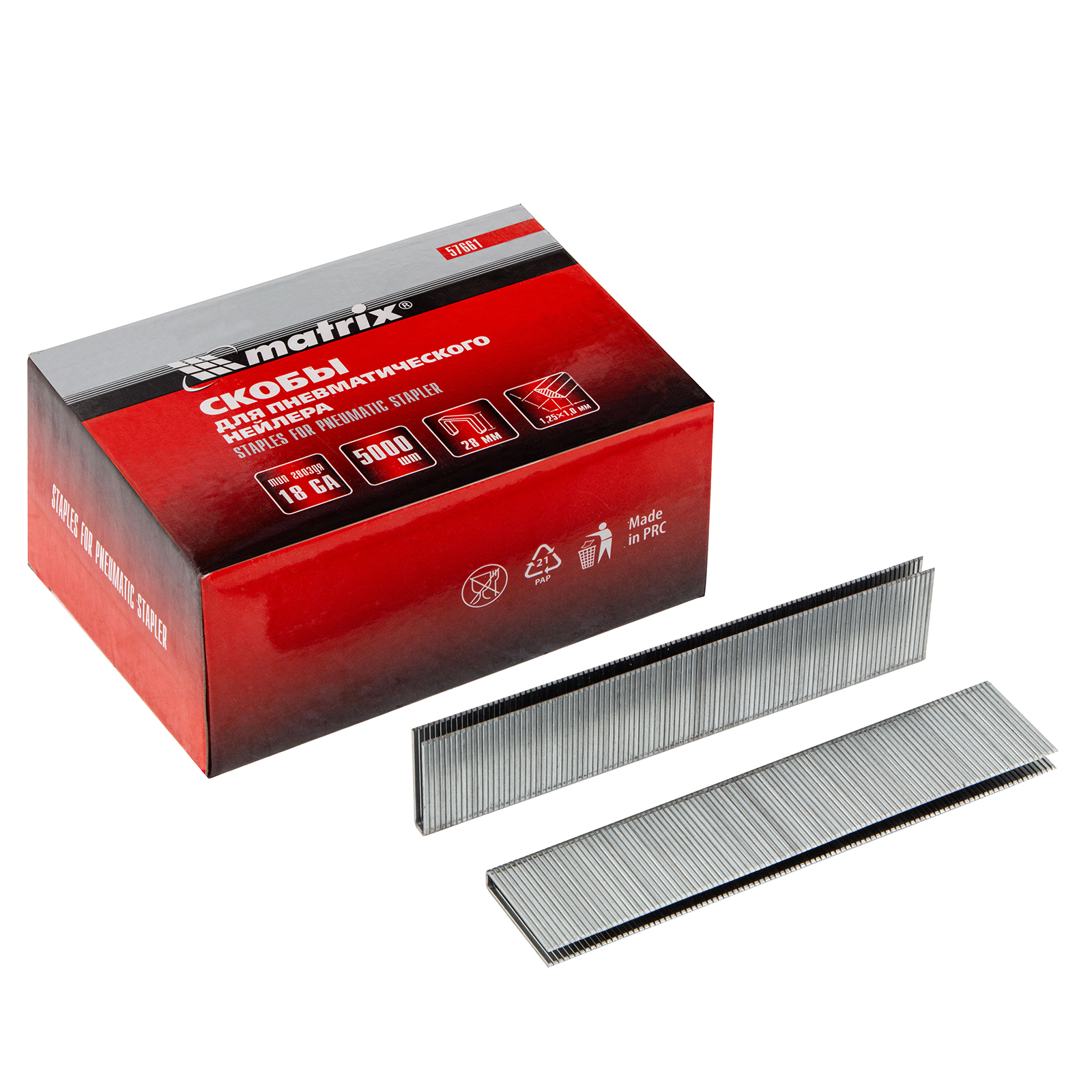 Скобы Matrix 57661 типа 18GA, 5000 шт. в упаковке, сечением 1,25 х 1 мм, длиной 28 и шириной 5,7 мм, — расходные материалы для пневматического степлера. Они позволяют закрепить пластиковые или деревянные детали на бетонных, кирпичных и деревянных поверхностях. Используются во время строительных и ремонтных работ.