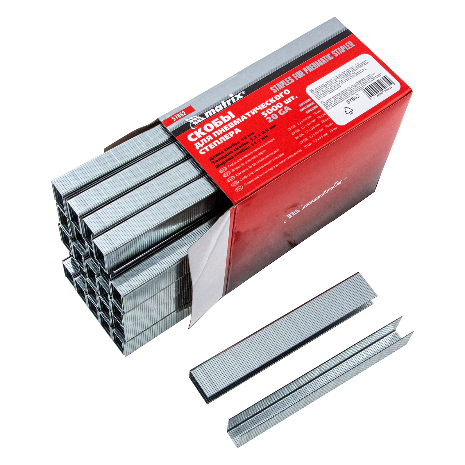 Скобы Matrix 57662 типа 20GA, 5000 шт. в упаковке, совместимы с пневматическими степлерами, работающими с крепежами размером длиной 19 мм, шириной 11,2 мм и сечением 1,2 х 0,6 мм. Они используются для крепления обивочных материалов, кабелей, плинтусов, утеплителей к деревянным поверхностям.