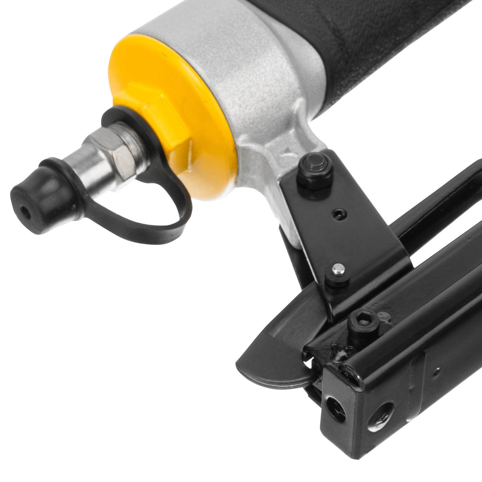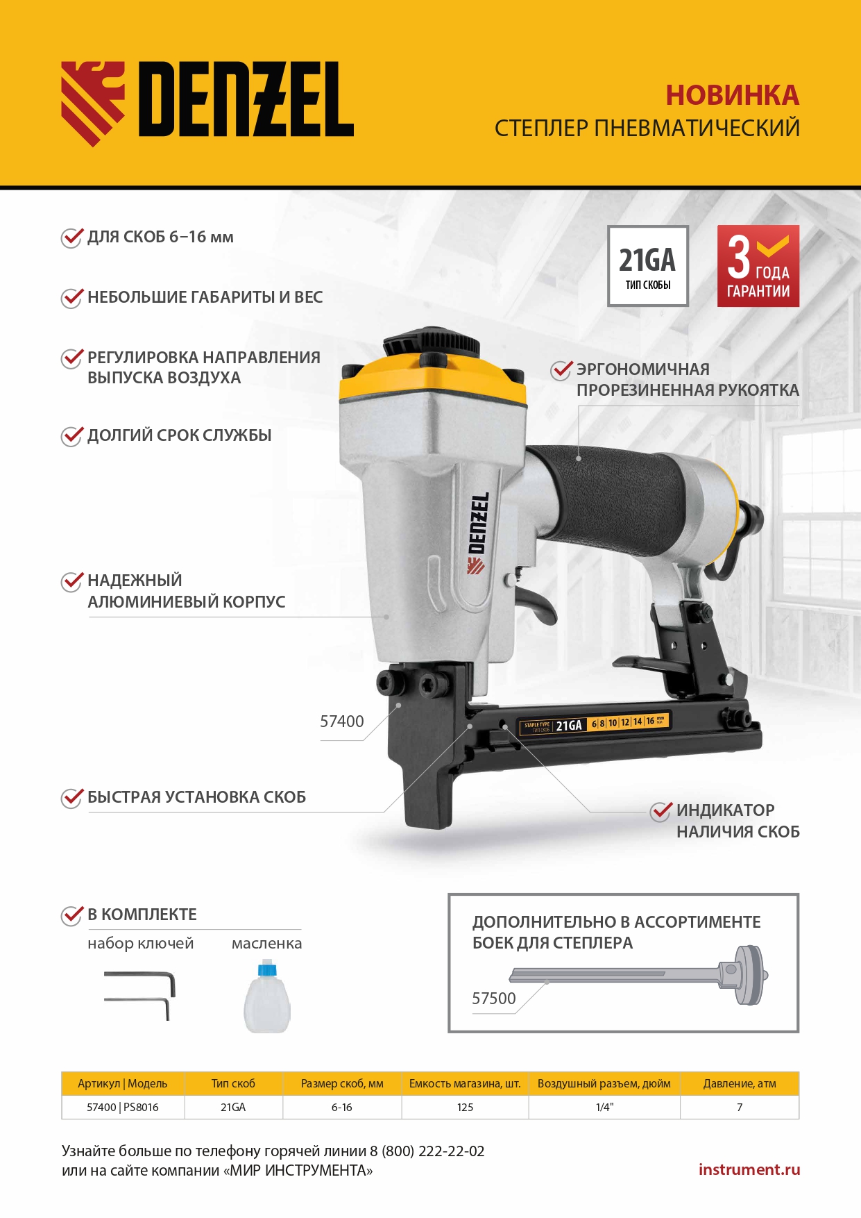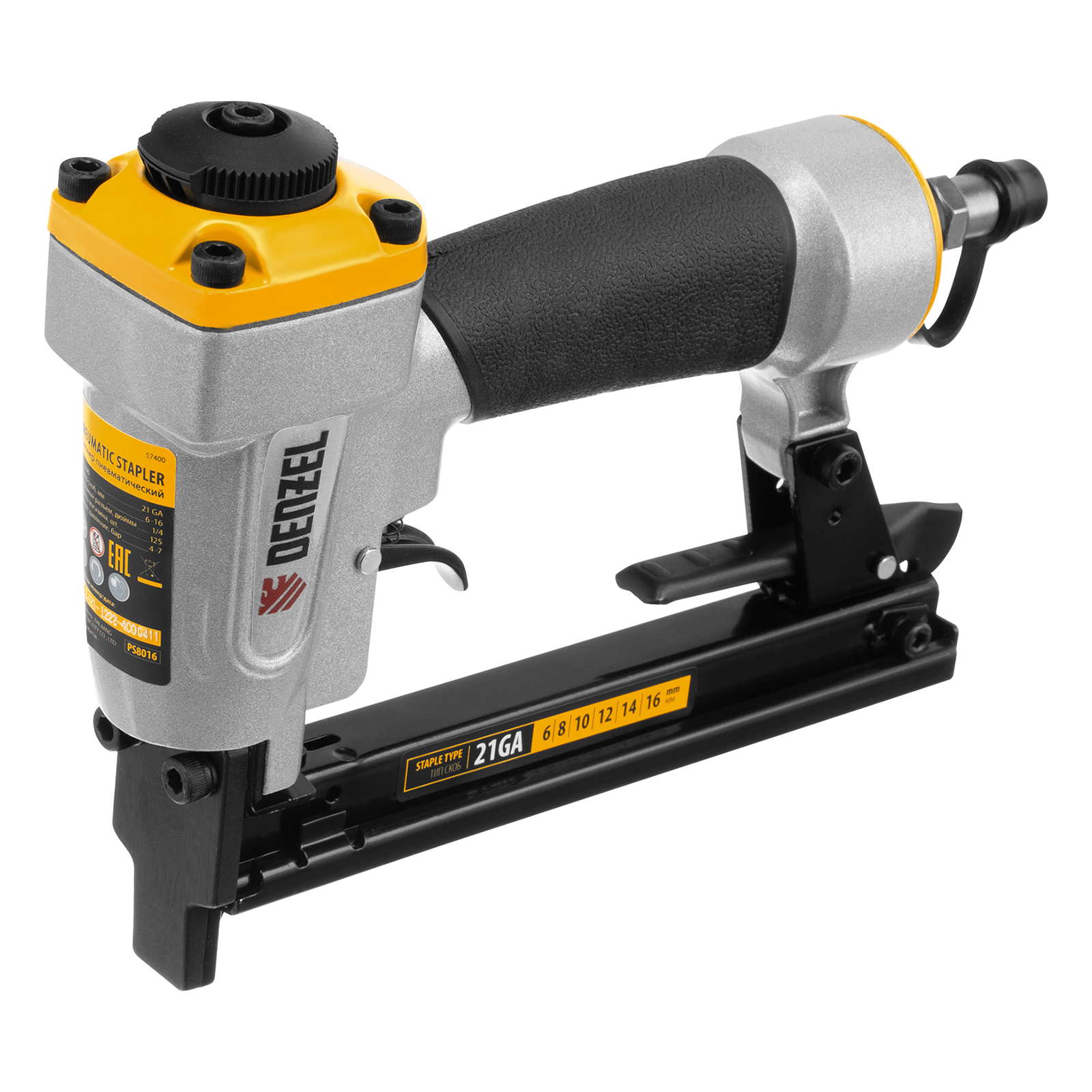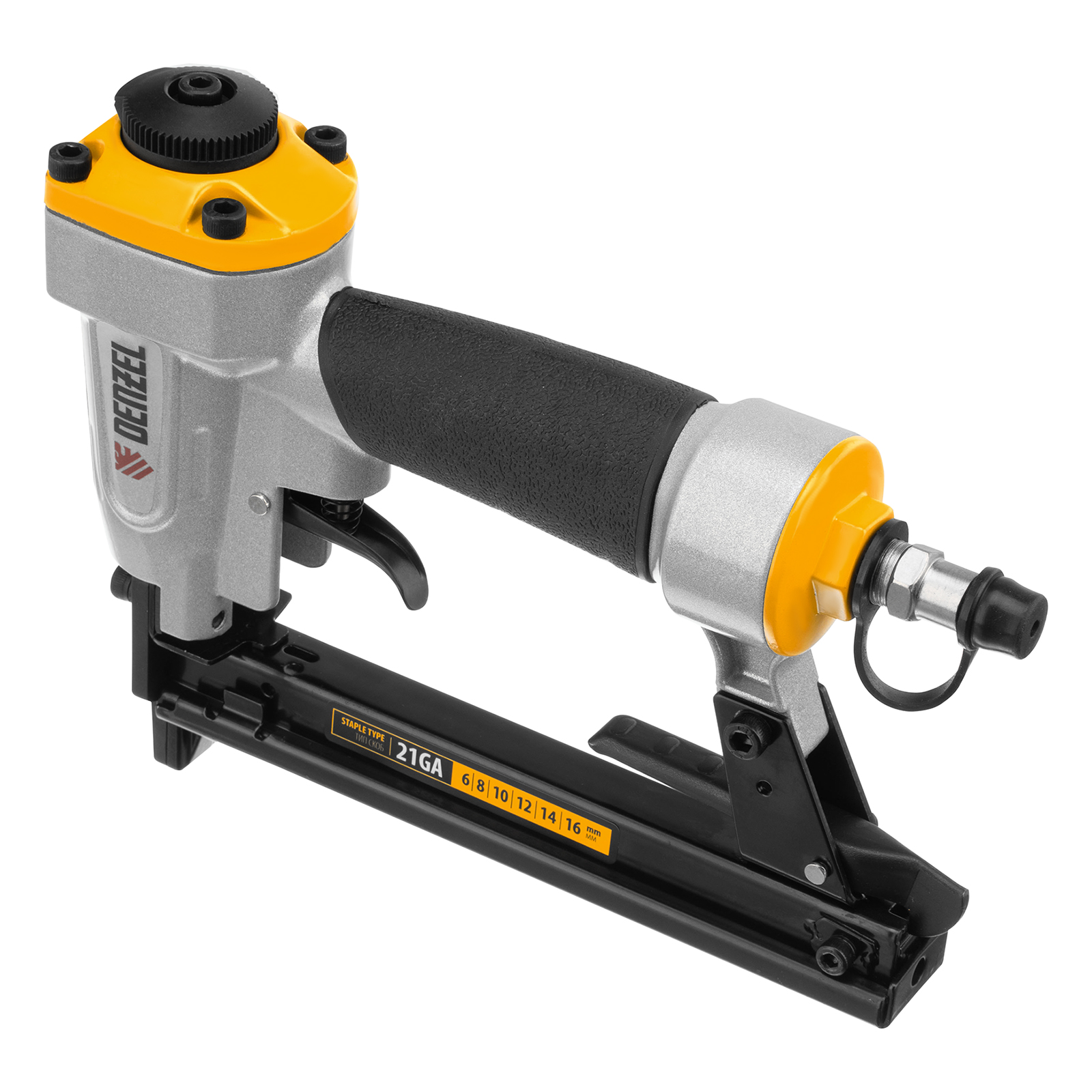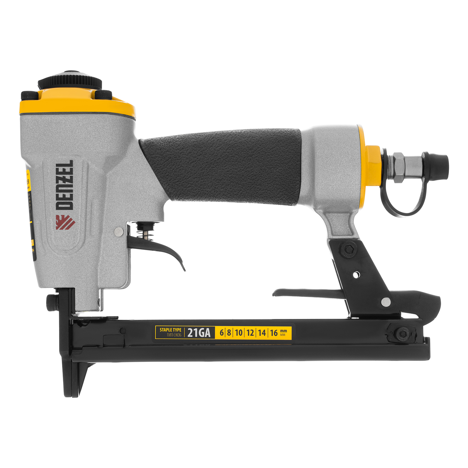 Пневматический степлер Denzel PS8016 57400 предназначен для крепления к основанию листовых материалов при помощи прямоугольных скоб 21GA размером 6-16 мм. Подходит для закрепления фанеры, оргалита, ДСП, обивочной ткани. Незаменим во время отделочных работ и производства мебели.