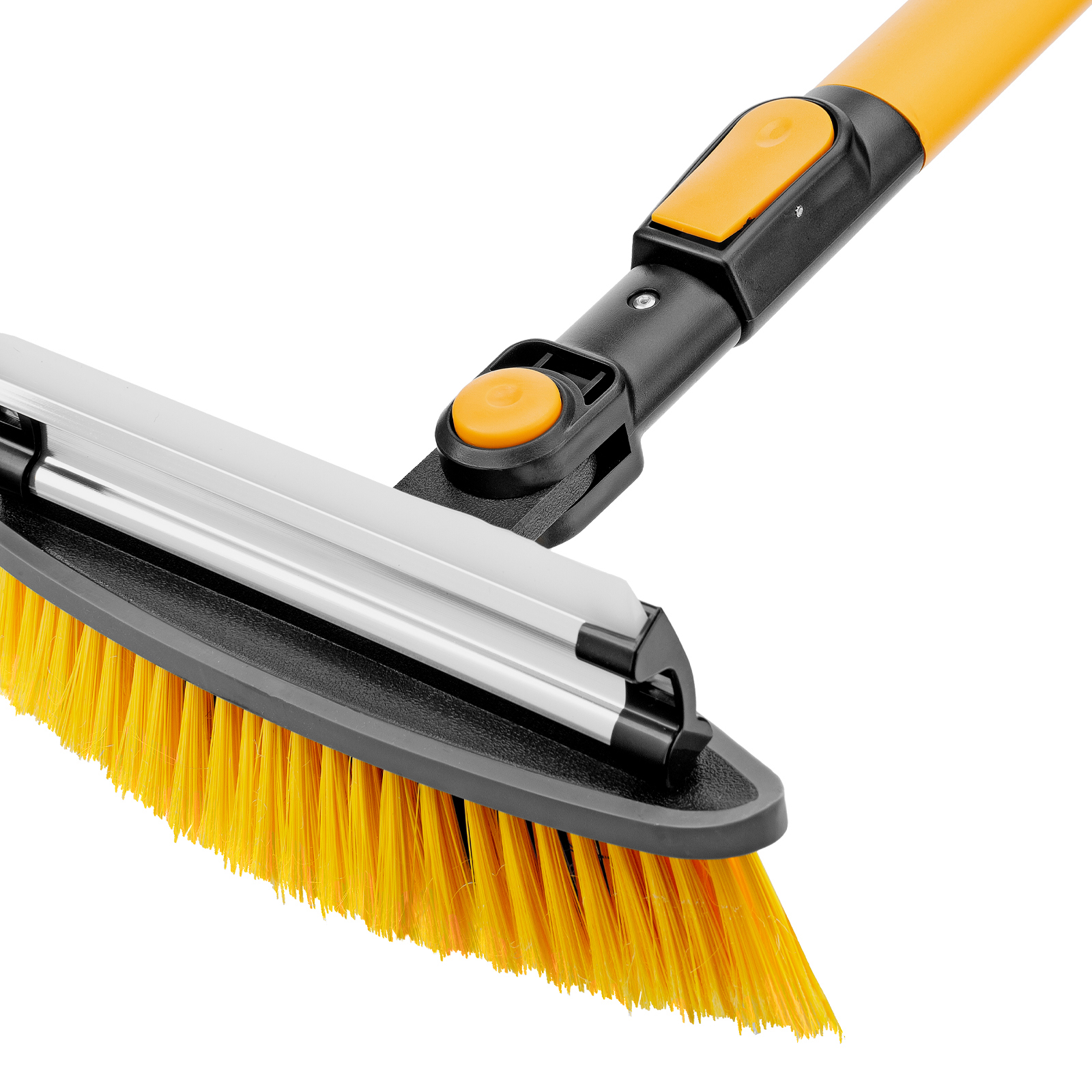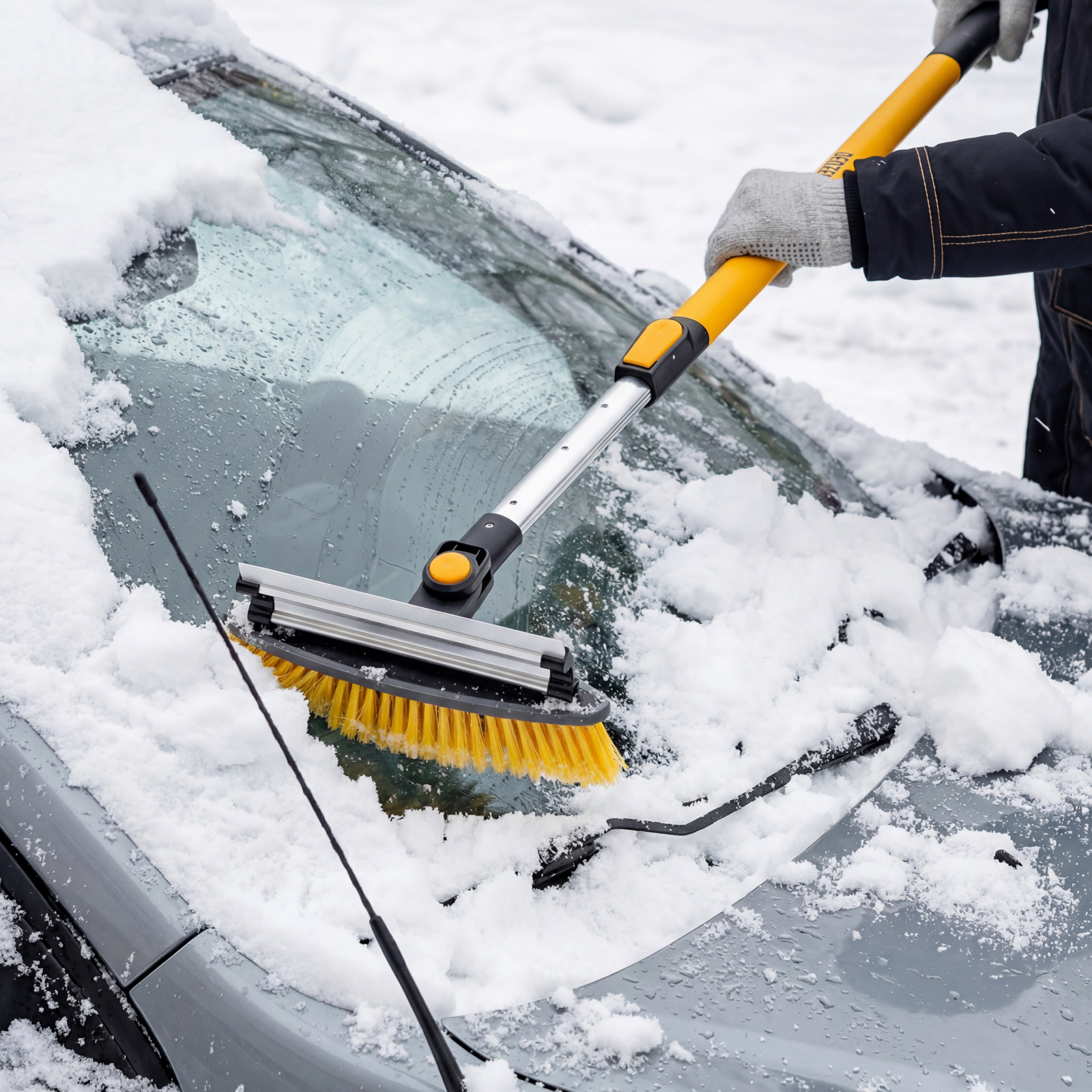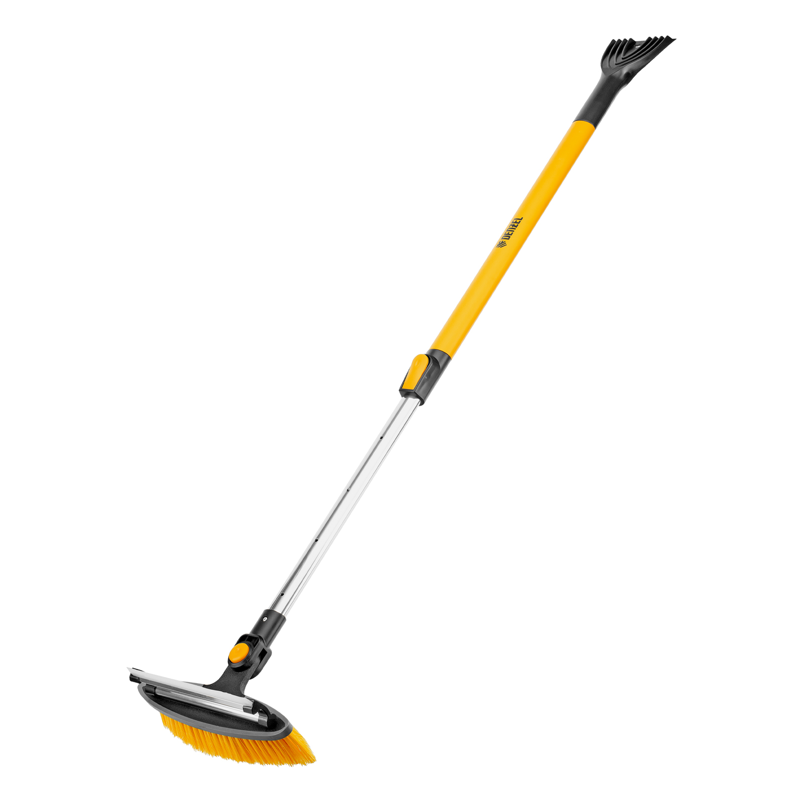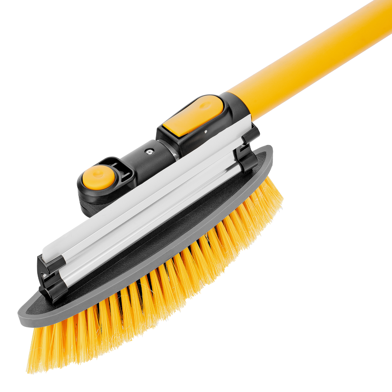 - Регулировка длины — рукоятка выдвигается и фиксируется на длине 95-132 см, за счет чего можно без труда очистить крышу транспортного средства.