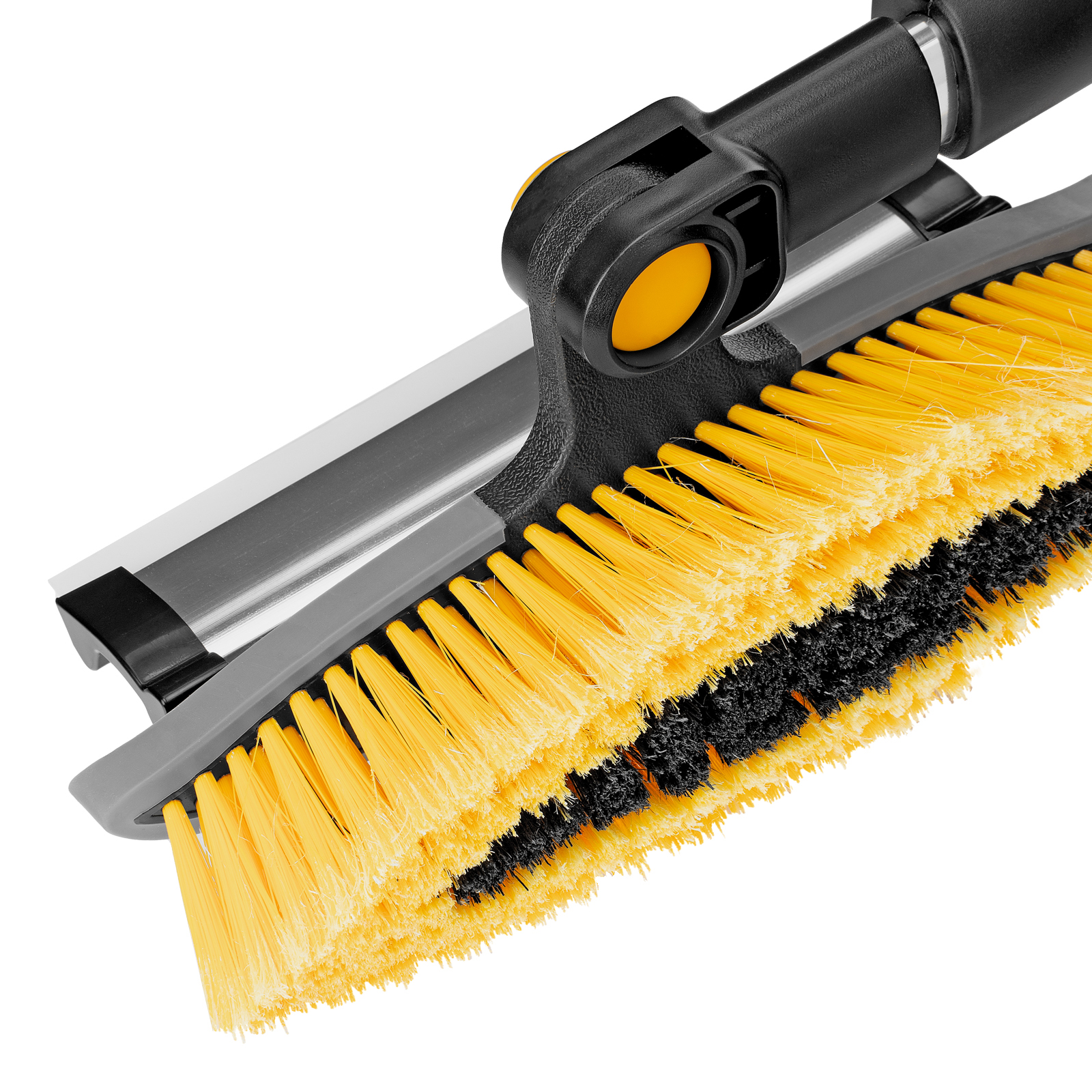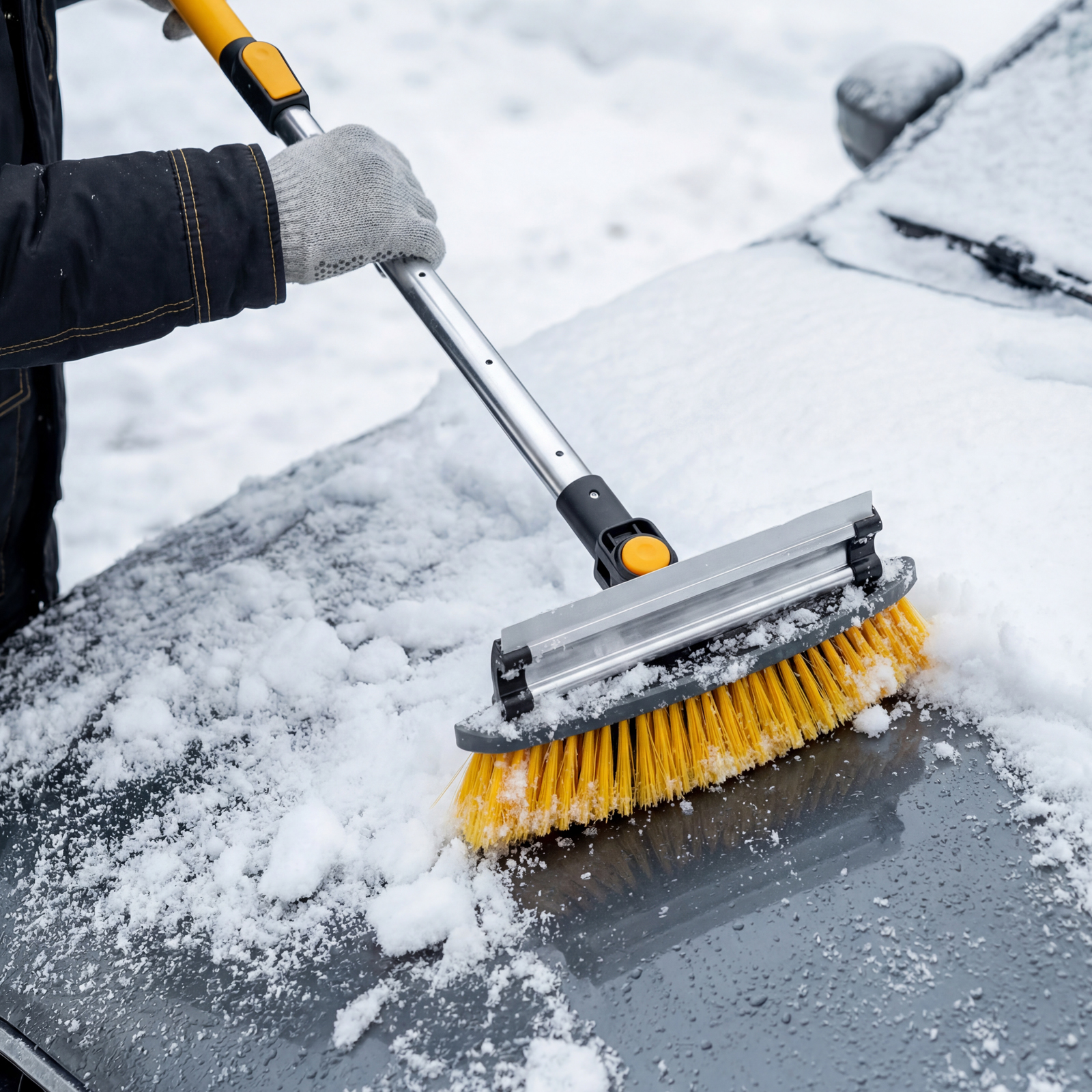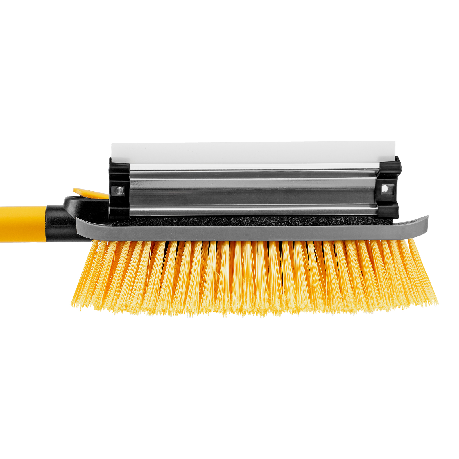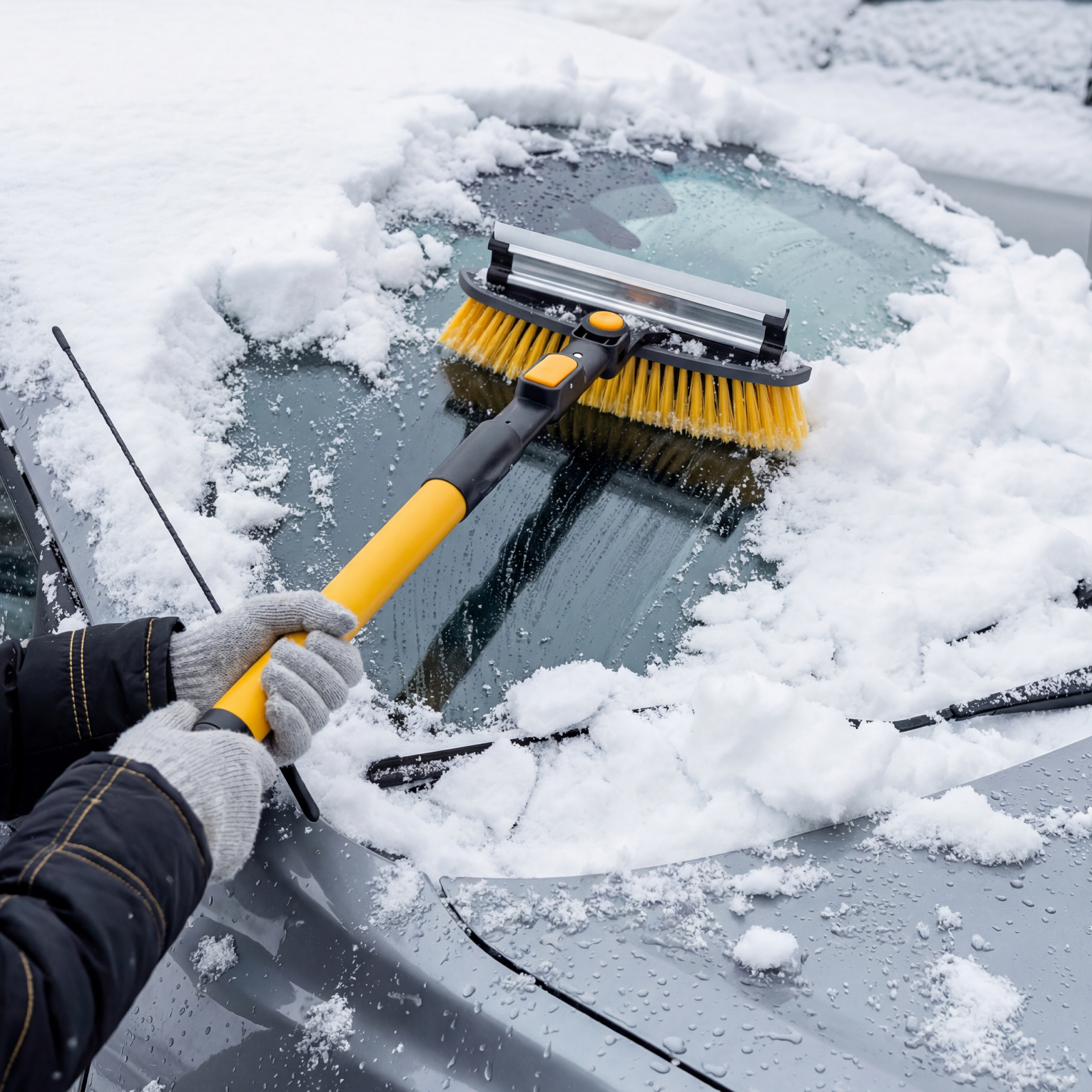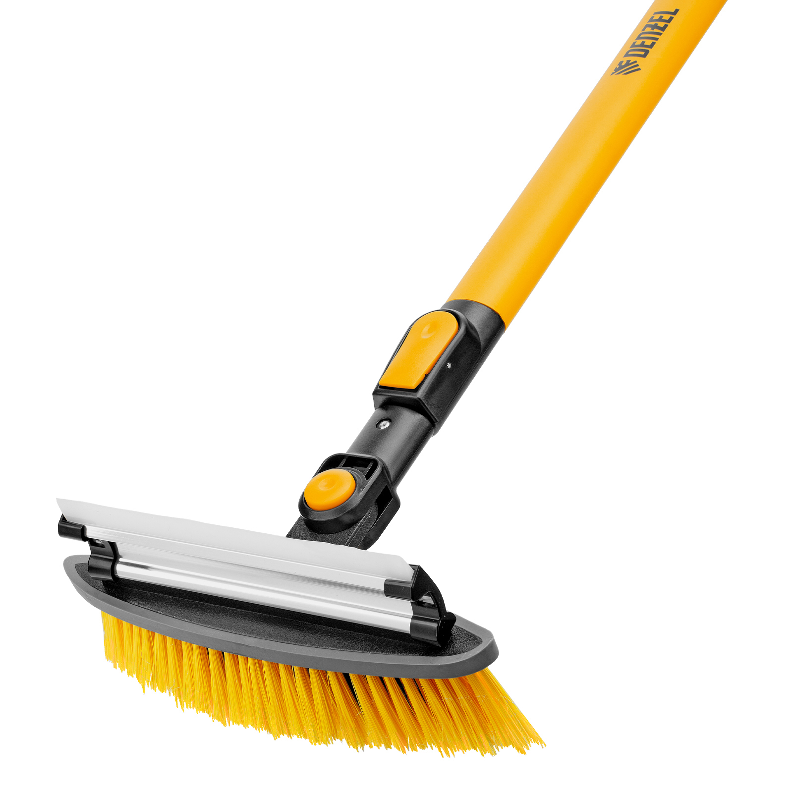 - Регулировка длины — рукоятка выдвигается и фиксируется на длине 95-132 см, за счет чего можно без труда очистить крышу транспортного средства.