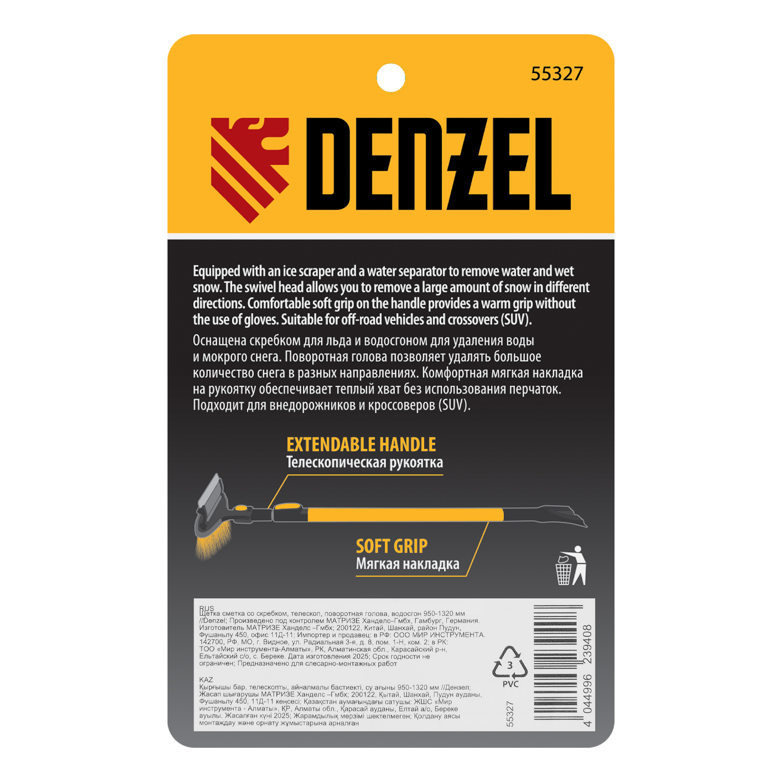 Щетка-сметка Denzel 55327 со скребком, поворотной головой, водосгоном и телескопической рукояткой длиной 95-132 см предназначена для быстрой и эффективной очистки кузова автомобиля от снега и наледи. Ее использование позволяет сохранить лакокрасочное покрытие автомобиля в хорошем состоянии, а также обеспечивает безопасность водителя и других участников дорожного движения. Подходит для внедорожников и кроссоверов.