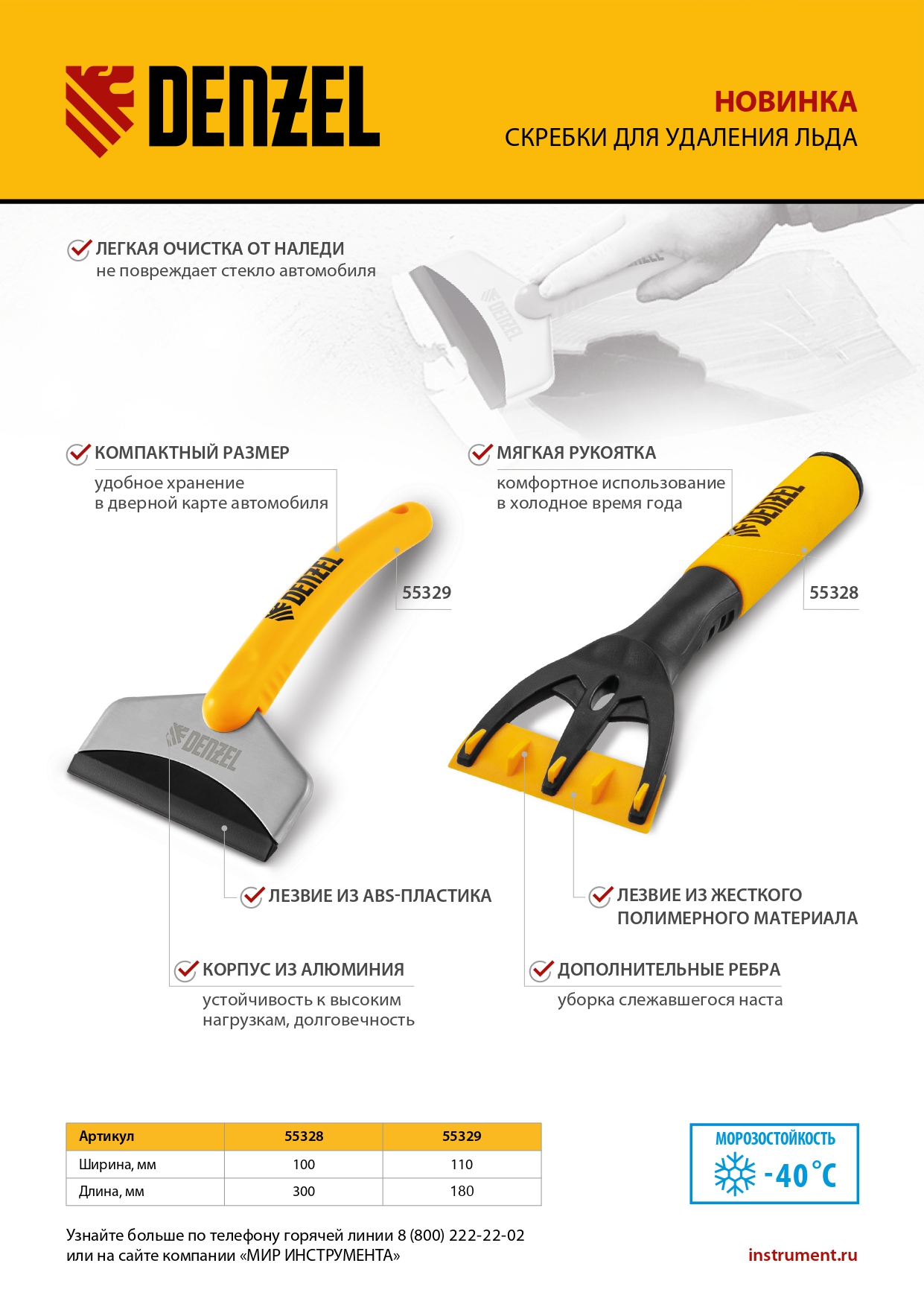 Усиленный скребок для удаления льда Denzel 55329 применяется для очищения зеркал и стекол автомобиля от налипшего и примерзшего снега. За счет небольшого размера 18 х 11 см скребок удобно хранить в салоне автомобиля.