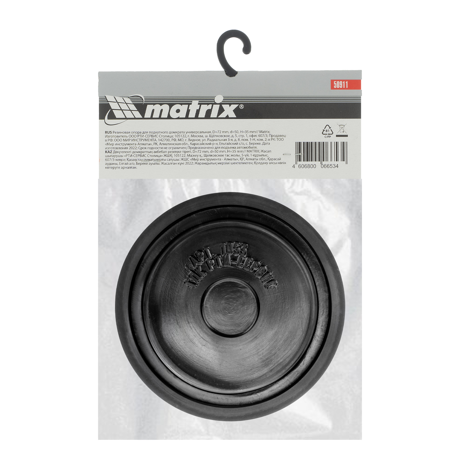 Универсальная резиновая опора Matrix 50911 с верхним диаметром 72 мм и нижним диаметром 50 мм, толщиной 35 мм, предохраняет кузов авто при поднятии на подкатном домкрате. Также защищает само подъемное устройство от механических повреждений. С ее помощью можно осуществить качественный ремонт транспортного средства в гараже или автосервисе. Подходит к большому количеству домкратов: 51018, 51019, 51127, 51129, 51130, 510335, 510345.
