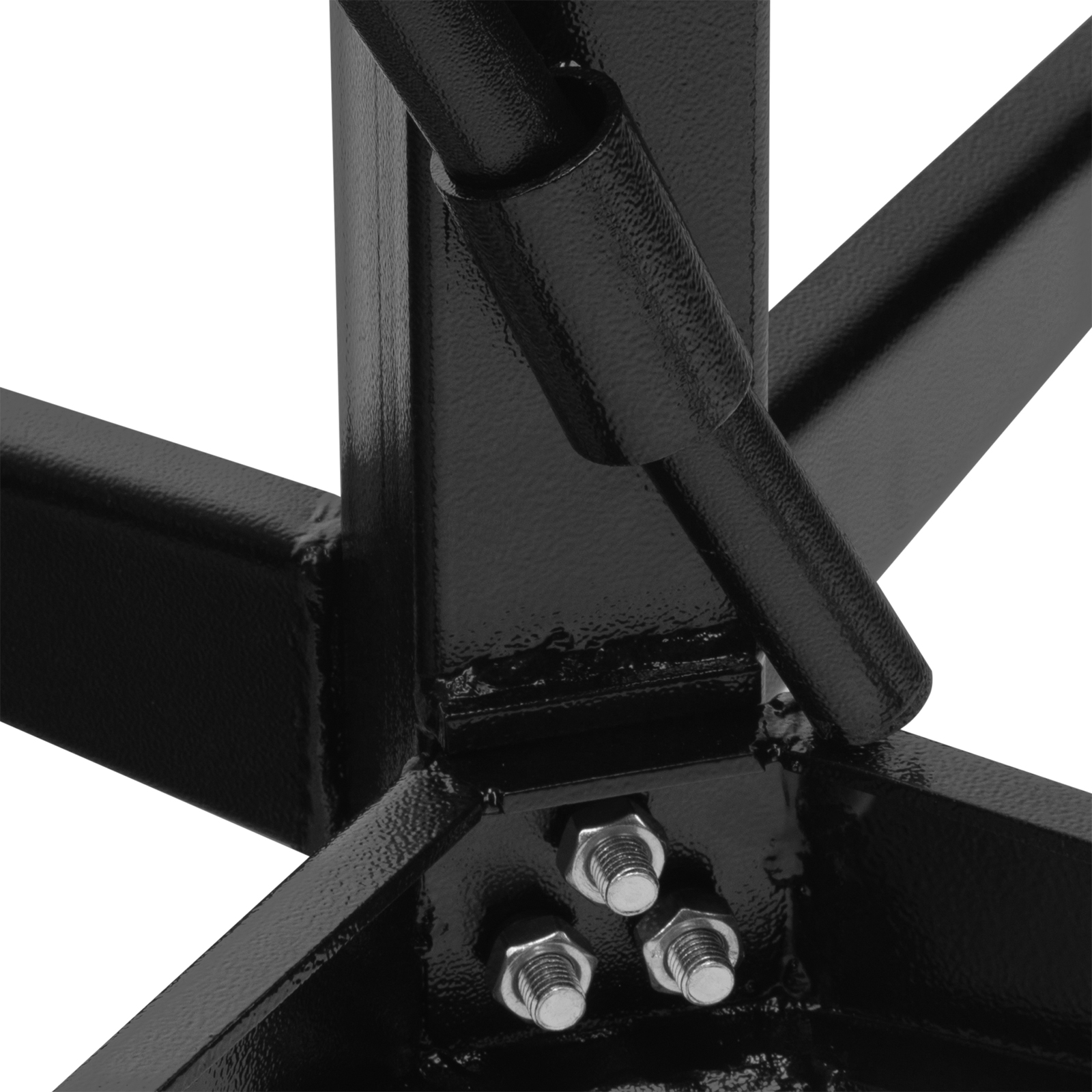 - Продуманная конструкция — колеса позволяют перемещать стойку по рабочей площадке, а стопорные педали — фиксировать ее на одном месте.